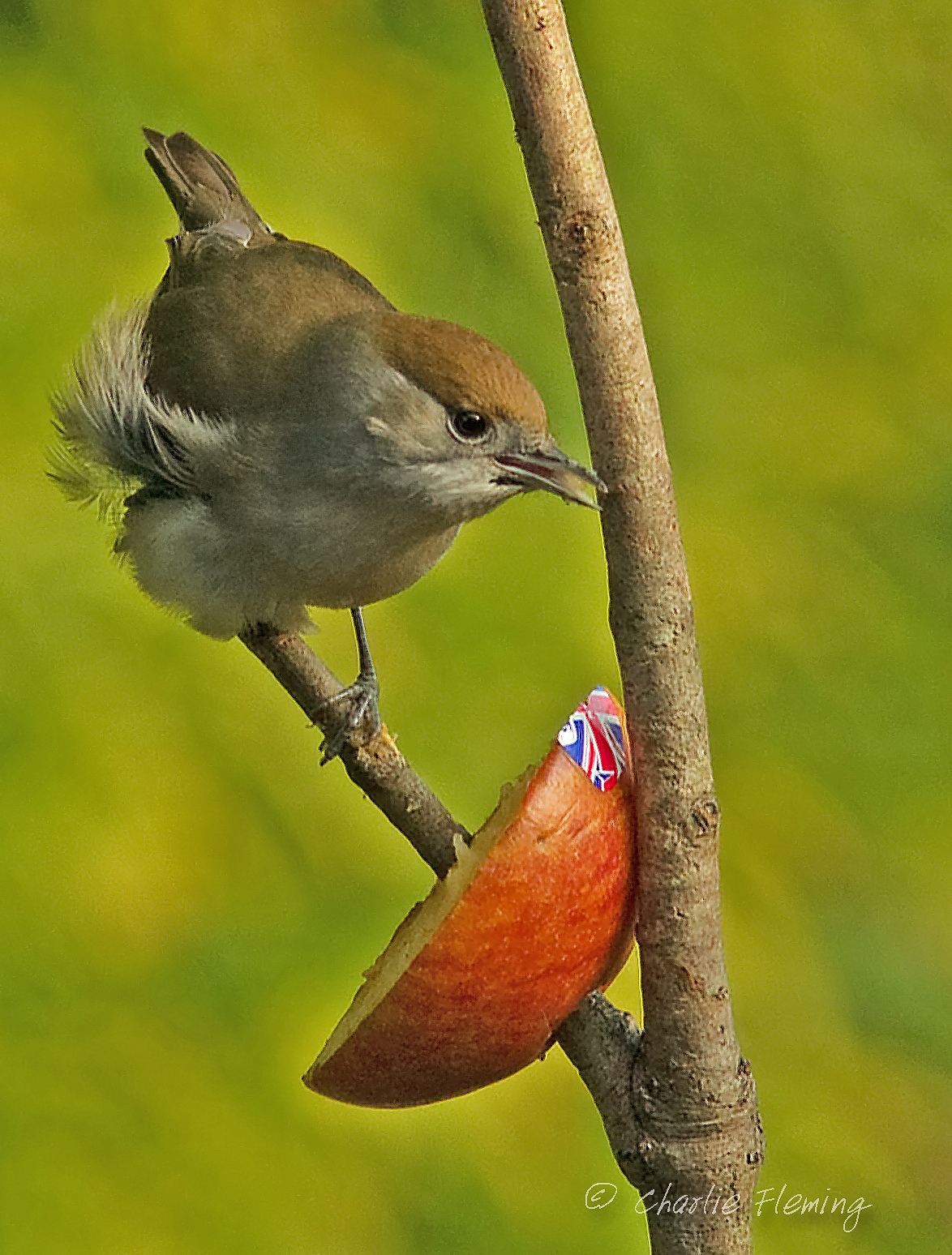 I really like this photo even though it is a bit "noisy" due to the use of a high ISO, then when it was lightened because it was under -exposed the noise became more noticeable as it often is. Anyway, the picture has a bit of personality. I particularly like the Union Jack Logo on the apple's label and the fact that the Blackcap was hatched in Germany. The apple came from the German food store, Lidls makes it humorous, (to me at least)!