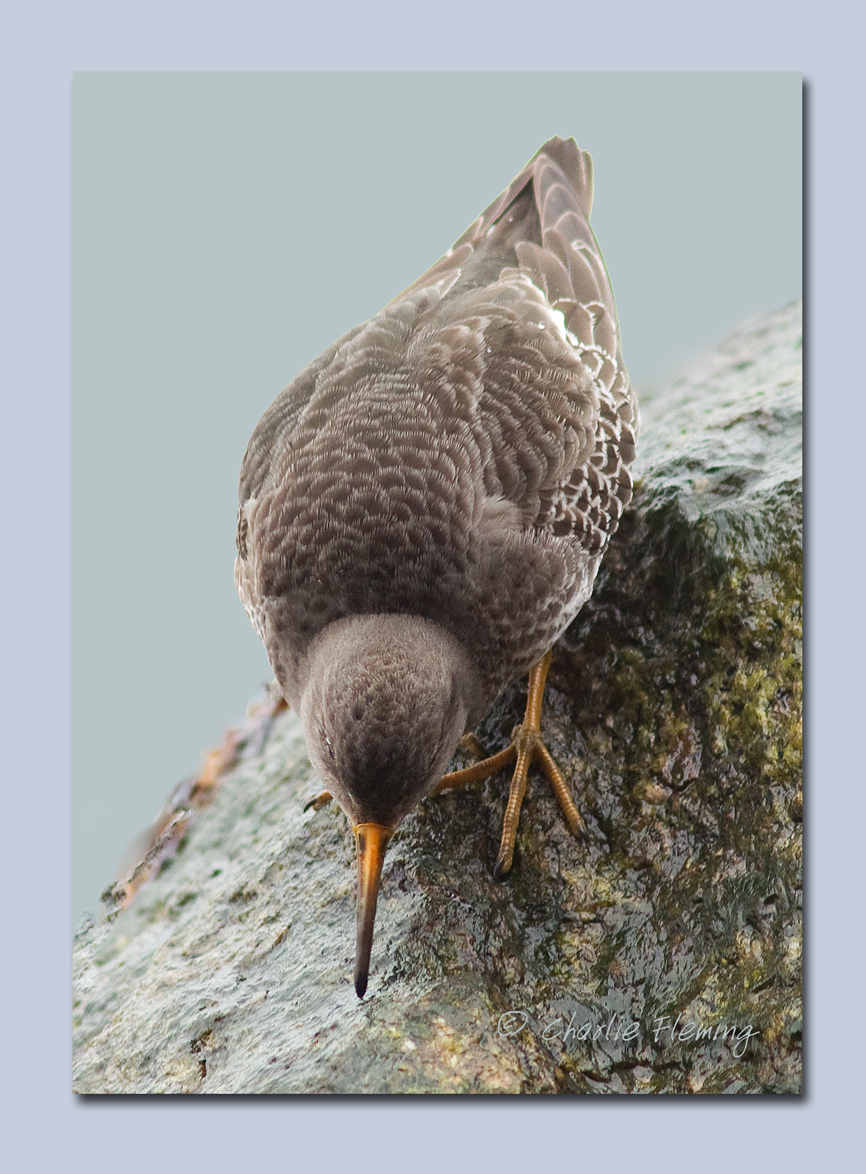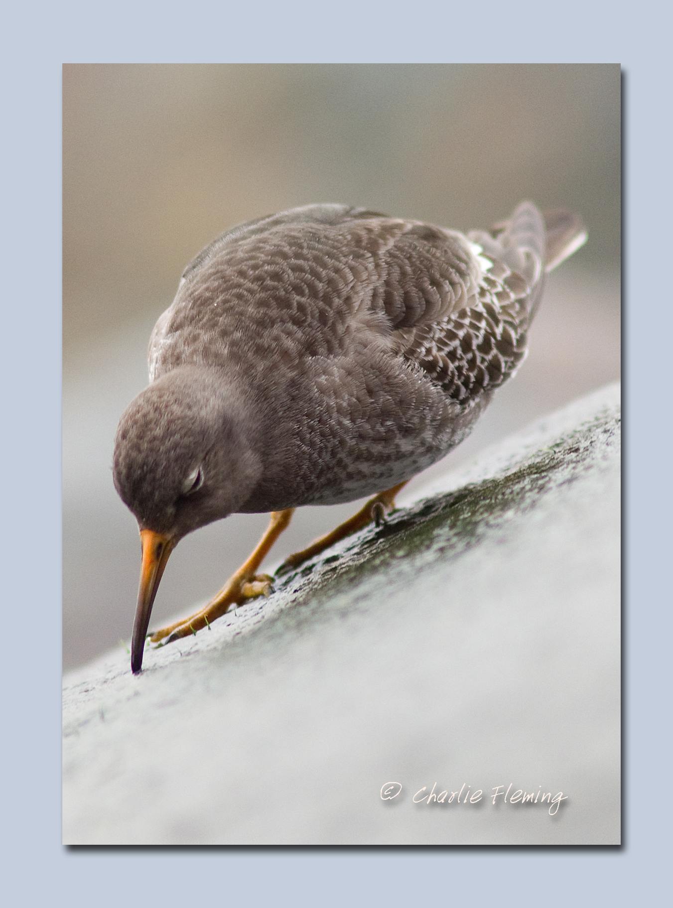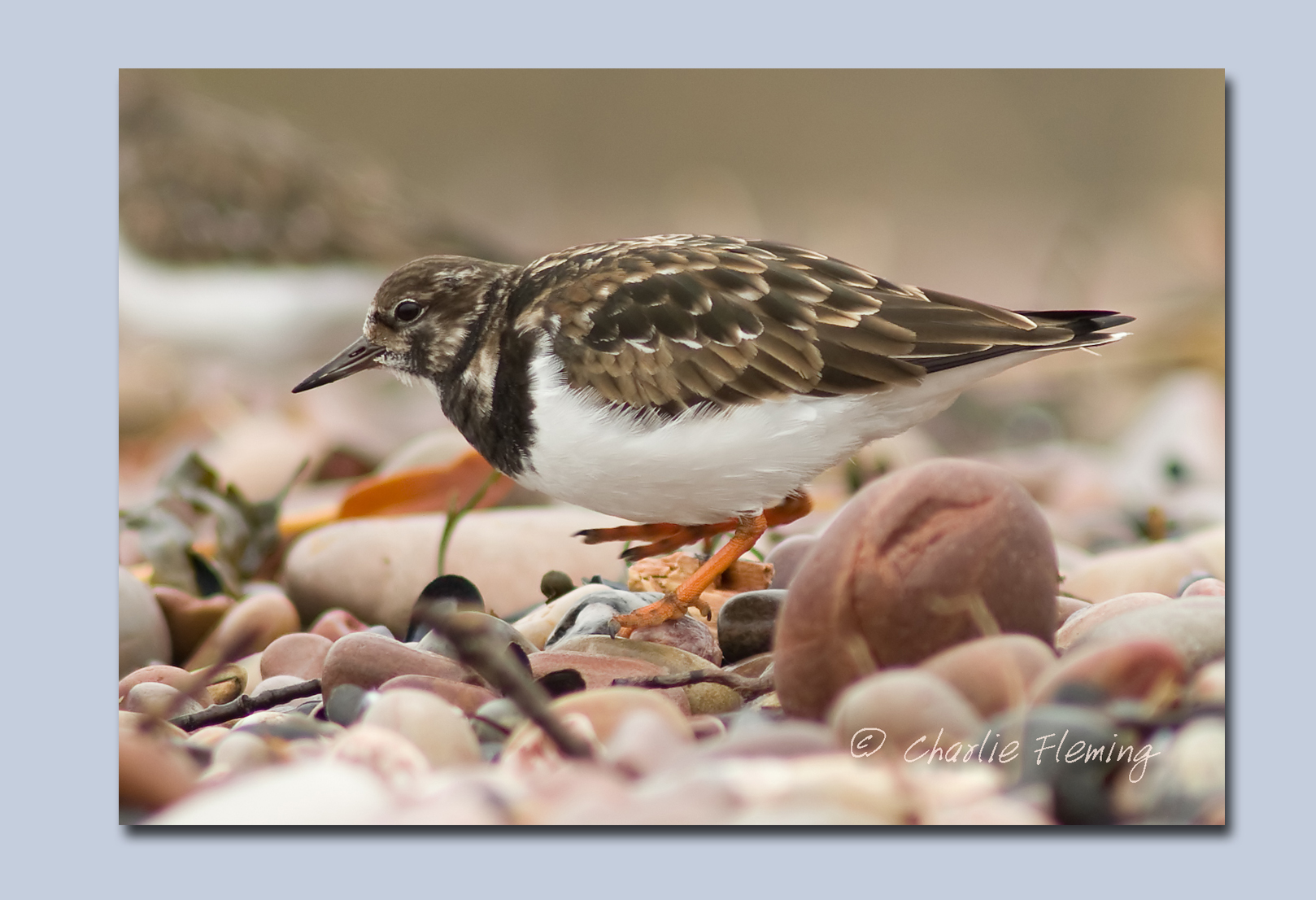 This is a Purple Sandpiper (Calidris maritima). This is not a bird that can be seen at the “drop of a hat” but there are a few places in Devon where you can be almost sure of seeing one or two. They prefer to spend the winter on rocky shorelines, somewhere that is going to get a pounding wave sooner or later. As I photographed this one today…… there were 5 others by the way……. I could see that it was keeping a close eye on the crashing waves and right at the last moment it would jump clear. They were feeding on slimy green seaweed that was being exposed on the rocks as the tide went out. This in it’s self is interesting because in the past, I have seen them feeding on mussels and shellfish. They seem to favour the company of Ruddy Turnstones (Arenaria interpres) and today there was a dozen or so of them, dodging the waves in the same way but not feeding on the weed as far as I could see. This is a Turnstone.