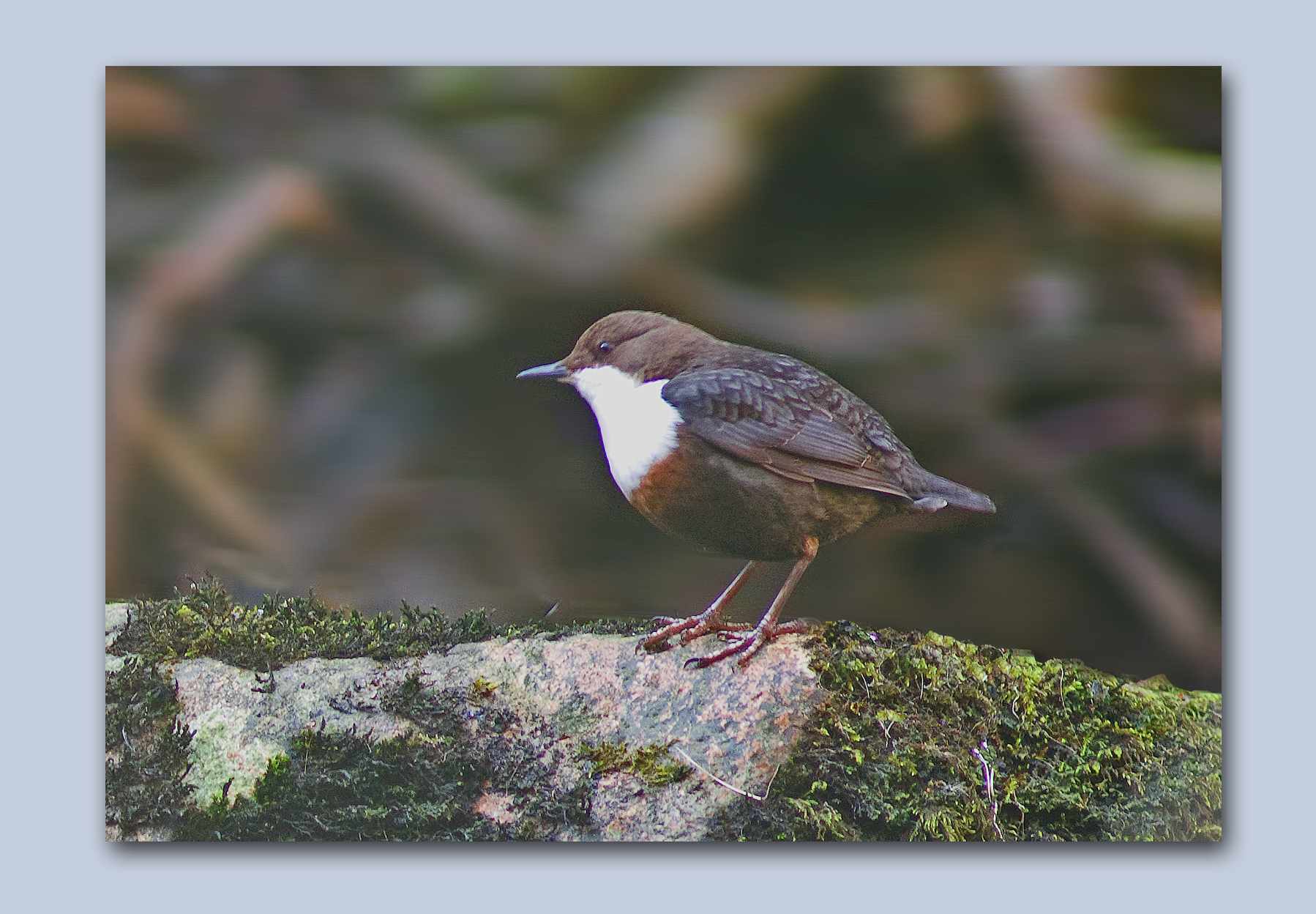 After a weekend away in Yorkshire I returned back to Devon on Sunday night and on Monday with glorious spring-like weather I went back to the river to resume my Dipper observations and study. I took a new "bag-hide" cover that I wanted to try out and it immediately allowed me to get close to a pair of Dipper that were working in the usual place. Not being completely used to the new hide, when the Dipper perched right in front of me, I banged off loads of shots but hadn't realised that the material of the hide was obscuring part of the lens……… can you believe that for bad luck. The Dipper was posing perfectly and I blew the opportunity! A bit of manipulation when I got home to the computer, resurrected one of the shots, but a disappointment never the less. At one point he was quite close to me working in the shallows and in some really nice light. I took a shot of him crossing the river by swimming along with his head just above the water.