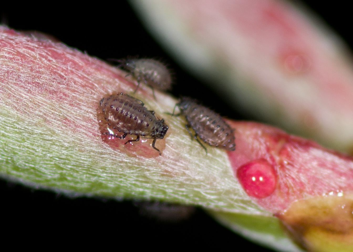 I was quite excited this morning because I had purchased a Ring Flash for use with my Macro lens. This is something I have wanted to buy for a while and eventually I splashed out and took the plunge. As it happened the day dawned as the dimmest and wettest for a few weeks. The flash arrived by post quite early and I quickly went in to the garden to give it a work out. It looks promising and I took a few interesting photos. I searched around in the dull conditions, the butterflies, hovers and bees were keeping a low profile in the dull wet conditions. I discovered some little aphids on the leaves of an “acer” in the garden and quickly put the ring flash through it’s paces. I took photos of, what turned out to be Periphyllus sp., the Maple aphid.
