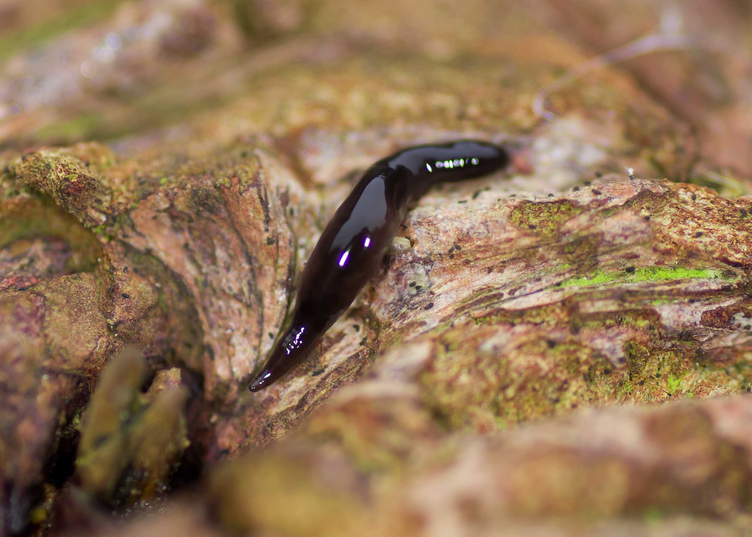 I kept looking and turned over a piece of bark from a rotting tree stump and saw a little worm-like creature. It was small, only around 7 mm long and shiny black. It was a small leech. Quite asurprise, again a garden first. I hadn’t realised that leeches can be found away from water like this. I have had it identified as a juvenile Horse leech. This is not a blood sucking leech. It feeds on earth worms and other tiny invertebrates.