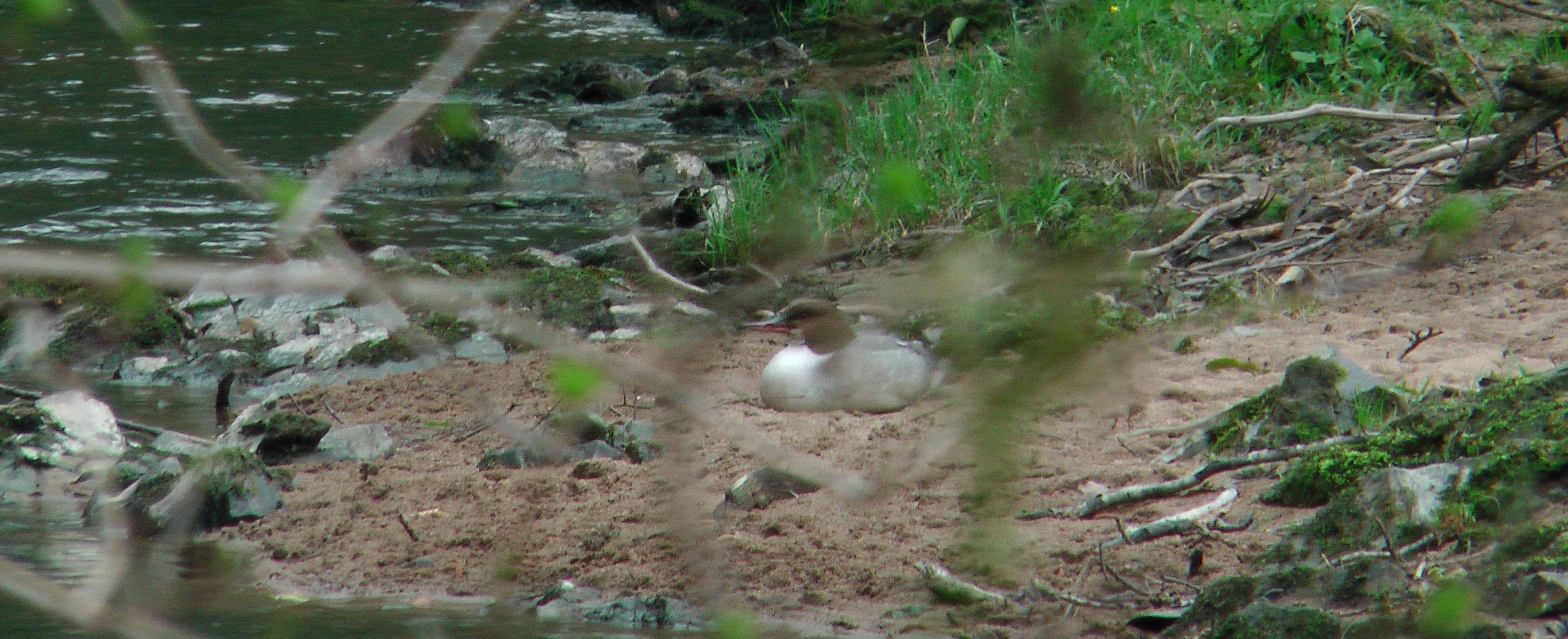 I went out to the river equipped with just a video camera and the Tamron 90mm macro lens. My usual 300mm lens was at home! Image my feelings of frustration when, on my walk back to come home, there was one of the female Goosanders sat resting on the bank. An amazing photo opportunity, I couldn't believe it. I have been out to the river more than 20 times recently and have never had such a close encounter with one of the wintering Goosanders and I couldn't make the best of it. I took a few still shots with the video camera, just for the record.