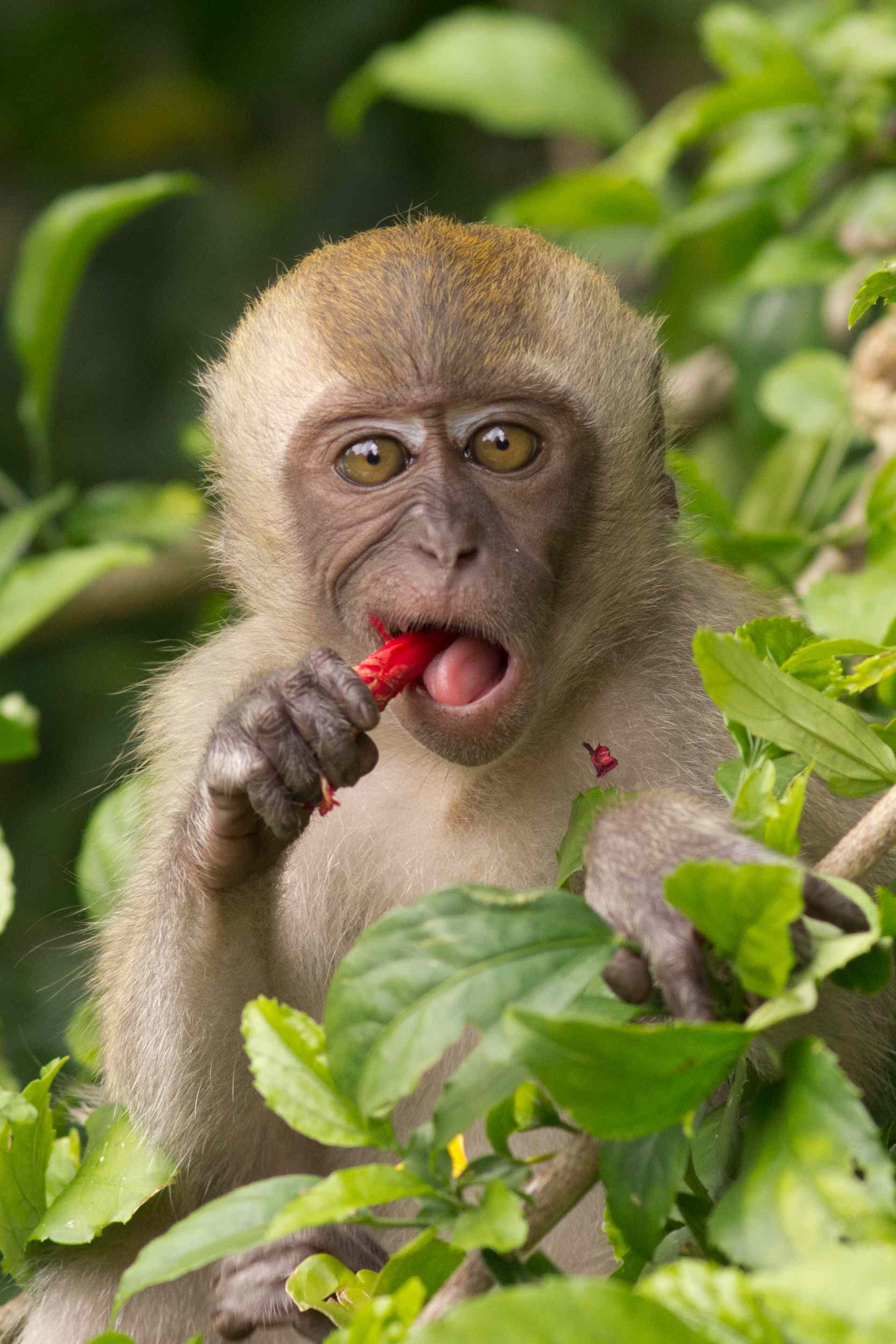 Towards the end of the afternoon, and now back in Buket Timeh Nature Park, what a treat…. a troop of Monkeys. They were lingering around the cart park amongst the roadside verges, walls and fences, not actually "sponging" food from the visitors but loitering with intent so to speak. I watched and photographed them for 45 minutes and got to know who was who. For example a couple were picking at each other in that mutual grooming way that we are familiar with. This was a true couple, a big burly adult male with a big ugly head and a look even more disdainful and surly than the Railway worker back in Exeter. His "girlfriend" was a pretty young thing who was doing most of the work and every 15 minutes or so he would insist she stopped as he mounted her from behind. This was all so quick I doubt she hardly realised she was being "ravaged", but the obscenity of it was brutal and almost embarrassing just feet away as I was. Several females had young infants feeding as they were held tight and other slightly older "children" played nearby. One male was sporting a severe wound to the face which tracked from the corner of his moth to the ear. The wound was days old, yet to heal but clean looking and it must have been incredibly painful and probably debilitating. I managed some great portraits and the best one is the handsome young animal that had a liking for hibiscus flowers. I hope all my photo opportunities are going to be as good in the next few weeks.
