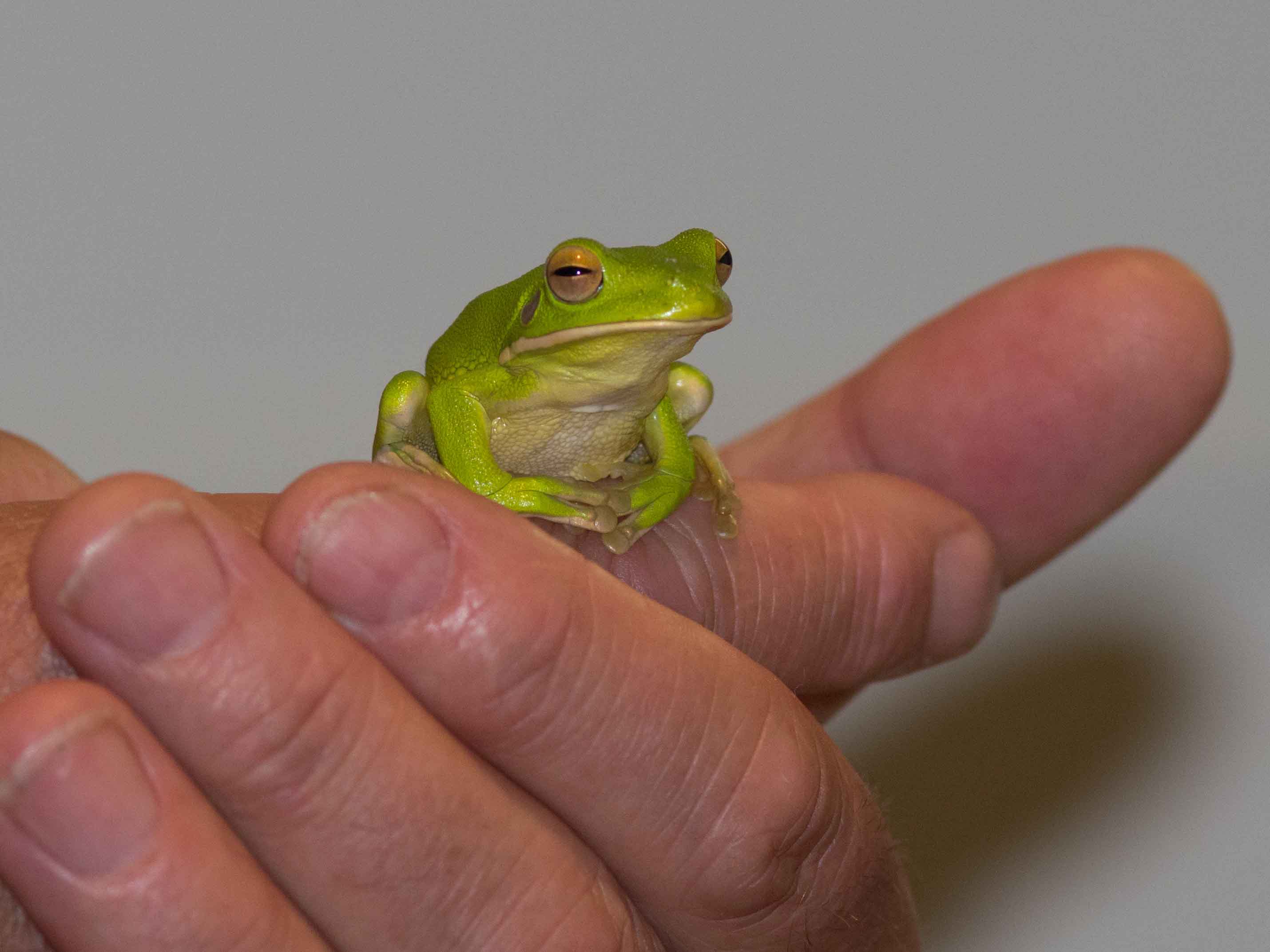 Since I blogged yesterday, so much has happened. I had begun to associate a scream of fright by Jenny as an exciting few minutes, it means that she has seen something she doesn’t like the look of, or even worse has decided to jump on her, and that means something exciting to see! So it turned out to be yesterday, but in the end, she got her own back! Tree Frogs……….. who would have thought they could be such good fun and a source of such frights as well. So far on the trip, we have encountered 3 different species but all in the house. I will be able to give you a species list once I have managed more research but in the meantime, a short……. very short description, will have to do. There is a basically, a large green frog that is like a pet at the house and he doesn’t……… (as I write, I hear my first kookaburra)…….. enter but stays out around the front door balcony. He has been seen most evenings. Then, in the house, and that can mean anywhere, are brown tree frogs, so far seen in the bathroom, on the bookcase and in the wardrobe. They are quick and agile and hard to catch.