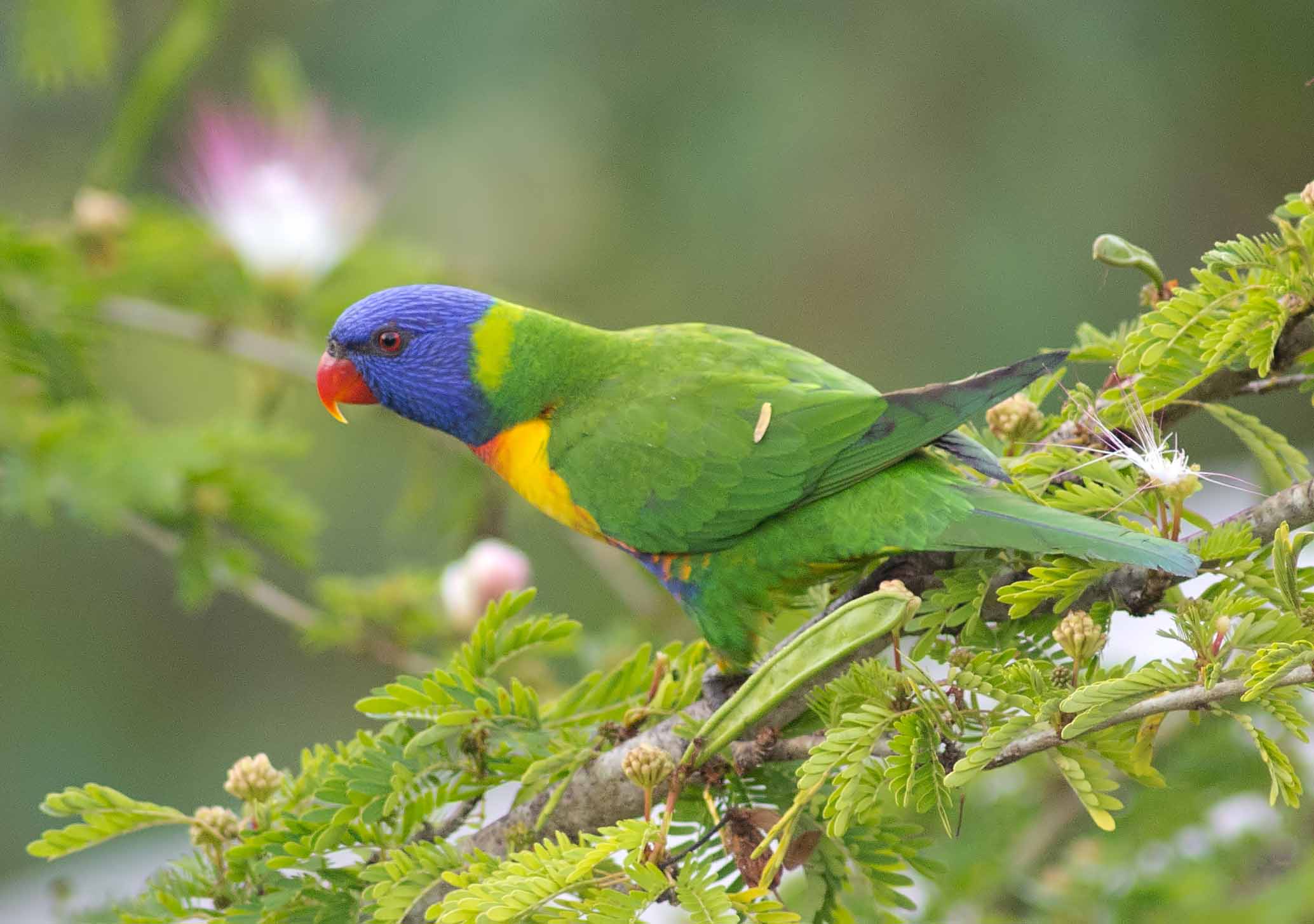 This morning, very soon after dawn, there was a small flock of Rainbow lorikeets feeding on the wispy flowers of bottle brush (or similar)…….. (the Kite is back, but no interest in the food yet).