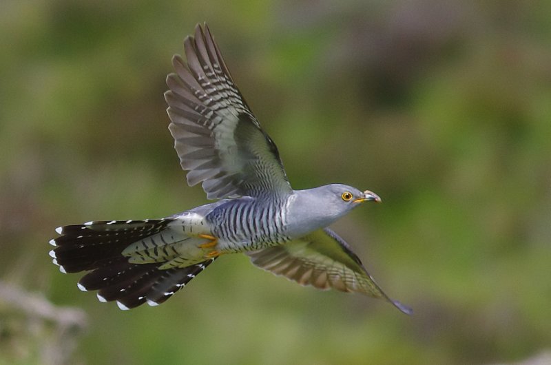"Last summer, Devon-based bird photographer Charlie Fleming won his first Photo of the Week with an action shot of two Kingfishers fighting. That image resulted from Charlie spending an extended period photographing the species locally, so that he was present when the unusual event occurred. This week, Charlie has once again proved the benefits of putting in the time as his three-year study of Dartmoor Cuckoos finally gave him a three-hour session with a feeding bird. The best image from this session is a flight shot of the sunlit bird against a background of defocused vegetation. The bird is well posed to show off both the characteristic shape and the underside plumage of this species. This photo, though, also illustrates two features that work particularly well for flight shots. The first is that the bird is photographed side-on: almost all bird photography is best done from the bird's eye level, rather than from above or below. With flight shots, this can be more difficult to achieve, but it's always worth striving for. The second feature is the use of an 'environmental background', rather than just plain sky. This gives a sense of place and can provide a better balance of tones compared with the typical high-contrast bird-in-sky shot. Just rewards for Charlie's perseverence getting to know these birds and their behaviour, as well as practising his technique to make the most of the opportunity."