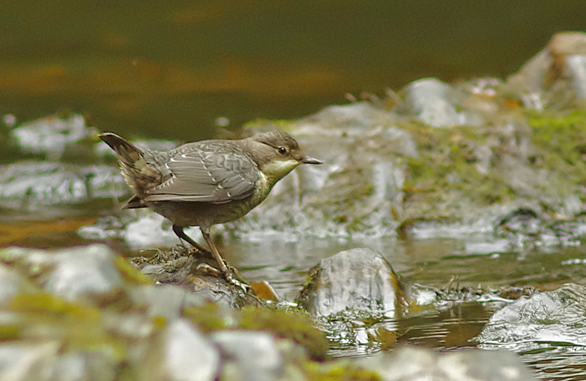 Just a note about how I got this photo. I went back to the river, it was early evening. I was expecting the weather to brighten up, but it didn’t, in fact it got progressively duller and wet. never the less, I made my way to the area where I had seen the young dipper this early afternoon. I was expecting the baby bird to be a bit lacking in “street cred” and that’s exactly how it turned out. I sat in the spot chosen this afternoon, overlooking a couple of boulders. I was dressed in my gillie suit and this proved enough to fool the young Dipper because it wasn’t long before……. there he was, posing perfectly, but the light was poor. I took 100 pictures but couldn’t check if I was getting anything decent because any movement would have spooked the bird, only 10 feet from me. There was just a couple of shots that were OK because of the dullconditions and this is the best. The camera has taken its settings from the white chest of the bird and given this great effect which is what I was trying for.
