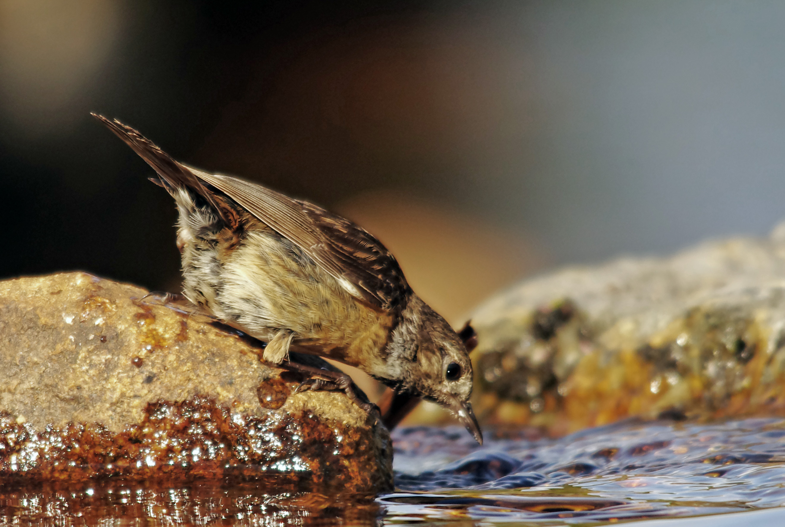 As many of my followers will know, I have been watching "my" Dartmoor pool for the last month. I have a little hide tucked away between a couple of gorse bushes and covered with bracken. This gives me a clear view of the small pool in front of me. It is a very picturesque place and a magnet to birds. Yesterday was a bit of an embarrassment though. Like I said, it's a beautiful spot but I have only once seen anyone else there…… that was until yesterday. My hide is very well hidden and I suppose the couple now lying only 15 feet from my and about to make love al-fresco were extremely surprised when I emerged from the hide to tell them that they were not alone. They quickly jumped to their feet and the man hopped around on one foot (very funny) as he struggled to put his trousers back on. The women…….. 25 years younger than the grey haired man (I wonder if his wife knew), thanked me profusely for interrupting them before the action began and before she had joined him by removing clothes as well. They quickly left with their tails between their legs and I was left to myself, laughing. Can you imagine how the story will be repeated over and over again when the couple tell their friends. But back to birds, a Stonechat came in to drink which is the first time of many sessions that one has come down, the light was perfect and it was a great opportunity.