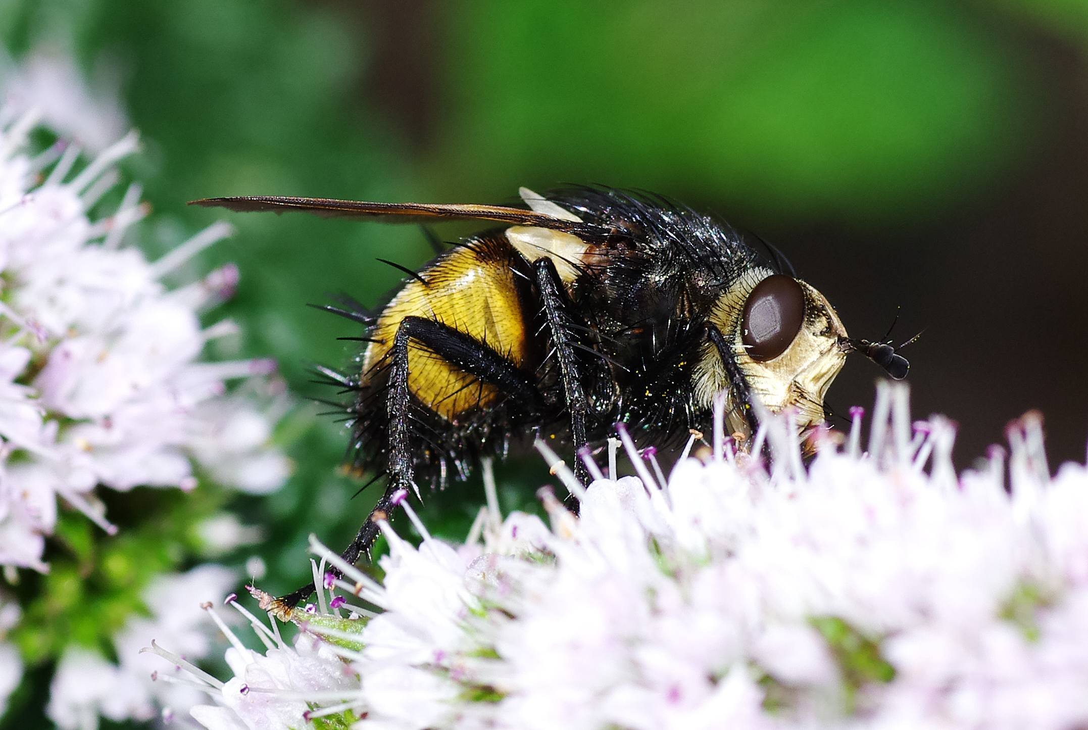 This is a new species for me and the garden. It's a Tachinid Fly with the scientific name Nowickia ferox. It is a harmless fly, about the size of a large Bluebottle but with an impressive yellow abdomen. At first I thought it was a Hoverfly, I took photographs and then had it positively identified. It was feeding on nectar from flowering mint. However, what the photo doesn't show is the very interesting and ghoulish life-cycle. Tachinid flies are "endoparasitoids", that is to say that the maggot stage of the fly develops inside the host, eating it from within and then emerging to pupate. This fly is also Host Specific to a moth Dark Arches, I would have thought that this makes the very existence of Nowickia ferox precarius dependant, as it is, on the success of the moth which it is totally reliant on for it's very existence. Again, all this is happening in and around the garden, a fascinating story well worth a lot more study and interest.