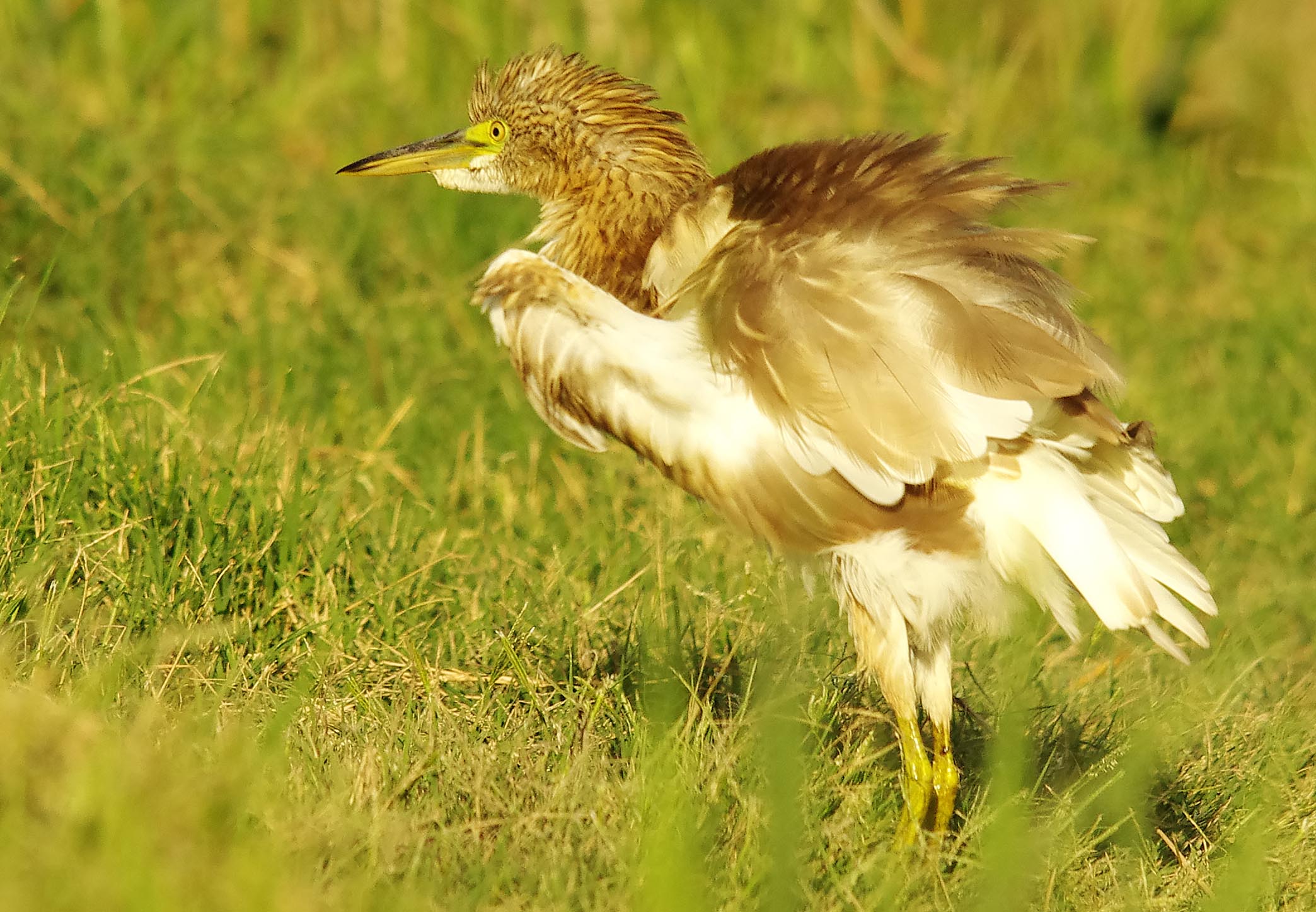 Squacco Heron – Ardeola ralloides was a species, so easy to see during my photographic trip to Spain last week. The first one that I saw, at San Pola Salinas whetted my appetite and was a taste of things to come, but was too hard to get near enough for a photograph. At Pego Marsh they were numerous and being a bird that I hadn’t seen before, it was exciting to see so many, and also to have such good photo opportunities. The Squacco Heron is a squat heron that in shape, reminded me of a Green Heron or even a Bittern, but is in fact, a pond Heron in the family Ardeola, and related to the Chinese Pond Heron. They are a pale bird with buff markings on a white background, like milky coffee. In flight, the white wings and tail contrasts nicely with the darker buff back. They have bright yellow legs and an even brighter yellow eye, and a dark blue/grey, sharp dagger-like beak. There is a strong hint of green on the lores, (the bare skin between the eyes and beak), which apparently gets even brighter and more blue when in full breeding condition. Adults, as is usual with herons and egrets, have long plumes on the head and mantle which are whitish, edged with dark chocolate brown. The ones that I saw, on reflection, seemed to be mostly juvenile birds. I am pretty sure that the birds above and below are juveniles.