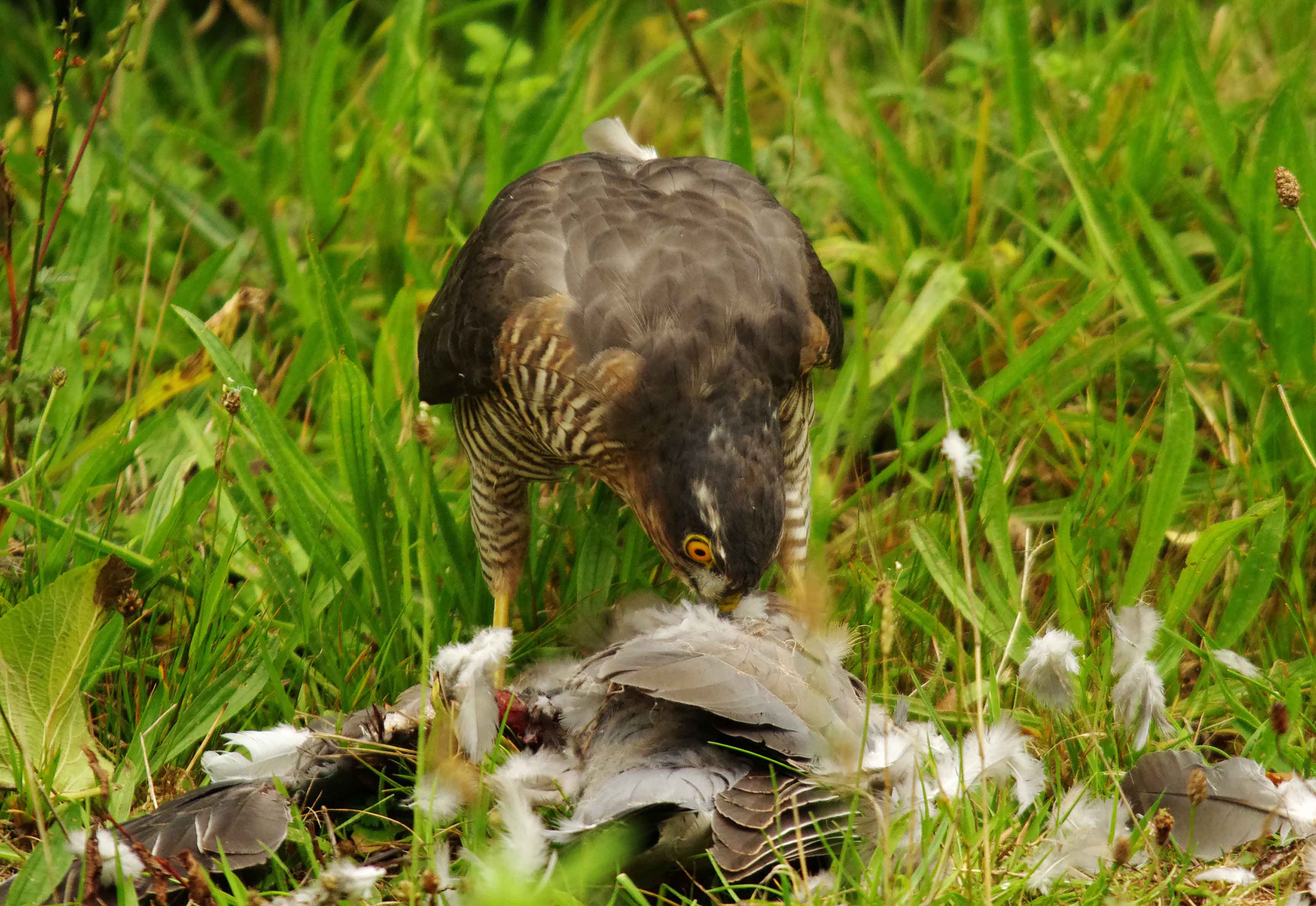 The weather has been dire today, which was disappointing because after a weekend with my family, I had the chance to get out and get some photos again. I hoped the weather would clear but it didn’t so imagine my excitement when, on the way back from a shopping trip, in the rain incidentally, and on a country road not far from Exeter, I caught sight of a Sparrowhawk, obviously with prey. It was a main road but I managed to turn around and go back to go past it again. Yes I was right and it was standing over it’s prey. There was a snag! I didn’t have my camera with me. I rushed home, still a mile away and through the traffic. At home I quickly grabbed my camera and rushed back as quick as I could. It was at leas 15 minutes before I was back and yet, there it was, now plucking it’s prey. I had no way of knowing if it had taken the bird, or was it road kill? It was a Wood Pigeon, too big to be carried off, thankfully the Hawk was forced to eat it where it lay. This is the second time this year that I have had the good fortune to watch a Sparrowhawk with prey, and both times a Wood Pigeon and each time on the road (or very close to it). I got the car as close as I could, opposite and up on the curb. The bird knew I was there but settled back to carry on plucking it’s prey, only pausing when really large vehicles roared past. Having had my 2.8 lens stolen I was forced to use my 6.5 lens which meant that in the dull conditions I was only able to get 1/200 second, hardly quick enough to capture really sharp images. From the hundreds of photos taken, I managed t get a few decent, sharp images and given the dull light and the lack of a good lens, I am relatively pleased.