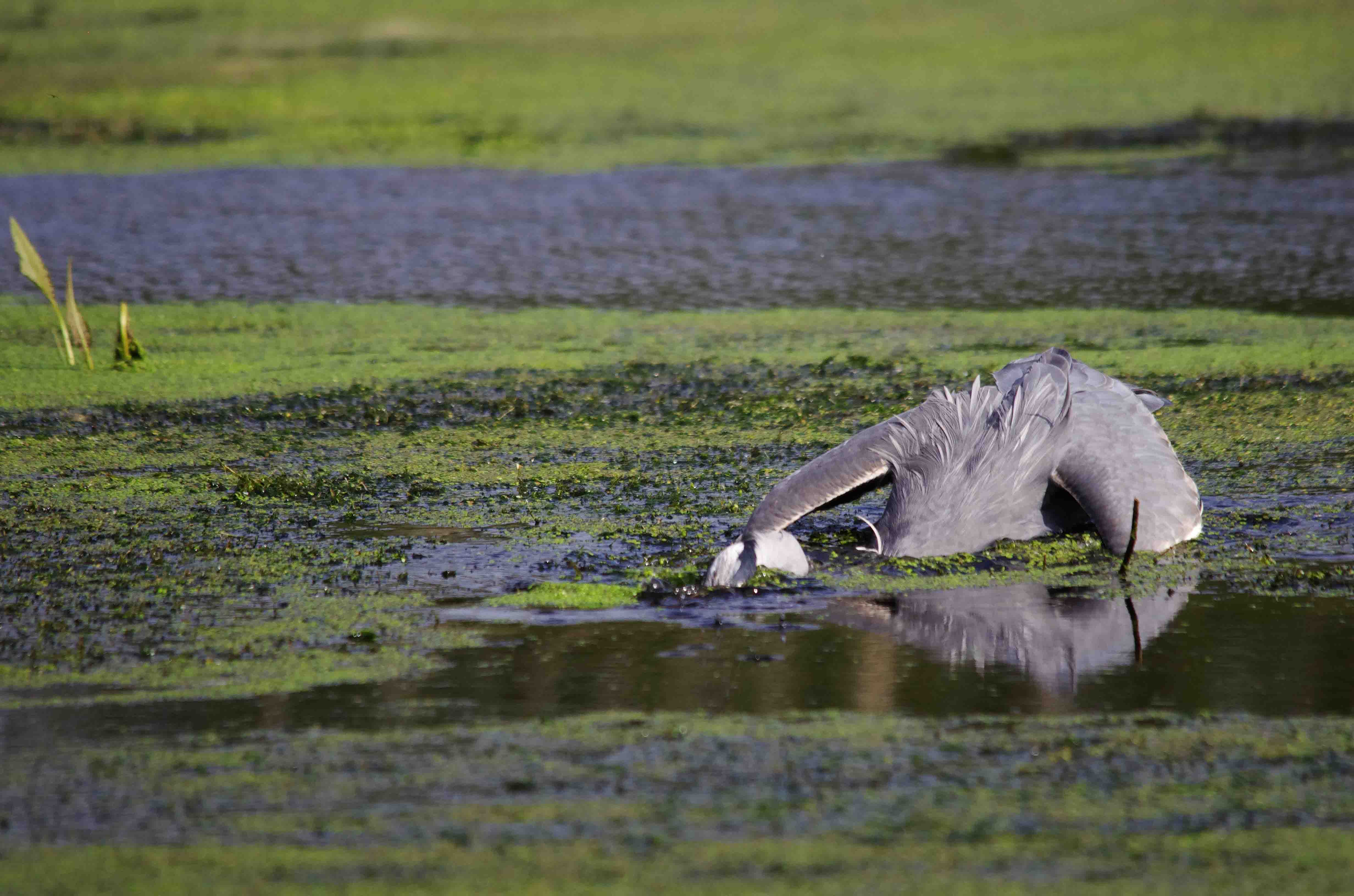I followed him, not content with the picture I had from his first success. It wasn’t long before he ignored me and was again darting forward, emerging yet again, with a bigger fish. This time I was more prepared and in any case, he stood motionless with his prey as he waited for it to go still before he tossed down his massive neck.