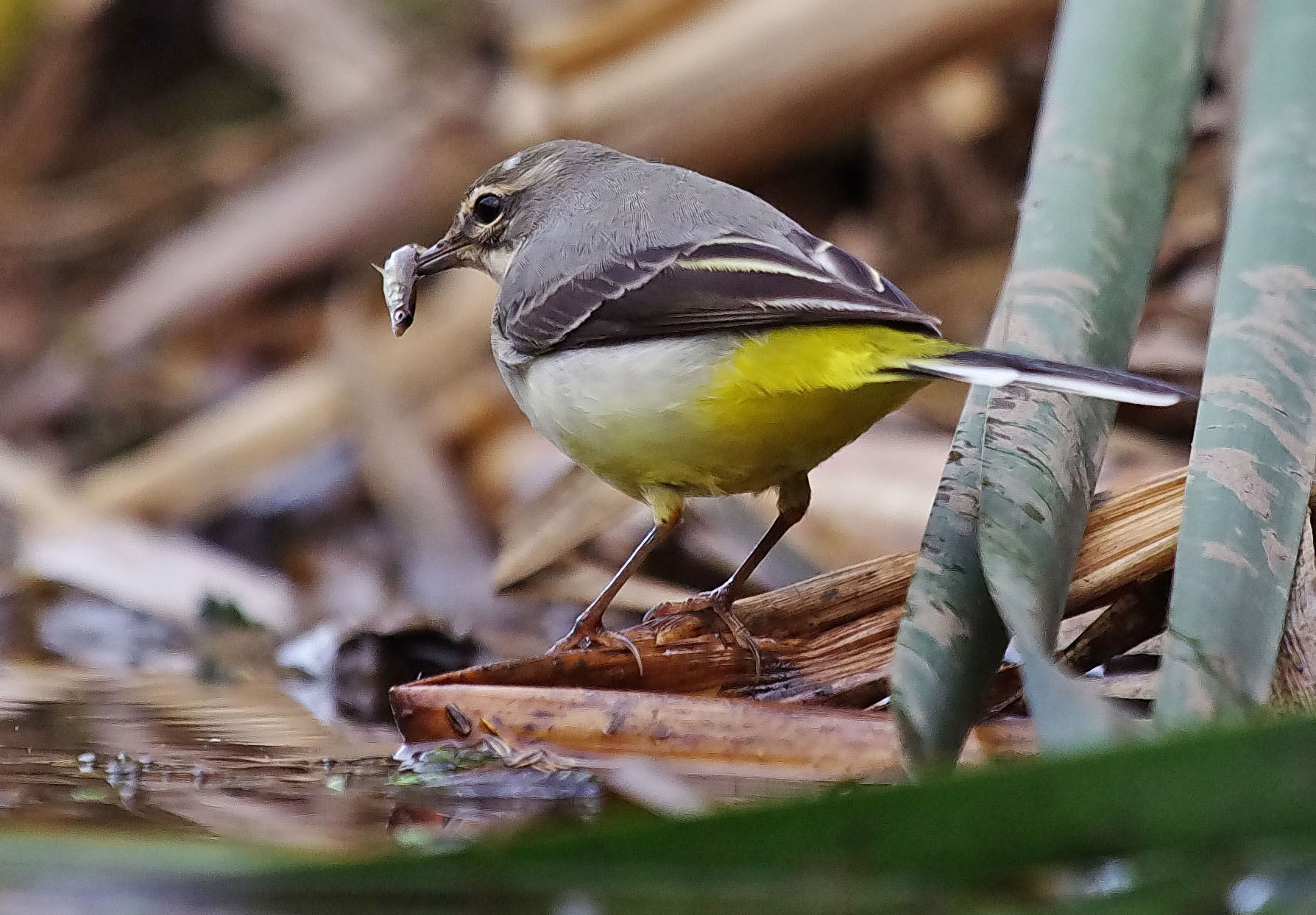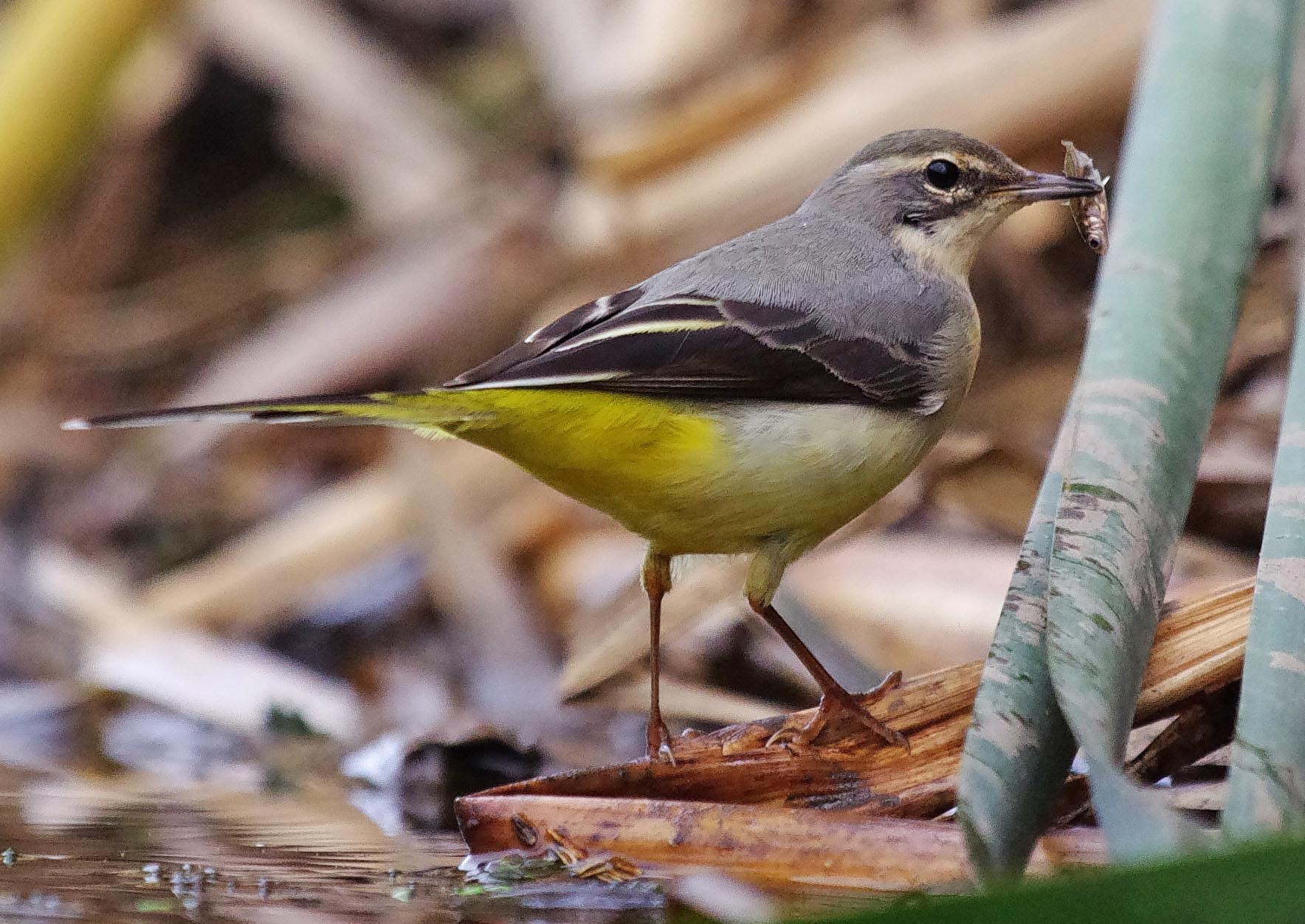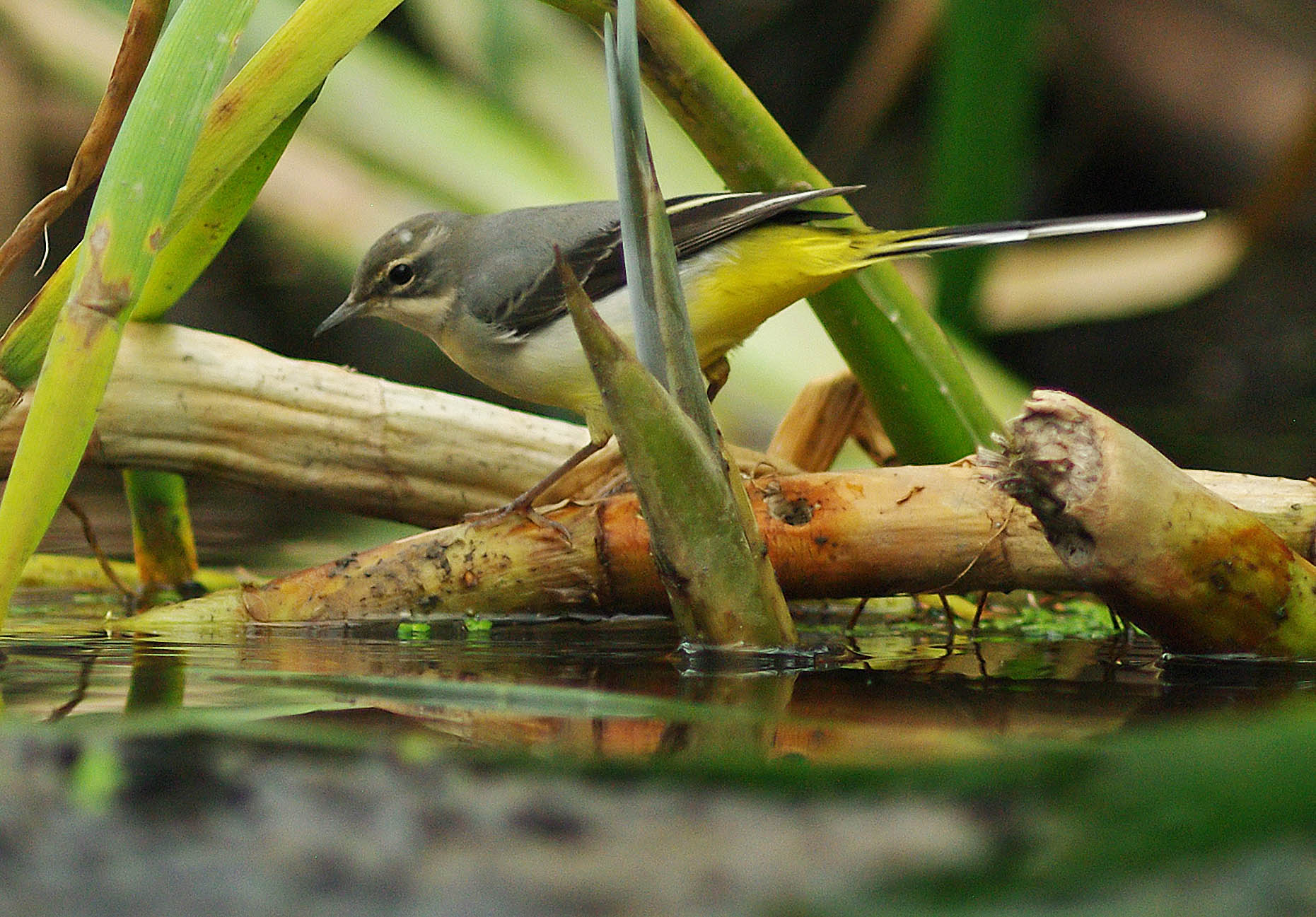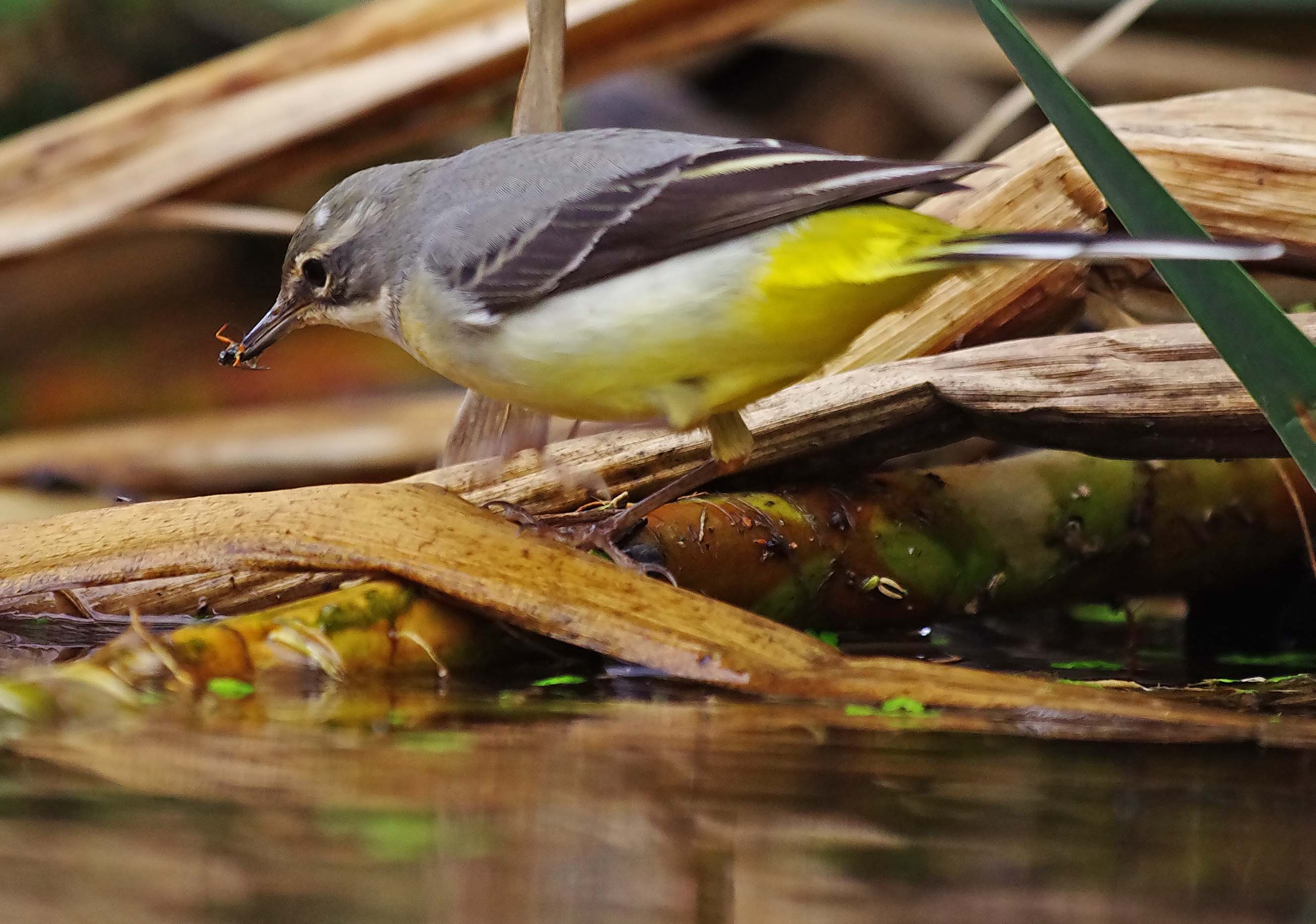 These Grey Wagtail photographs are amongst the best pictures that I have taken which is quite something really. I took them late today, but at a price. I have been really under the weather this week and for some reason I can’t shake it off. I have got a problem with Gall Stones and I can tell you that the pain can be really nasty. I just tried to ignore it and continue because I want to get on with the things I enjoy doing. I am afraid that I really y over did it today and by 6.30 felt really ill. Glad to say that now, after sitting quietly for several hours I am feeling quite a lot better. The pain seems to be worse when I am active. But enough of that! I went to the brook late afternoon, in spite of fatigue and a painful side. I had a plan to get as close to the water as I could. because I knew that would give me some photos from a different perspective. I was hoping to get “killer” shots of Egrets feeding. It didn’t wok out that way though. But instead, had some great views of the Wagtail, very close. I photographed it as it fed and was amazed to see it, 3 times, catch tiny Sticklebacks ad eat them like a little Heron! Great sighting and great to get photos of it as well.