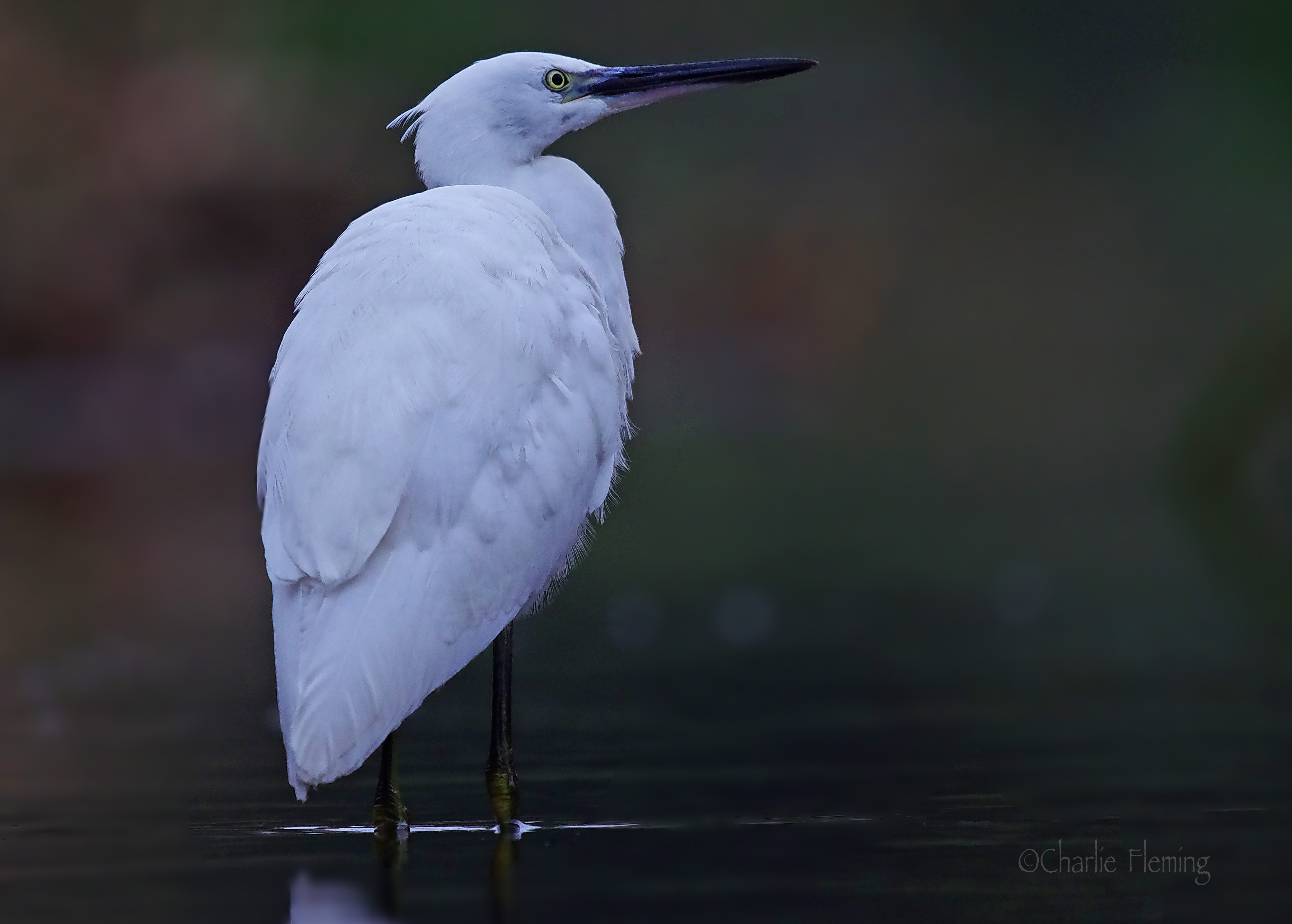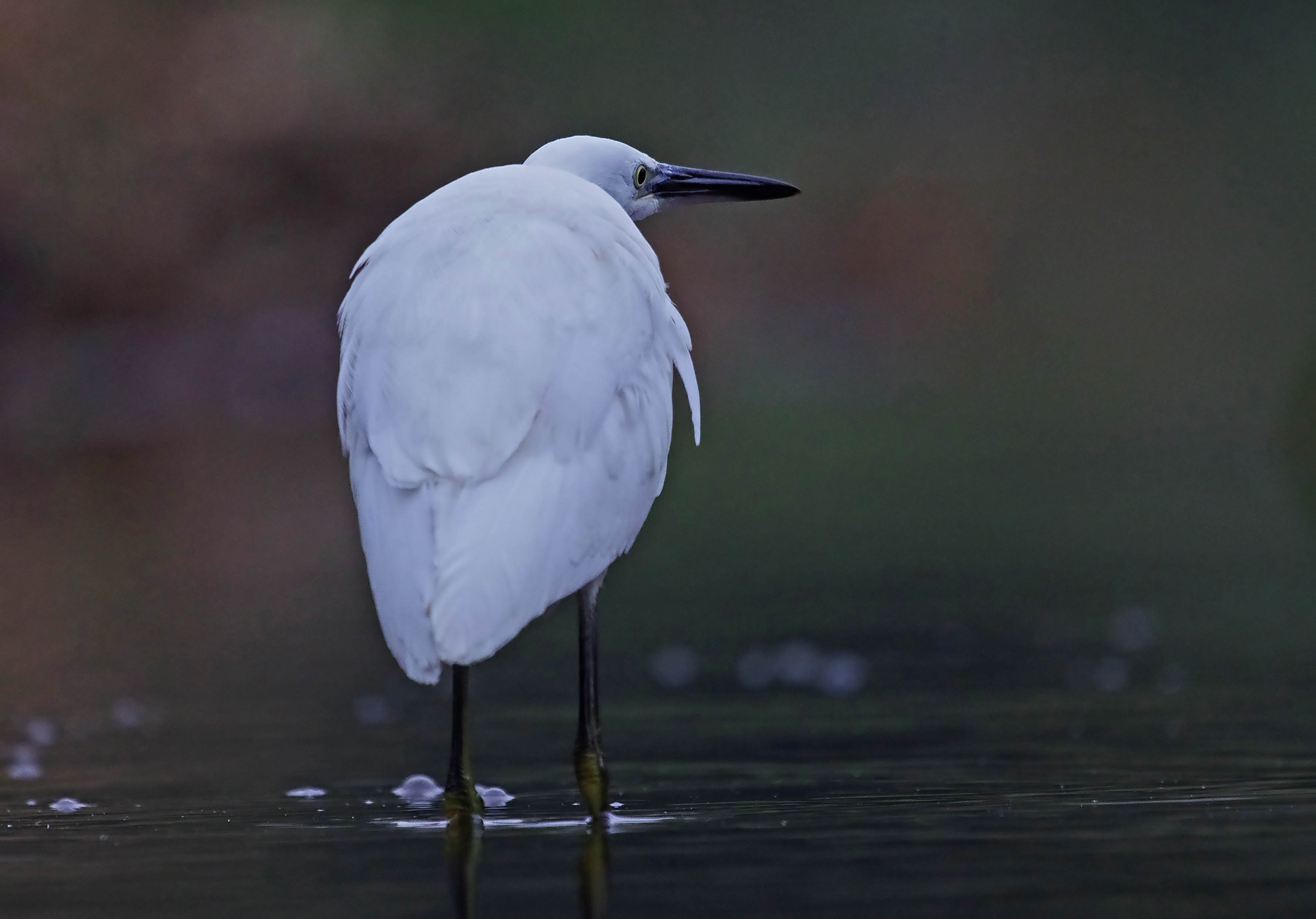 I am always pleased when a plan comes together. I had been planning this photograph for a few days. Having been inspired by photographs from other people in other parts of the world, I came to the conclusion that most of the appealing and special images were all taken down at ground level. So that was my plan. I arranged a very basic hide/cover right down at the water level of the brook. Firstly, I covered the mud with a good layer of reeds, than on top of that I placed a military roll mat. That was something to lie on sorted. I pushed sticks in to the mud at all four corners and the middle, on both sides of the mat. I then attached camouflaged, plastic tarpaulin to the sticks with cable ties at about 2 feet high. Finally I covered the whole thing with scrim netting pieces, making sure that a piece of netting tumbled over the open end. To finish it off, I randomly threw pieces of grass and debris including leaves and the like, to complete the camouflage. It all blended nicely in to the bank-side. The camera was then mounted on a fishing “bank-stick” pushed in to the mud, meaning that it was almost at water level and pointing down stream. I then had to lie under the cover, hidden and still with a clear view of the stream. It was all a bit extreme and a little on the eccentric side but well justified. Last evening the egrets didn’t turn up but as you have seen, the Grey Wagtail put on quite a performance. Then this morning, later than normal, because I am still suffering from my Gall Stone problem and in quite a lot of discomfort, I went back and tucked myself in. At first it was quiet but the Grey Wagtail came on to the perch on my right and at eye level. I also had a second camera with me loaded with a 200mm lens for the close-up opportunities. I had a clear view of the perch, and the Wagtail and I took a few shots. Surprisingly it started to sing, really musically and very nicely. But as 8 o’clock arrived, still no Egret. Then suddenly there it was, walking towards me, feeding as it went. I decided to wait until it was frame filling before I started to take pictures. Unfortunately, it was still quite dim and I had to set the camera’s ISO at 1600 which meant that we were going to have some noisy images. The bird got nearer and I had some shooting pains from the Gall Bladder! I carried on and in the end almost got the pictures I am looking for. When the light is perfect, I am sure that I well be able to do much better. At the moment, because of the light, I haven’t been able to get the action shots that would be so attractive.