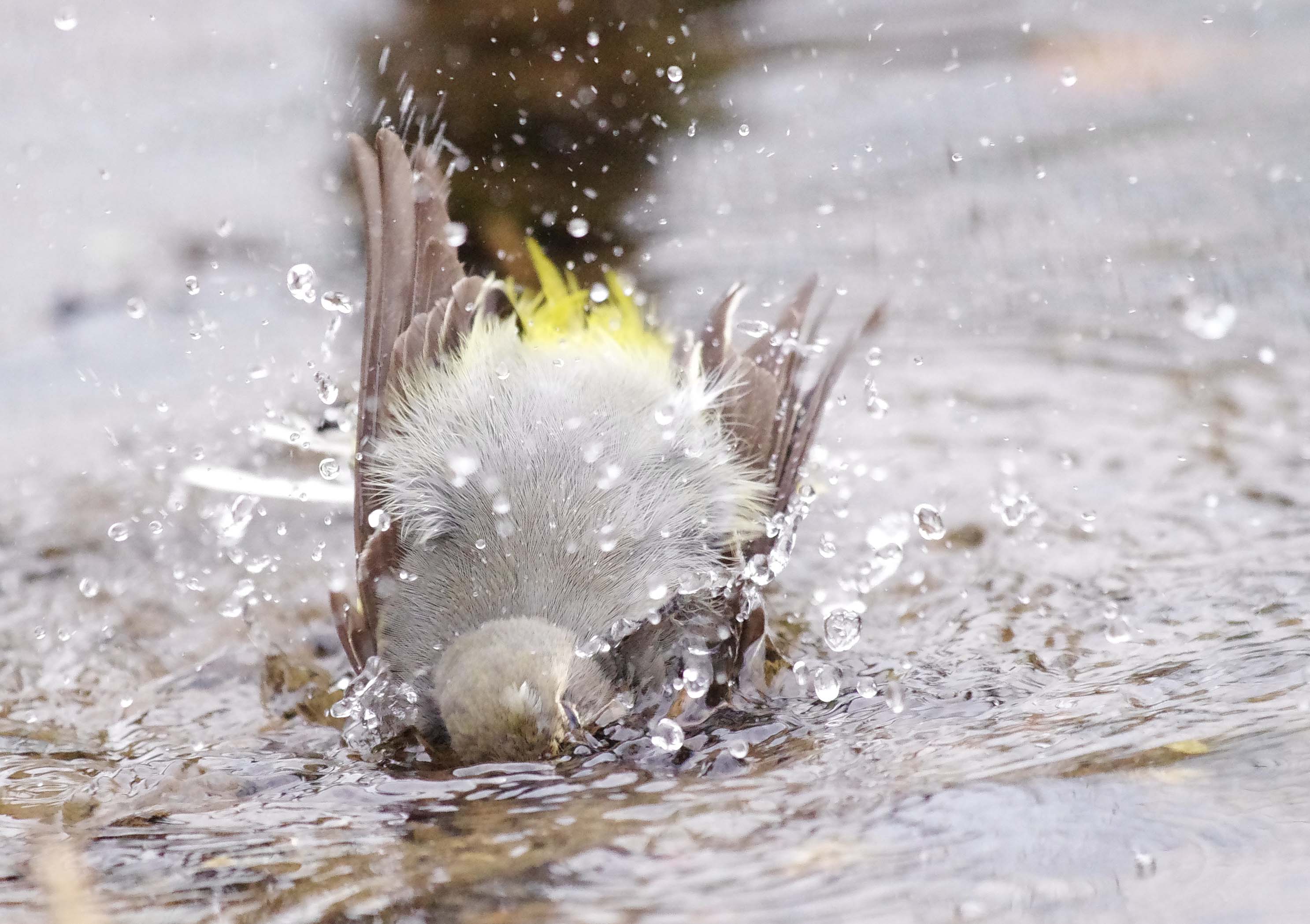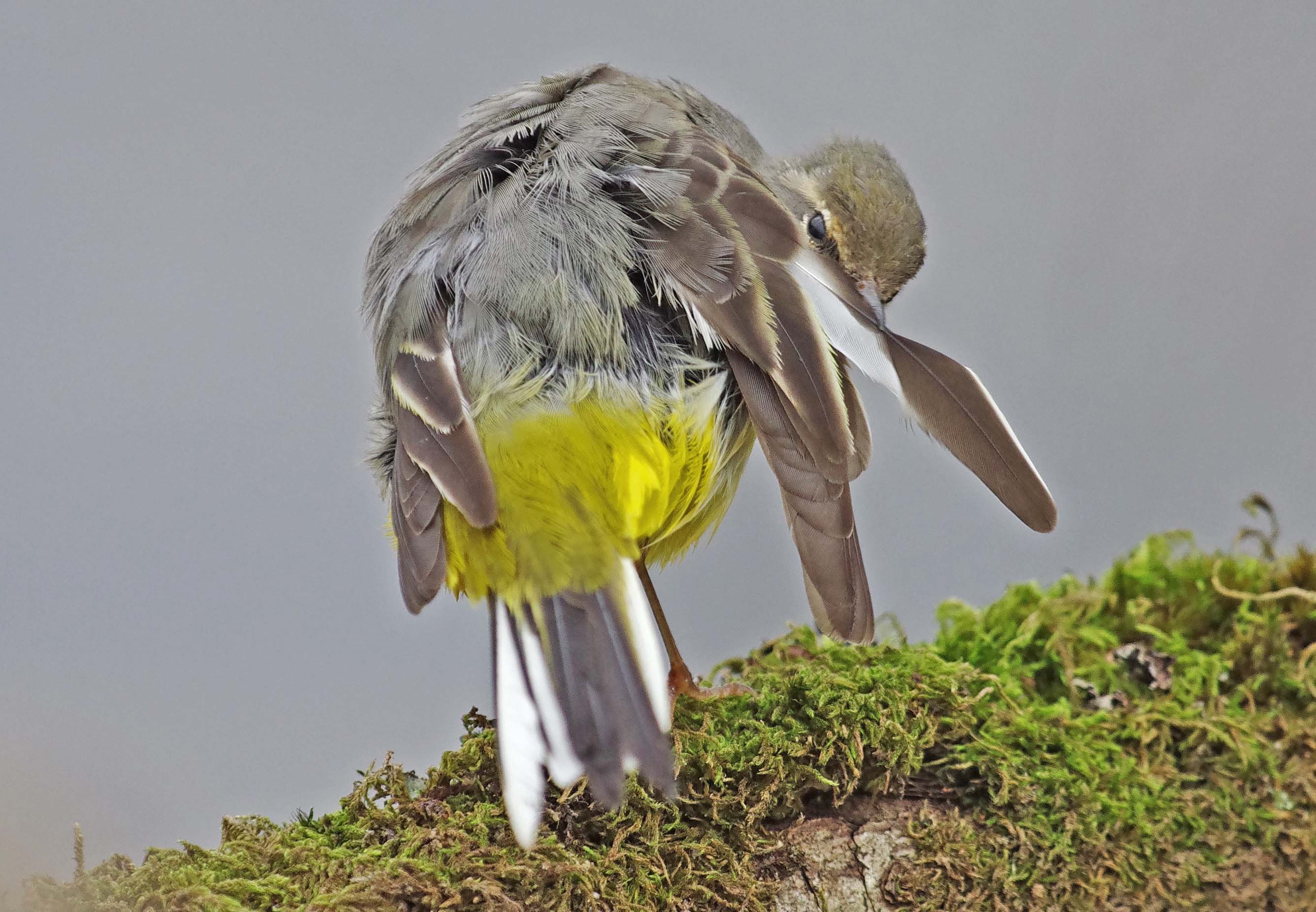 In common with most birds, Grey Wagtails bathe and preen regularly and often throughout the day. Here's a female preening yesterday.