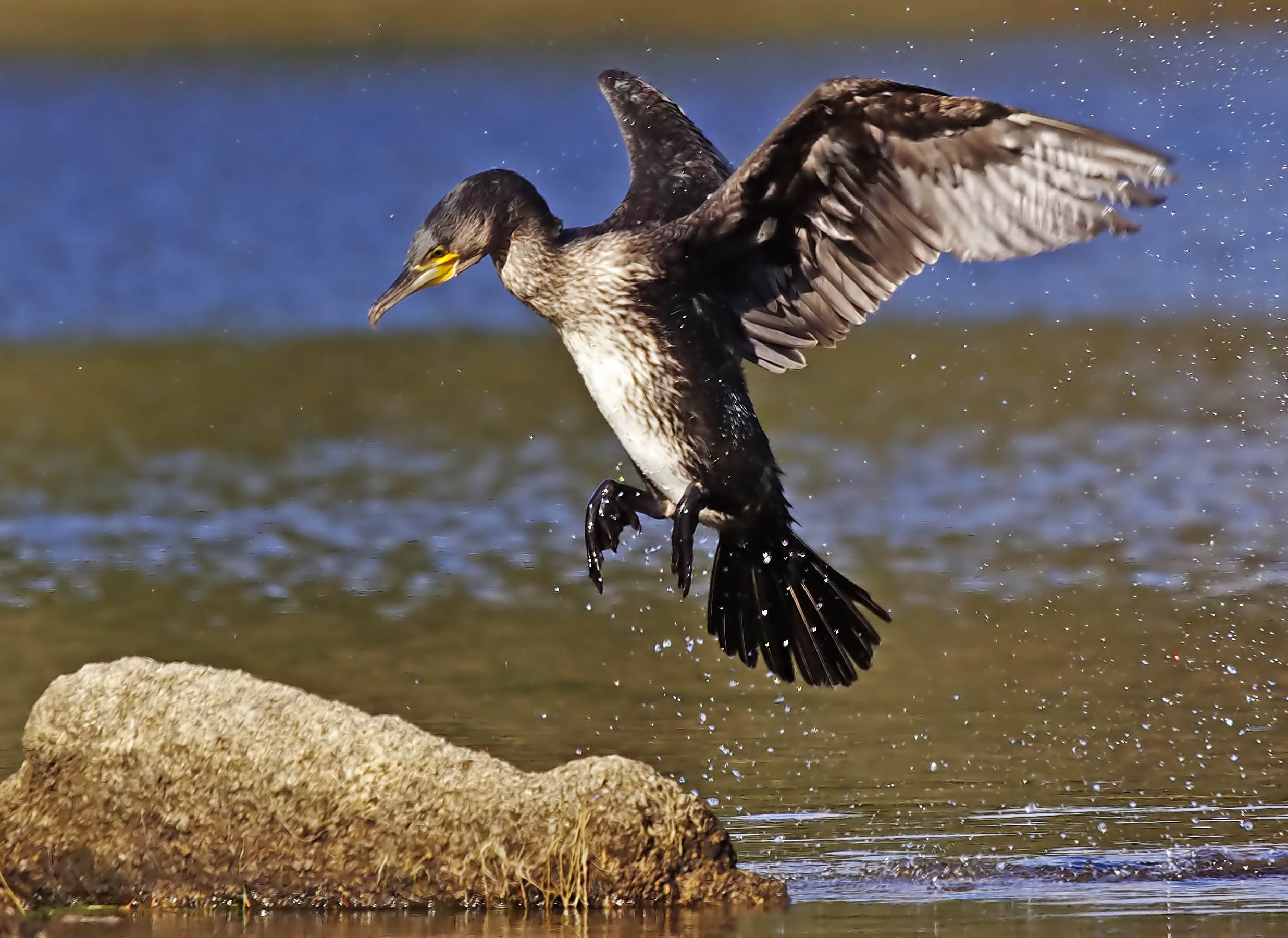 I knew that my strategy was working well but it was a waiting game, in all 5 hours of waiting, but it was well worth it . I was joined by a Cormorant at one point and in the brightness I took a few smashing pictures of it as it flew up from the water on to a rock very near to me.  Cormorants are not very popular but you know what? I quite like them, they are very photogenic especially in flight.