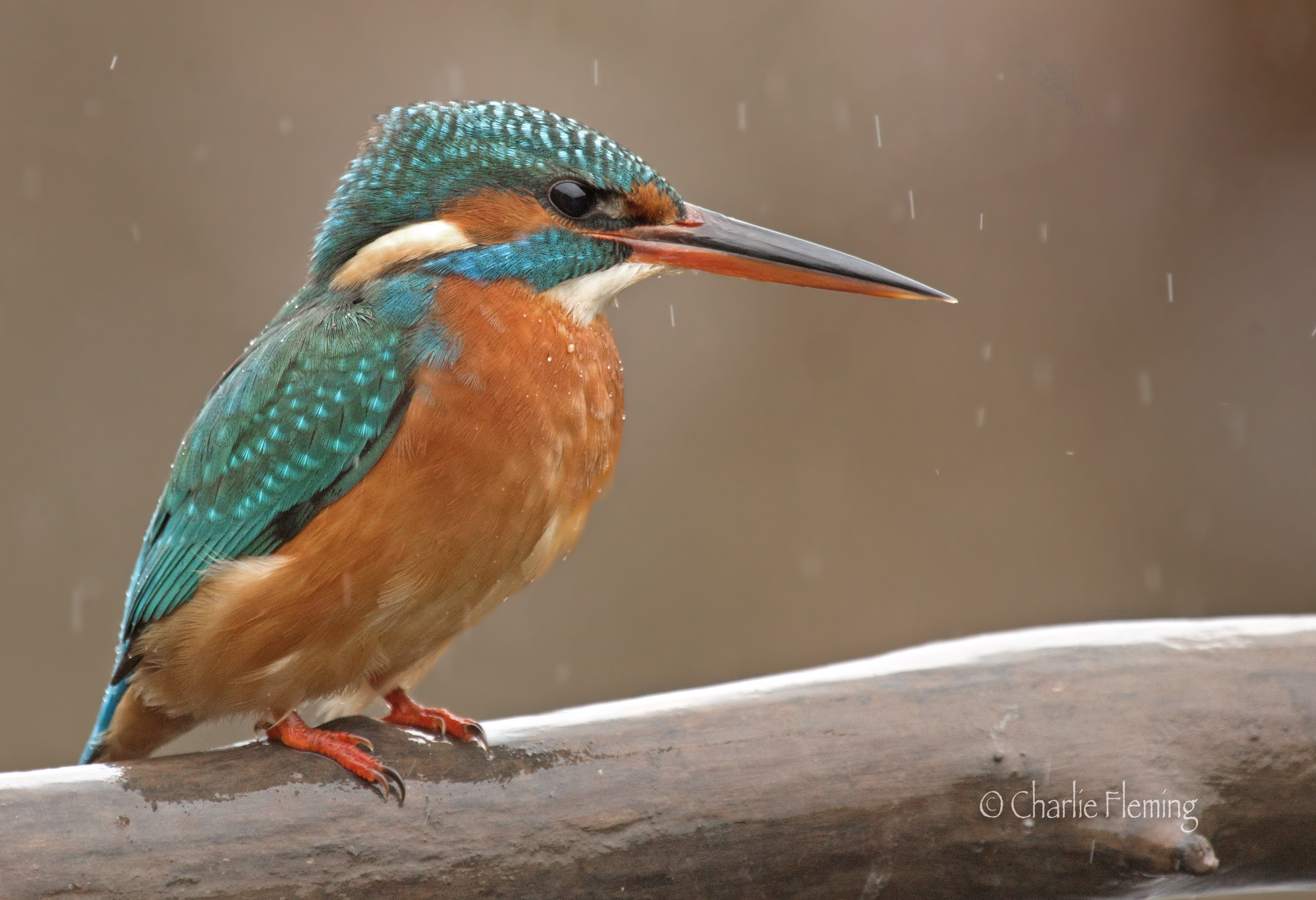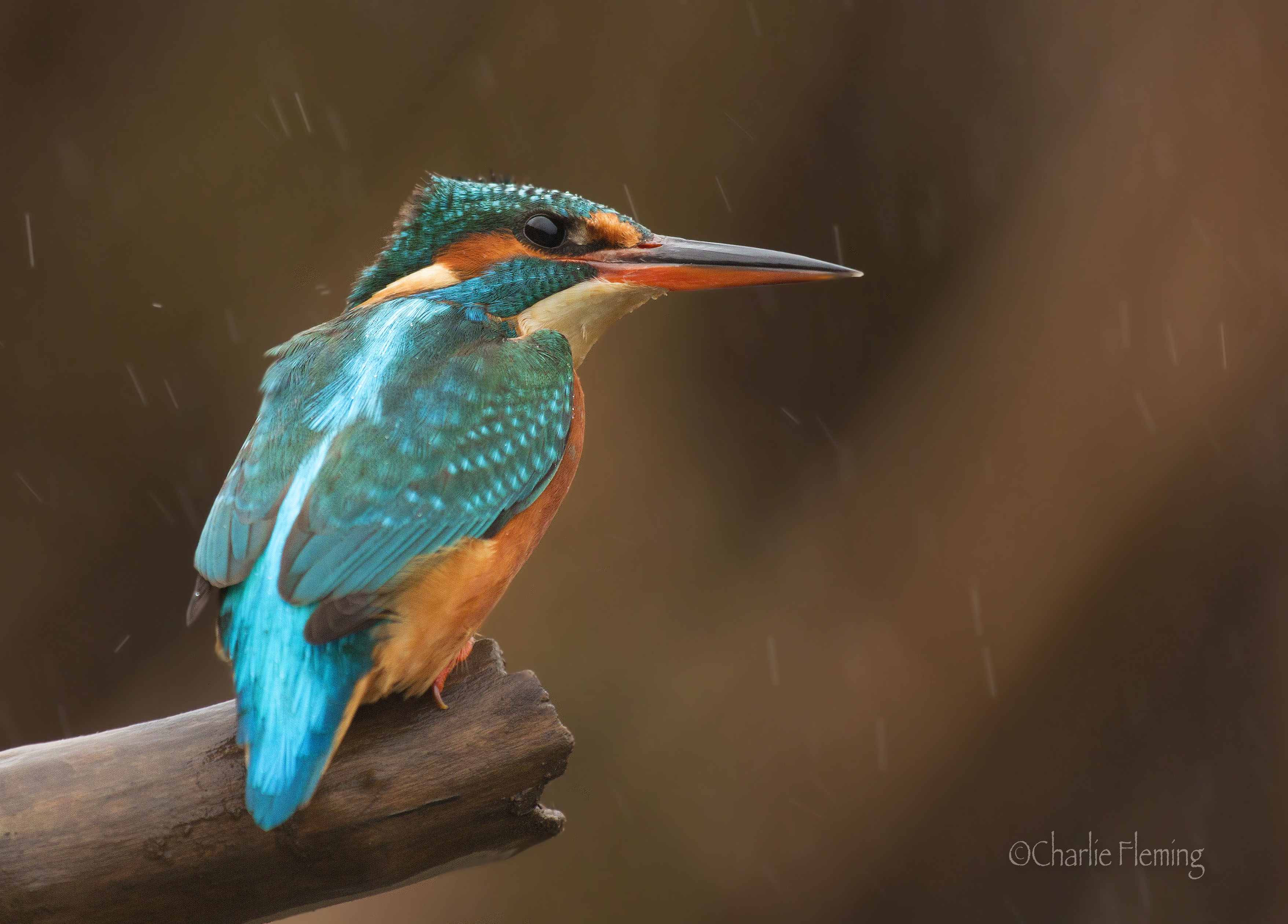 Well, it's now PM and as you can see from the above, it was a successful morning trip. As I got in to the car it was just starting to get damp but it was brightish and without a trip out, it would be a long day in doors. I carried on regardless and managed to tuck myself in the hide before it got too wet. Gradually it worsened, but I was under cover and the camera is designed to be used in unfavourable conditions with 127 weatherproof seals so Iwasn't too concerned when the rain and wind got much worse. I sat and waited as normal and the minutes ticked by to an hour. Keeping a watch down stream I saw quite a splash and theres only one thing that is going to splash like that and even though I couldn't see a bird on the bank I ws pretty sure that a Kingfisher was not too far away. Just the hint of a bird in the territory is enough to suddenly make it not boring anymore. But when the minutes continued to tick by, I have to admit that I did start to get a bit frustrated. I literally said out loud " Oh, come on" and it worked, she flew towards me just as she had on Sunday and landed exactly where she had before, straight on the perch in front of me. The wind blew her plumage about, that alert head on the side pose is typical when a bird is intent on fishing and so it proved, she didn't see any prey and then flew off up stream making my morning worthwhile.