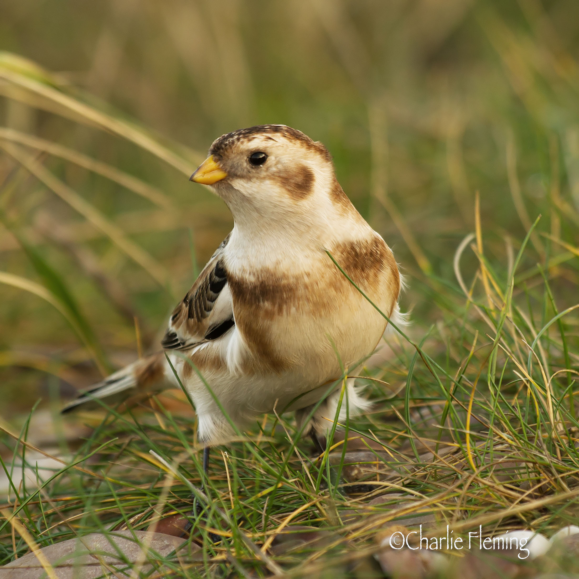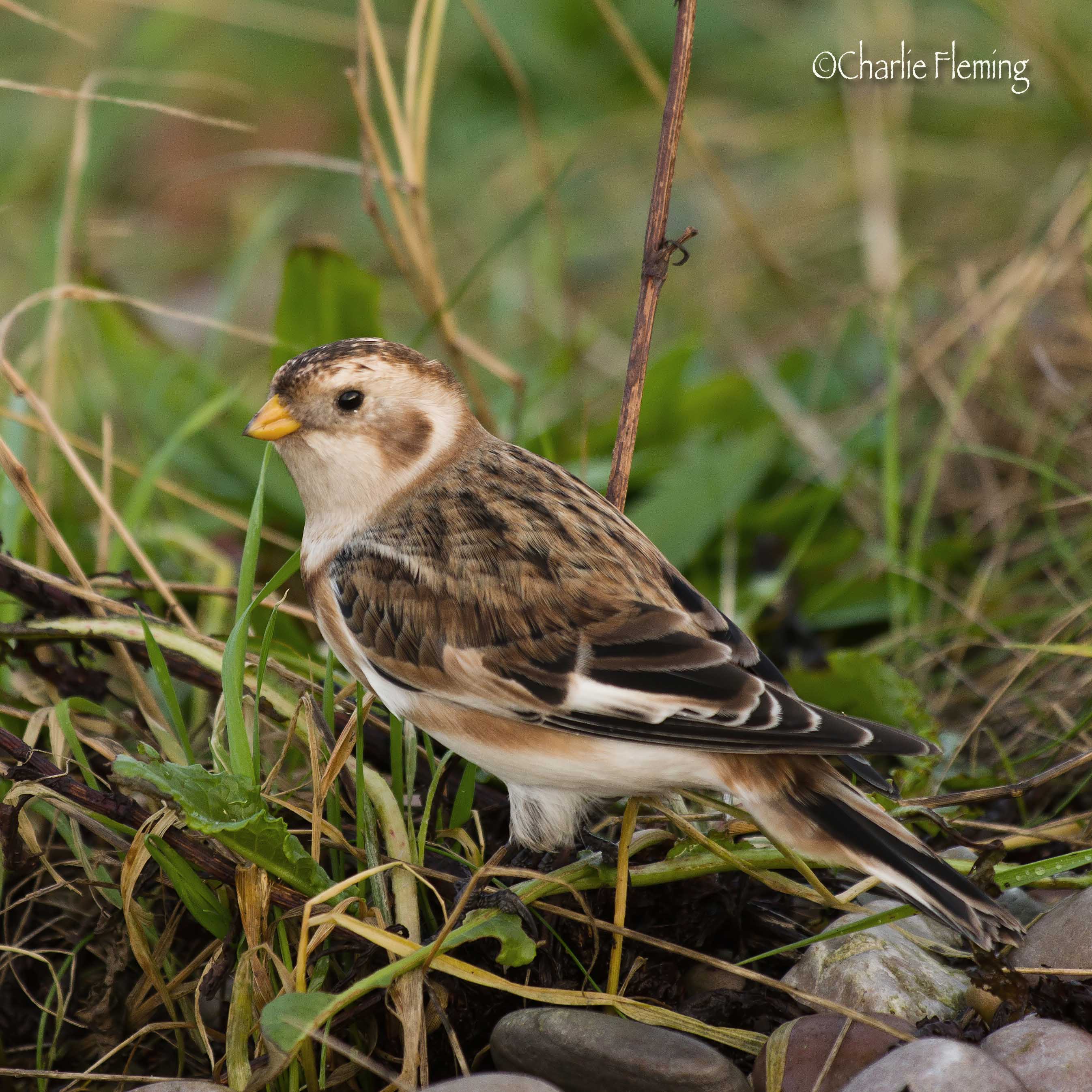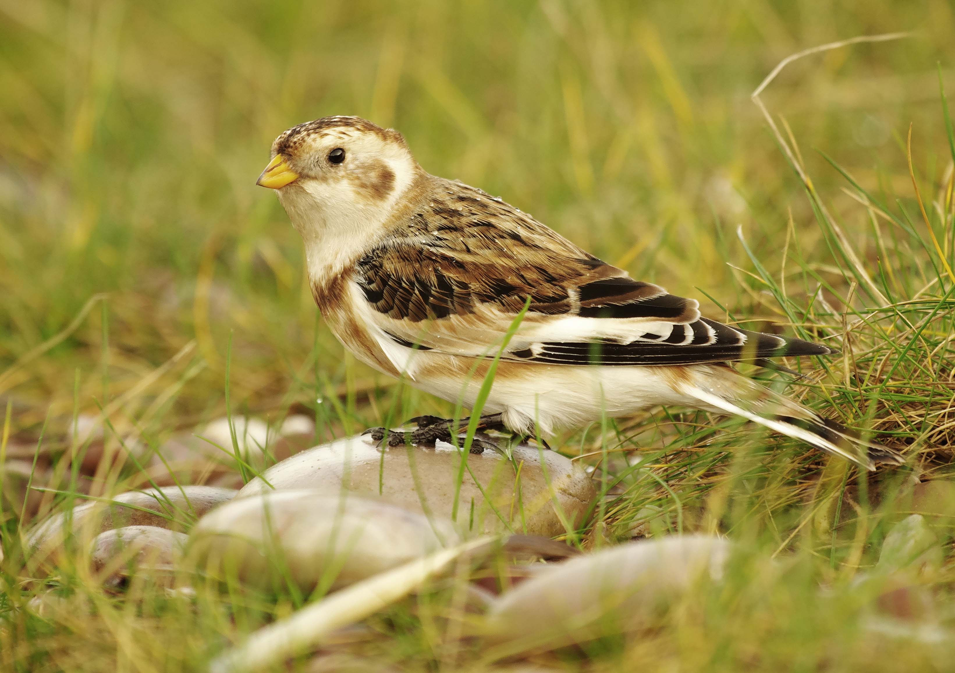 Snow Buntings are pretty little birds, pretty special and pretty rare in to the bargain. I wouldn't like to estimate how many spend the winter here in the UK but it may be just a few hundred, if even that….. who knows for certain? I last saw them in North Devon, at Sandymere on 26th October and then last December at Turf Lock on Exminster marsh. It was nothing short of a gale when I left in the early afternoon to go and see if I could find the one that had been seen for the last week or so on the shingle bank close to the mouth of the River Otter. When I got there it was desperately bad with driving icy rain and a wind that made your face numb with cold. I had deliberately gone when the weather was bad because I was hoping that this might create some atmosphere to the photographs and also, of course it would be a little quieter. It wasn't long before I caught sight of the little bird flying from the shingle. I saw approximately where it landed and walked in that direction. But it was really hard to find amongst the shingle. Eventually, after lots of searching, the rain had stopped by now, I found it feeding on grass seeds amongst the small clumps of sparse vegetation growing amongst the pebbles. It was incredibly camouflaged and even when just ten feet away you could lose sight of it. I took lots of pictures, trying to get at least one decent one, I think I did, but that's for you to judge.