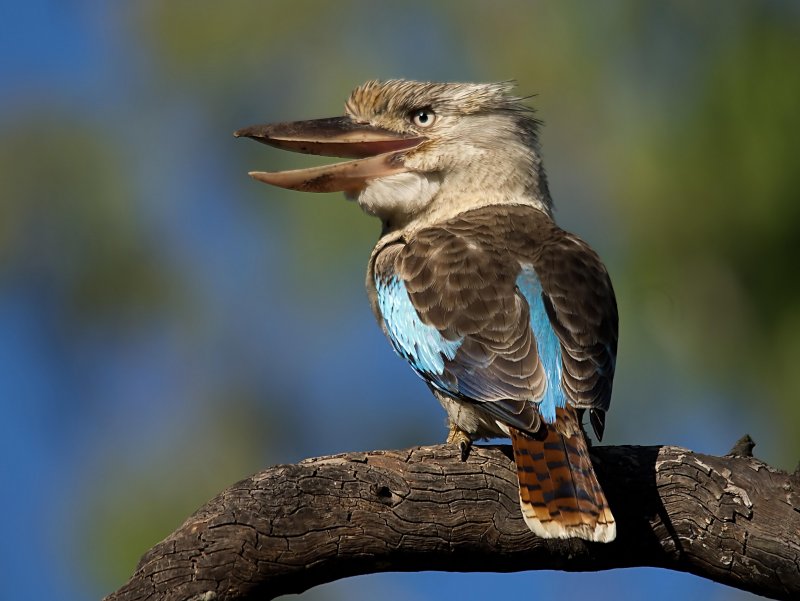 This is a Blue-winged Kookaburra. Near to Townsvile is an attractive beauty spot called Alligator Creek. I visited a few times and each time the resident Kookaburras entertained us. Not only do they have amazing personalities but they are very photogenic. They would wait patiently until they spotted the chance to grab a sausage or piece of meat from the picnickers, even stealing in flight from the barbecue grill.