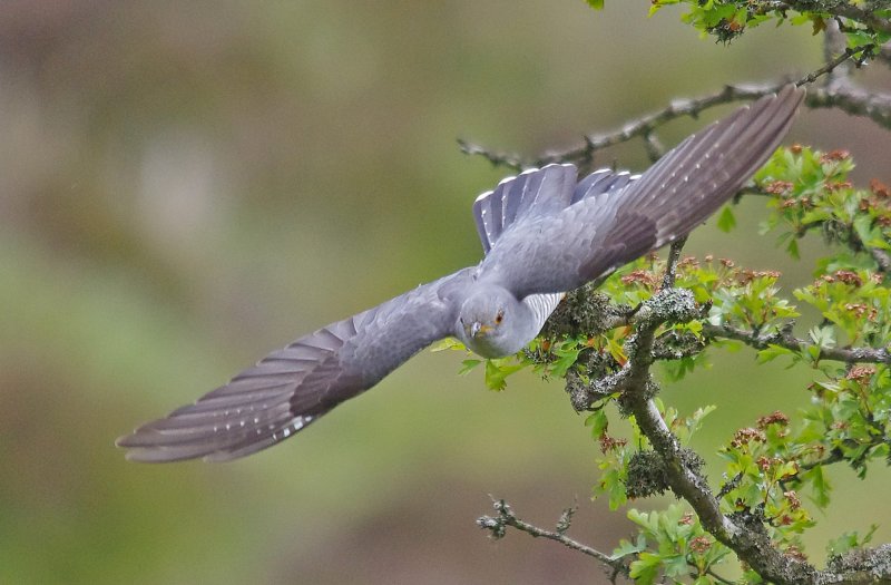 What made watching and photographing this Cuckoo easy in the end was the presence of a good food supply. The Cuckoo would position himself in one of several Hawthorn trees around an area of cropped grass. He would use his perch to sight large caterpillars, sometimes from 30 feet or even more and then gliding down to pick them off the grass before flying back up to his perch.