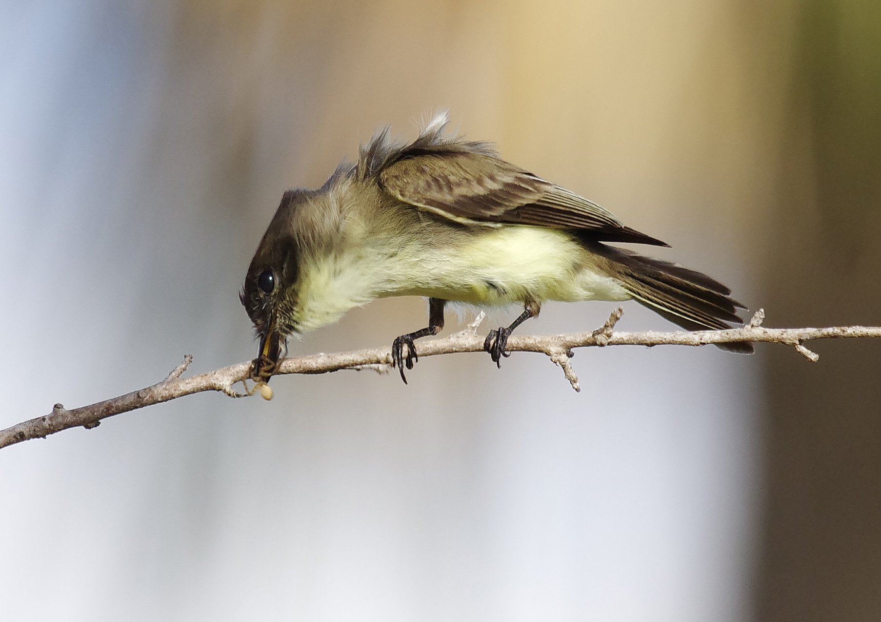 It's been so busy this last few days that I could hardly keep up with the bog, the editing of pictures and of course, the trips out. Tomorrow is the end of the stay and I will be very sorry to leave. I have had a tremendous time and the surface has only been scratched. The Eastern Phoebe has been a bird seen on this trip more than I have on other visits and I am assuming that at this time of the year they are common. They are also a difficult bird to get a good photo of due to their colouration. Basically smokey grey and very faintly yellow but mostly white on the belly. This one was perched on a low barbwire fence surrounding a paddock by the roadside on Sheridan Street way out west. I was able to photograph it from the car as it fed in typical "flycatcher" style which of course is what it is. It is also a pretty, quiet unassuming little bird that when I have seen them, seemed focused on the search for prey. An update to this post, having just returned from my usual early morning walk, I photographed a pheobe dealing with a nice juicy spider and it makes quite a shot.