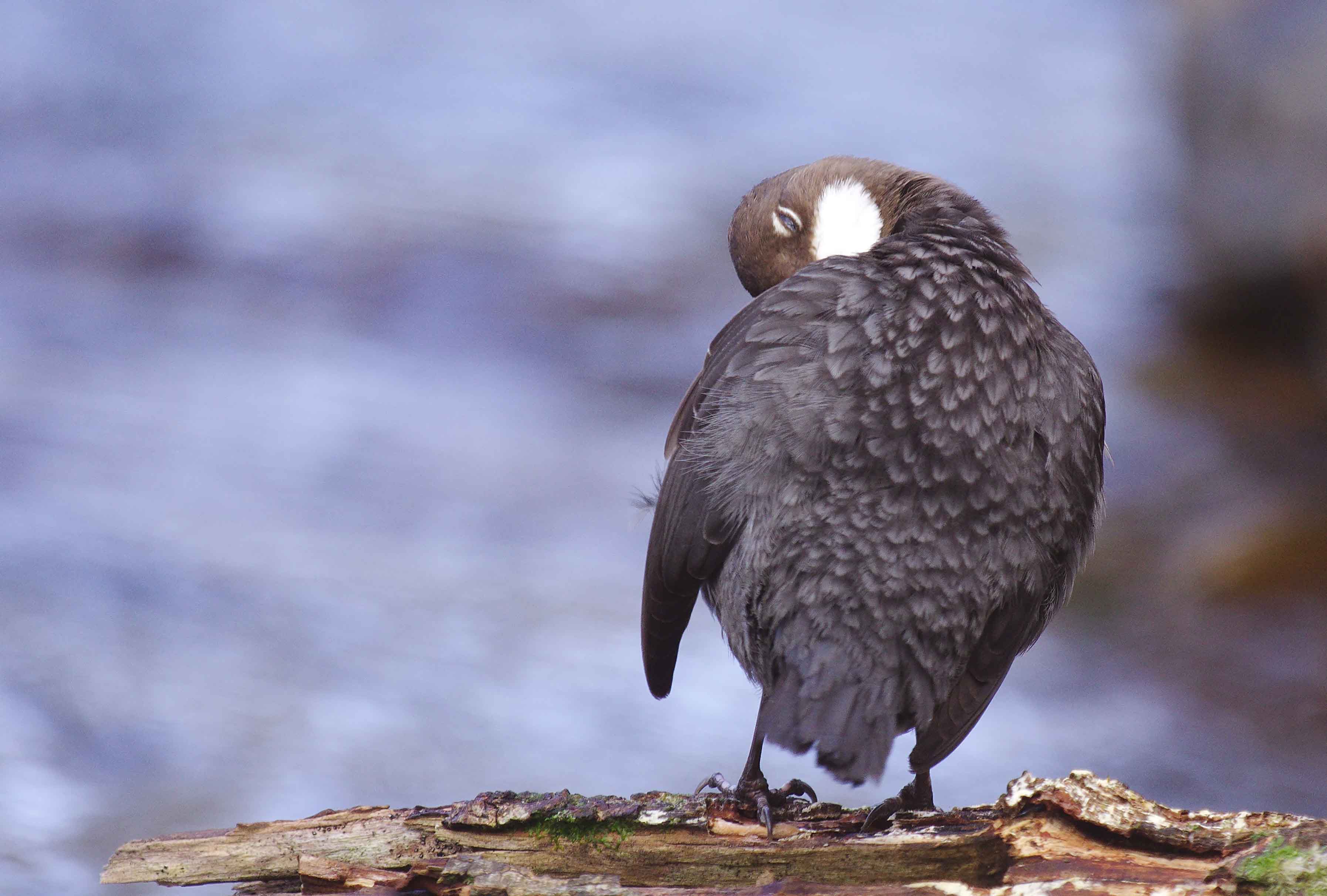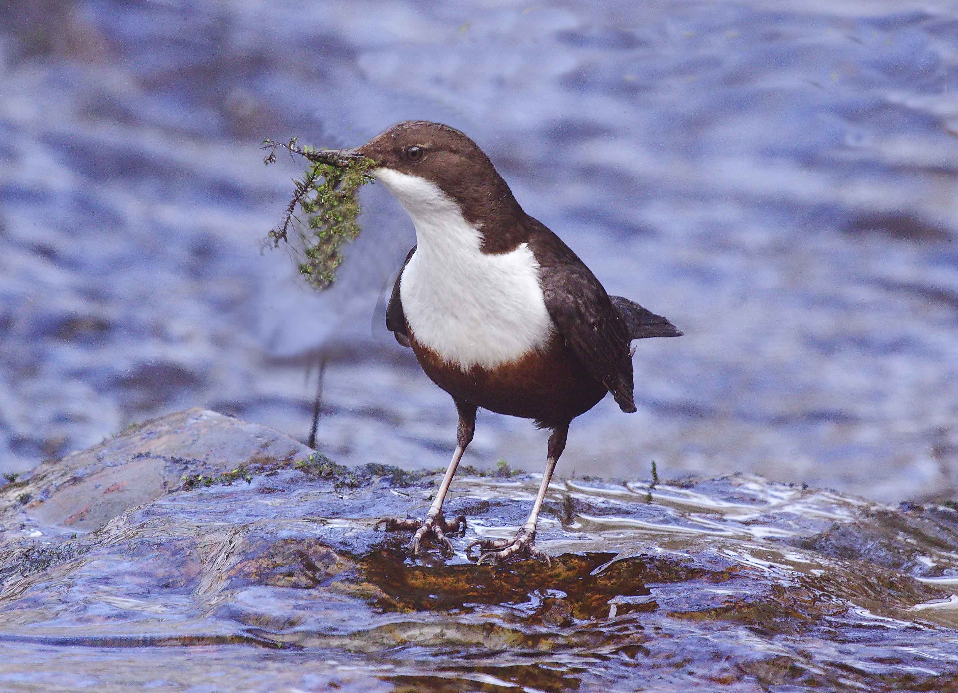 This is the female Dipper who arrived at the teritory to add some material to the nest. You can clearly see that the female has a slighter less "cobby" body. Compare to the male below which also shows the white eyelid and lower white orbital ring.When the eye is closed this white eye lid flashes and is thought to act as a signal to other dippers in the area. Another very interesting feature of this species.
