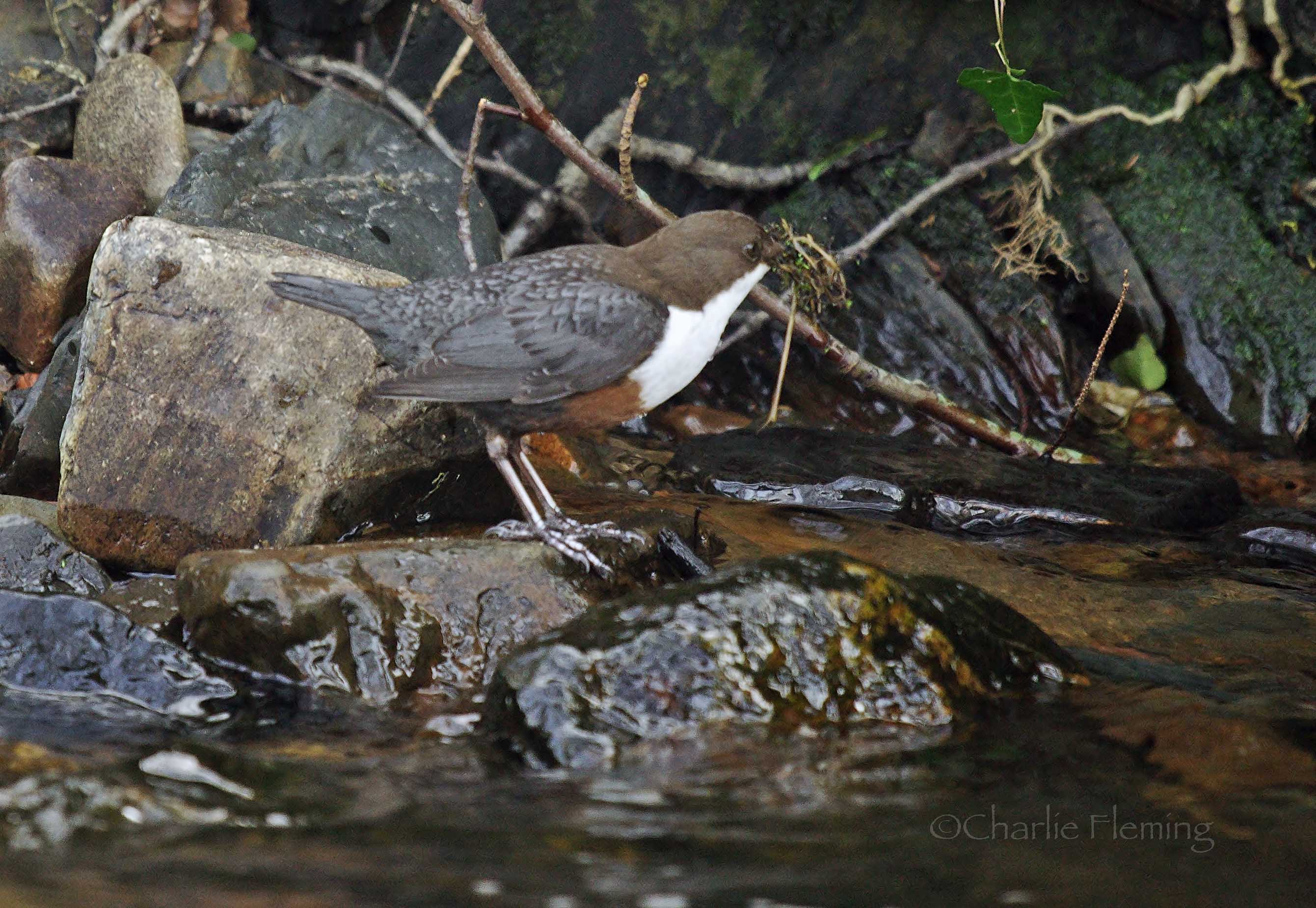 Continuing on from yesterday, I returned to take up my position by the new nest site. It made sense to approach from another direction and I was interested to immediately see a Dipper on the stepping stones that I was about to cross. It flew in the opposite direction and I suspect that this was a bird from a different territory and not my breeding pair. I arrived up river at the spot where all the activity was yesterday  and immediately saw that the female was perched just beneath the makeshift hide that I had put up before I left. It soon became obvious that the area that they were interested in was just below me because several times a bird came and went with nesting material.  I was not learning anything though and that was the idea of today's session. I was trying to find out exactly where the nest was. When I thought it was safe to do so, I left the scene taking my gear with me.  I had been studying the opposite bank  while I sat there and came to the conclusion that I would have a better view of what was happening from the other side.  Off I went and half an hour later, I was covered up in camo gear and watching, now from the opposite bank. I have noticed, both this year and last, that all nest building activity seems to take place in the earlier part of the day and in all my watching I have yet to see any building activity after 1pm and it was now way past midday.  I was pleased therefore when at 12.38, the male noisily arrived singing and chirpy with a beak full of moss.  I watched him intently and with the excitement that comes with real interest.  I  thought my question was going to be answered  as he flew to the rock just beneath where I had been sat earlier.  I expected him to give up his secret but then, frustratingly and inexplicably, he flew back up stream without depositing his building material.  I won't tell you what my reaction was but just lets say, I cursed! Then, probably because of their habit of feeding way up stream in the afternoon, as I have already explained, that was the last sight I had of Dippers today even thoughI remained for another 3 hours.