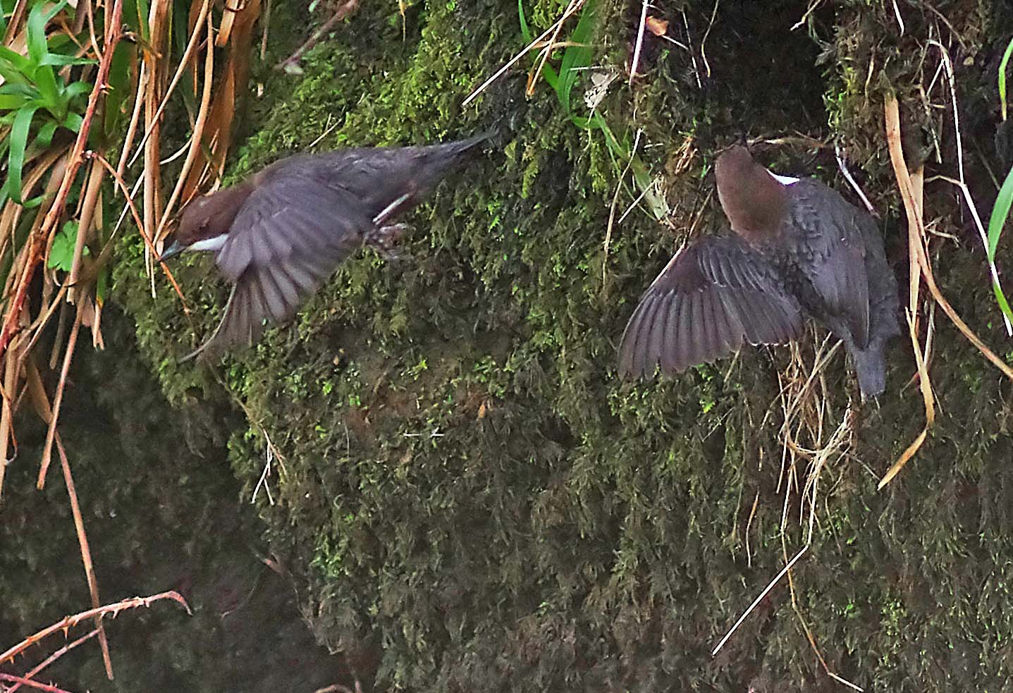 Nest building continued today, Thursday 8th March, one week on from first discovering this nest site. I arrived at around 10 this morning and both birds took an equal part, building until just after 1.00. There was nothing different about today, mostly moss and the occasional piece of grass were brought. Moss is gathered from boulders high and dry or sphagnum moss from the dry bank. The male seems to have a preference for sphagnum, the female gathering mostly aquatic moss. At one point the male responded to an alarm call from the adjacent woods, he left the nest and perched on the rocks beneath and then sounded a musical call of warning to his mate and they both departed. I suspected that there was a Sparrowhawk nearby, I looked around but couldn't see it for myself. I undertook a count of visits to the nest for an hour between 1120-1220 both birds between them visited, with nesting material 17 times. A pattern of leaving the nest seems to be developing, as soon as one of the pair arrives, the other bird immediately flops in to the water beneath the nest and then swims down stream to a nearby rock before flying off to gather more material. On some occasions the male would instead, fly upstream returning quite a while later.