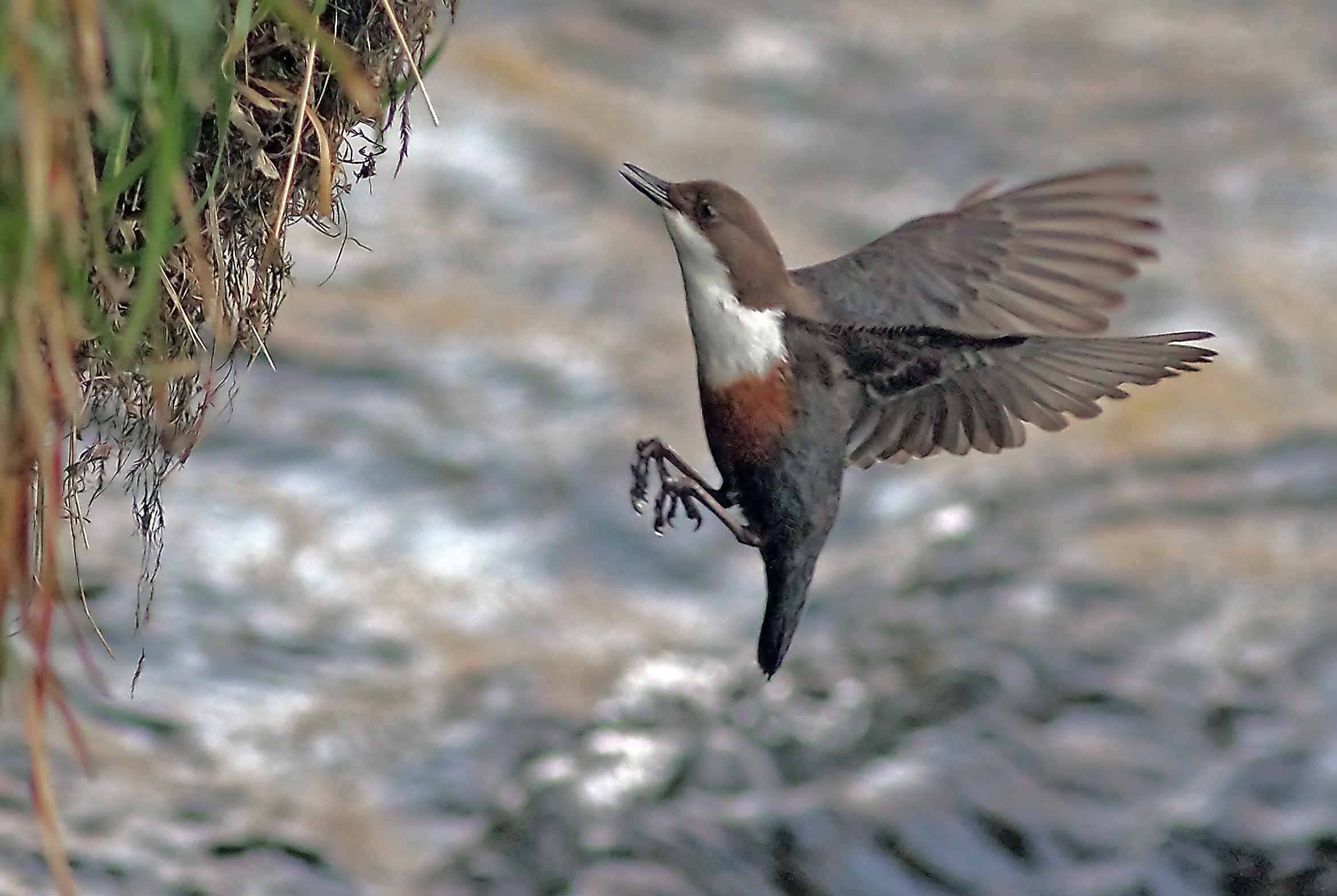I observed a couple of interesting pieces of behaviour this morning. The female is very quiet in everything she does and when she is the Dipper that I can see in front of me, I am quite certain that it is her by her quiet demeanour. This morning for example I saw her slip out of the nest and then fly up river. After a few minutes a bird returned and I knew immediately it was the male, he flew in calling very loudly as normal and then immediately started singing to proclaim his territory. A minute or two later she arrived back and very quietly started to look for prey underwater of course. The male sat waiting for her, she flew to him and then they both flew off back up river together. I checked the time that she had been off her eggs, yesterday it was 8 minutes. It was around 8 minutes again when she flew back and very quietly slipped back in to the nest. I need to confirm this with many more observations over the next week or so, but it appears that the birds have an "internal clock" that instinctively dictates their behaviour to a strict timetable. Hence the male visits the female in the nest every 30 or 35 minutes. This morning I watched him fly up to her and make quite a noisy fuss as he communicated with her, hanging on to the nest with the majority of his body mass inside the nest. Previously I had thought he was feeding her but I am 100% certain that he did not carry anything to the nest on this occasion. It's obviously just a way of confirming and strengthening the pair bond. I managed to get some almost acceptable in-flight photos today, perseverance pays off in the end.