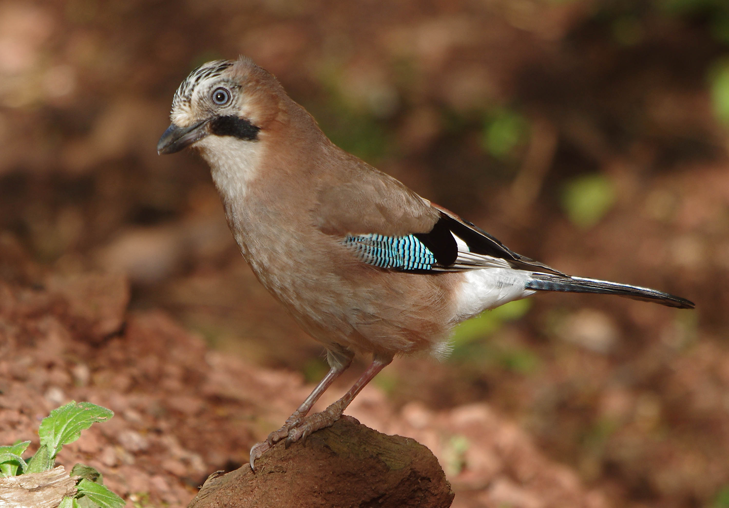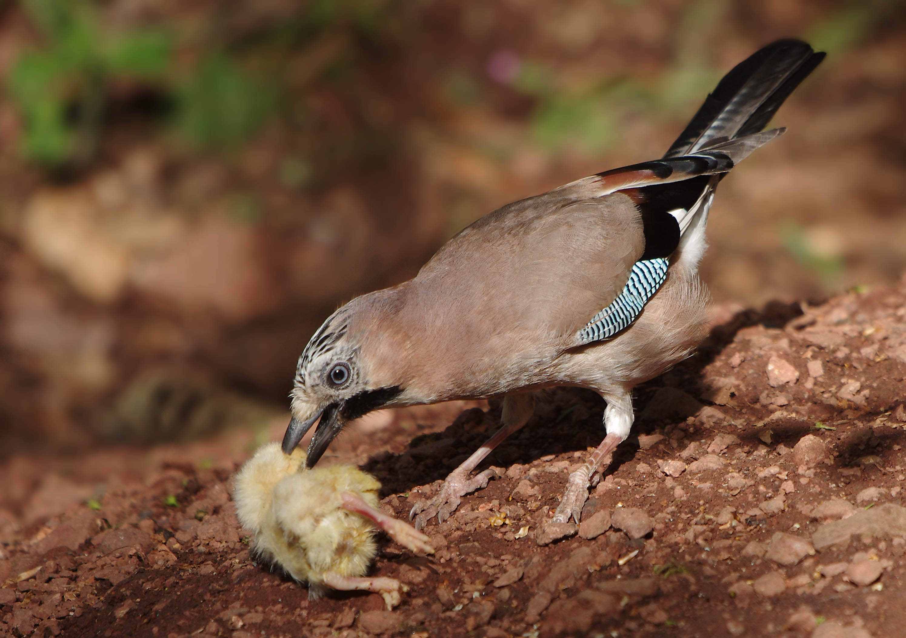 So now its late afternoon and I am back in the wood. The feeders are all empty again, I top them up, place a day old chick on a mound in front of the hide and take may place, hidden away and comfortable. The first bird to arrive was a Great Tit, then Blue Tits and then suddenly there it was, a magnificent Jay. It had landed on the log a few feet from me. I couldn't get it all in the frame. It looked around for peanuts and then flew down to the ground to pick one or two up that had been missed by the squirrels. Then it saw the day old chick and without much hesitation, went towards it, carefully had a look with an intelligent tilt of the head and then picked it up after mouthing it for a few seconds, picked it up and flew off. I uttered one of my wows, reserved for really special sightings, like fighting Kingfishers or mating Dippers! Jays are a target of gamekeepers who rear Pheasants to release for shoots, I can imagine that they must be real predators of young pheasants because this bird was extremely attracted to the chick and hardly hesitated before it took it away to eat in the safety of a high tree somewhere near.