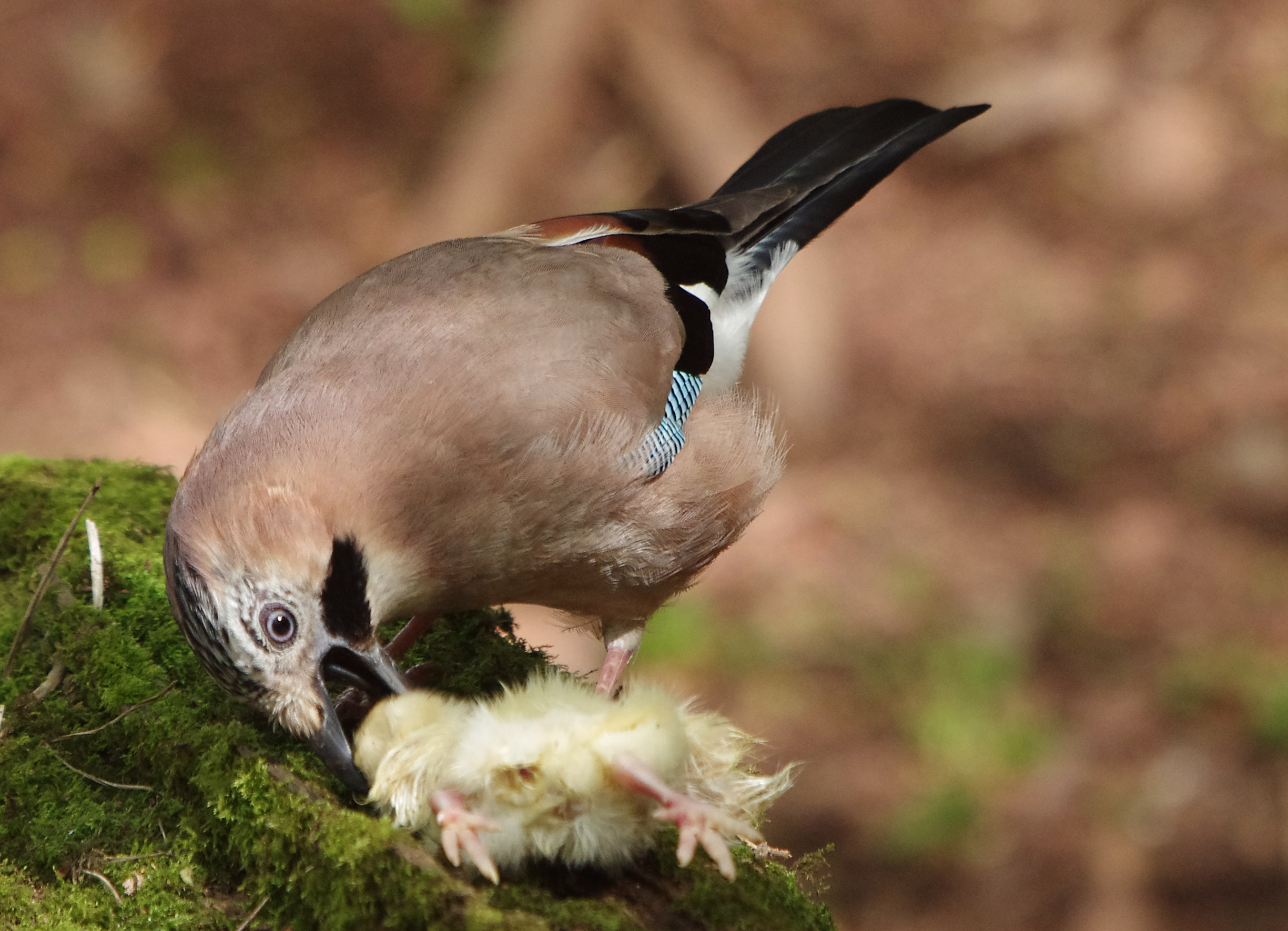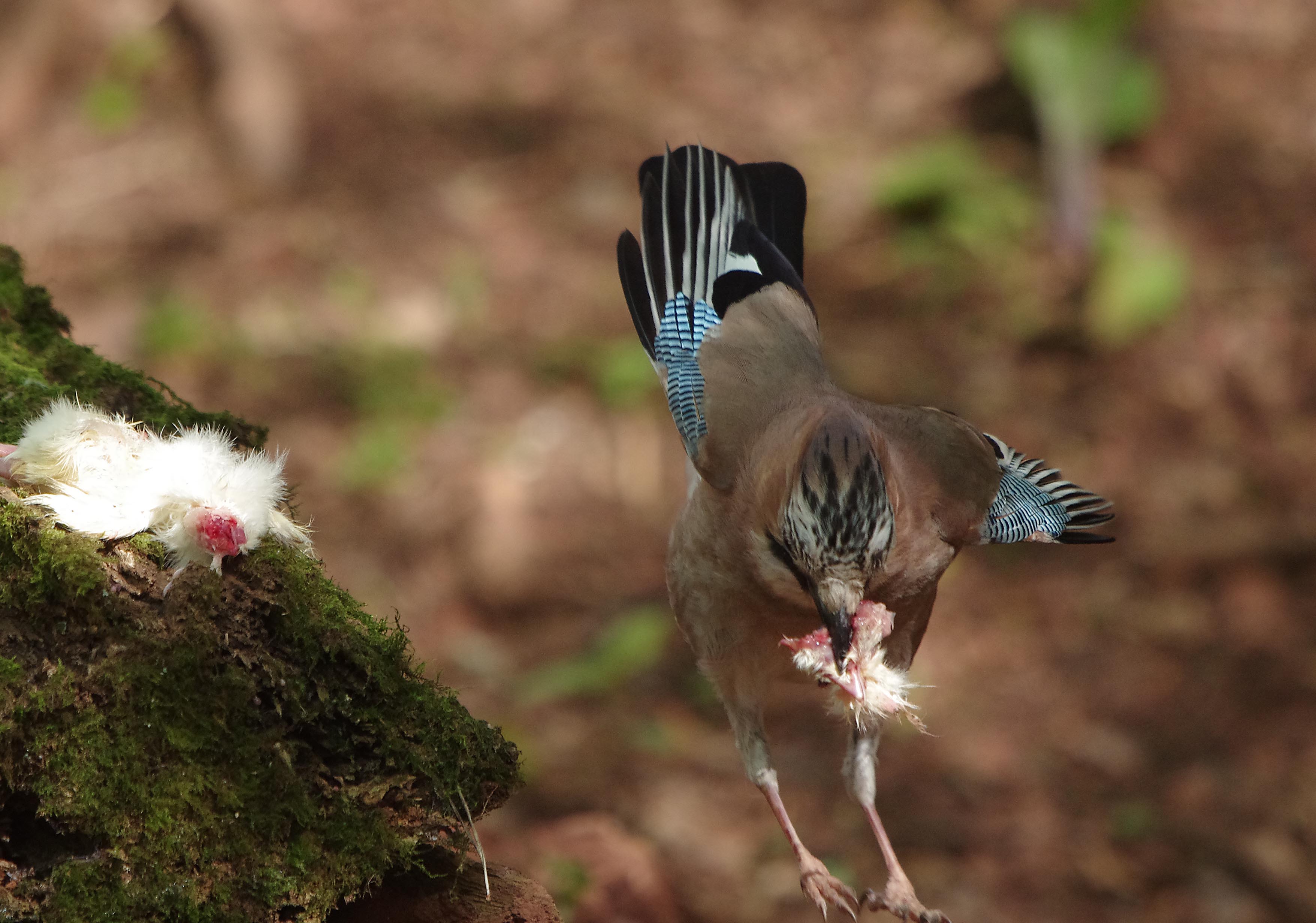 I know that this photograph may not be to everyone's taste but if it does one thing, it proves that the Jay, a member of he crow family, is a nasty bird.  It was quite gory to see how it dealt with the chick, (a frozen day old purchased froma a pet food supplier and a by- product of the laying industry).   Eventualy having torn it into mouth size pieces, it removed the head and flew off with it leaving me with a camera full of interesting photographs. for the Blog.