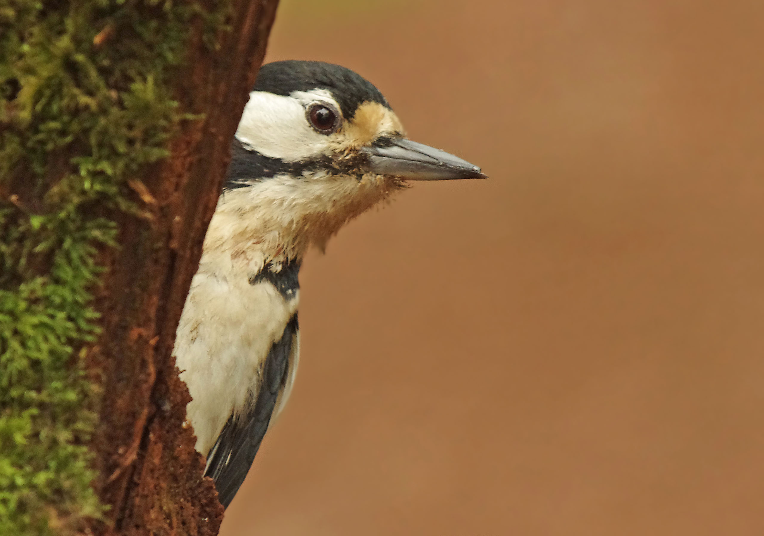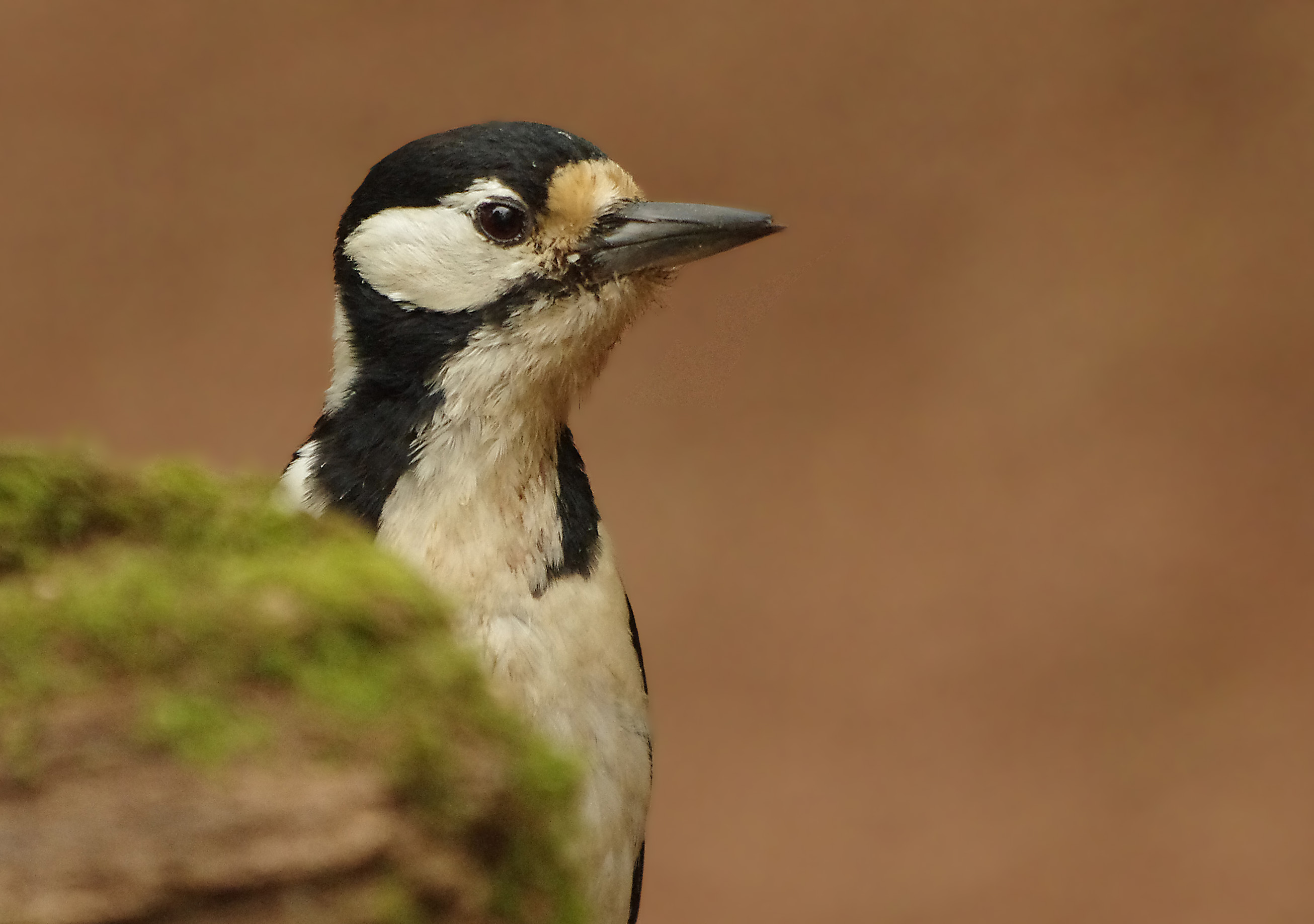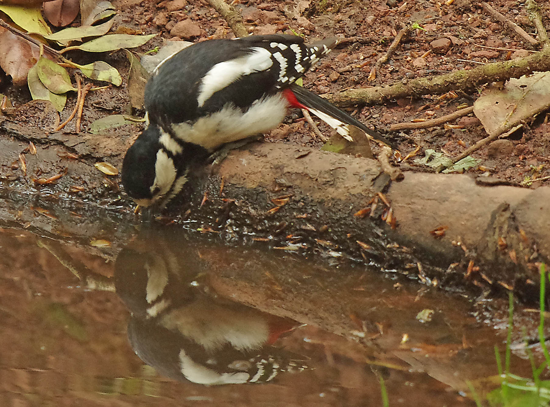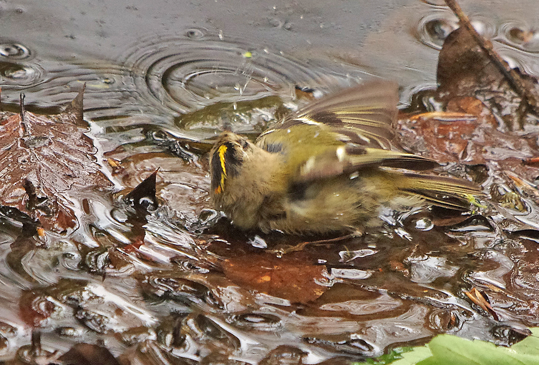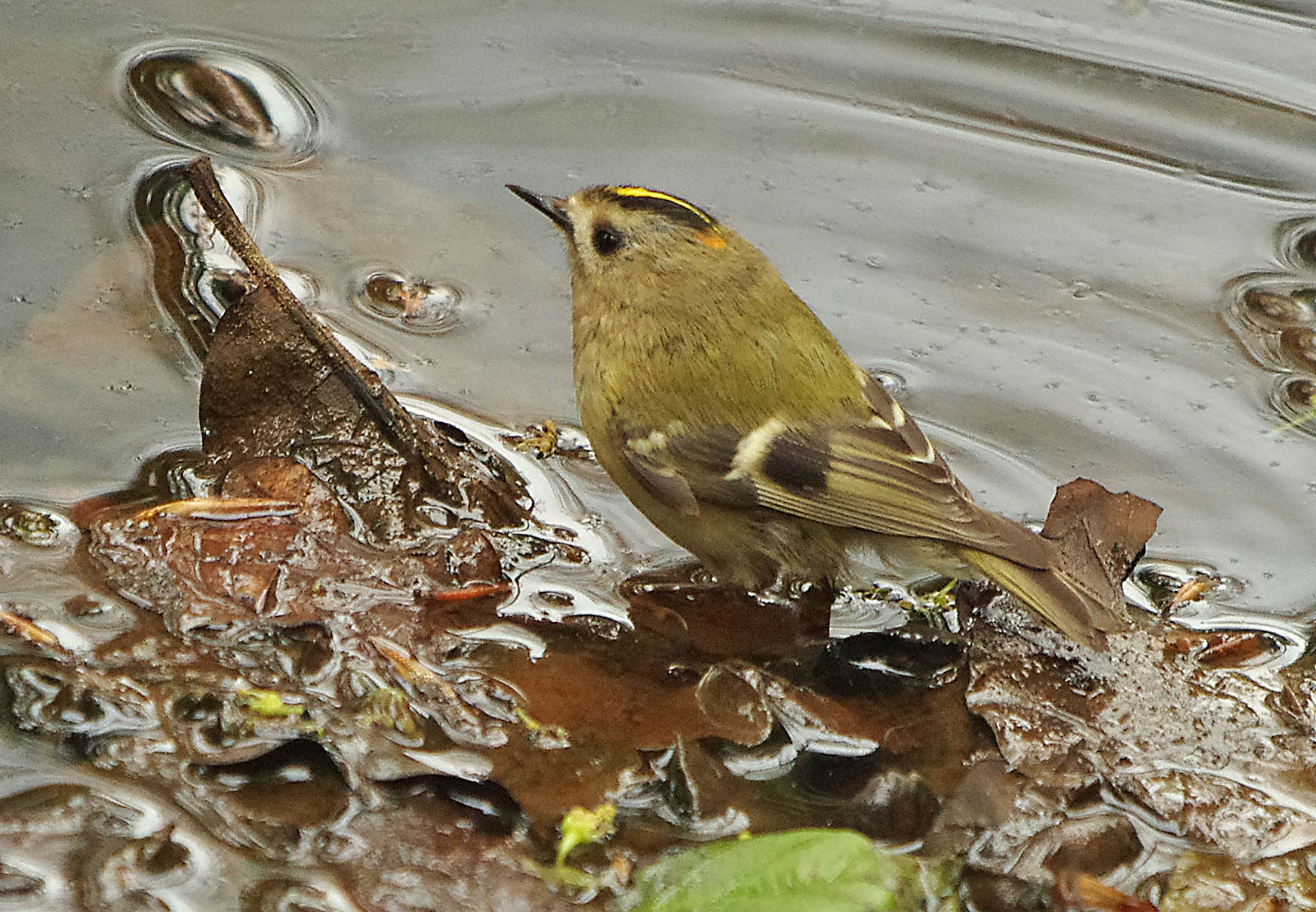 It was just incredible at the wood this morning and that's not an exageration. If you are a bird crazy amateur naturalist like me then imagine how thrilling this morning was. As soon as I had sat myself inside the hide, in fact before I had even got myself ready, a Greater – spotted Woodpecker was at the nuts. Then she…because it was a female…….. was back and giving me a great photo opportunity. But firstly let me tell you about the other exciting tiny little visitor, a Goldcrest – Regulus regulus, firstly it fluttered above the food and then it went down to the muddy puddle and started to bathe in the murky water amongst the decaying leaves. Eventually I got some good photos but a mixture of excitement and the constantly moving little bird made it hard. These birds are Britain's smallest breeding bird along with the closely related Firecrest.