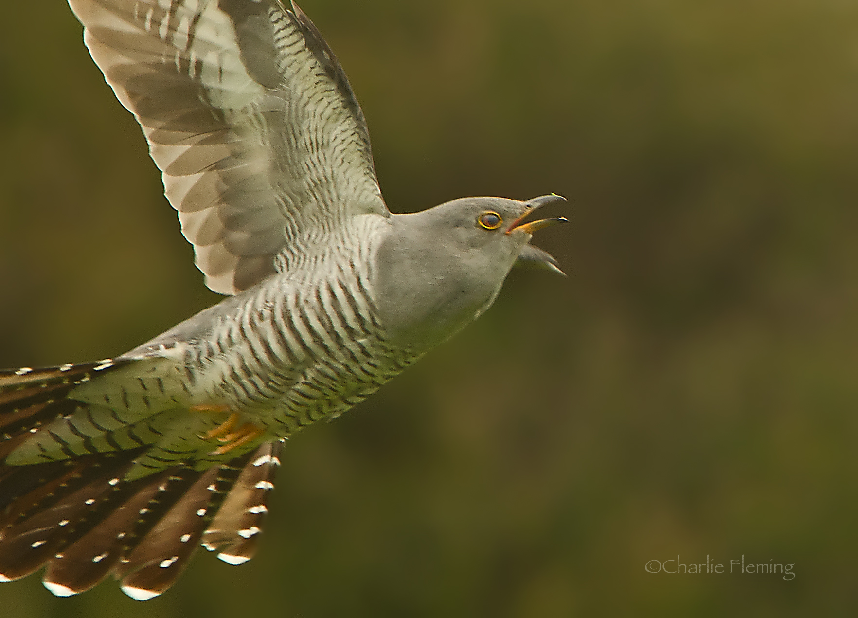 Today's Cuckoo encounter was pretty standard, after an hours wait, slightly longer than normal, he turned up as usual but seemed to get distracted from his normal behaviour at first. I had caught sight of another Cuckoo, almost on the horizon and I am sure that he was aware of it in his teritory as well. He seemed to be more intent on patroling his patch rather than feeding. I had a guest with me, Terry the owner of "the wood" and I was anxious to show him his first Cuckoo for more than 50 years. So what a thrill when he turned up and I was able to share the experience with him. I felt especially pleased because the bird even landed (eventually) where I had predicted he would. He did his usually bit of feeding on the grass as well which gave Terry just brilliant views. I snapped off a few photos for the record but it's hard to get something different than I have taken before. This one was closer than normal and I couldn't get it al n the frame.