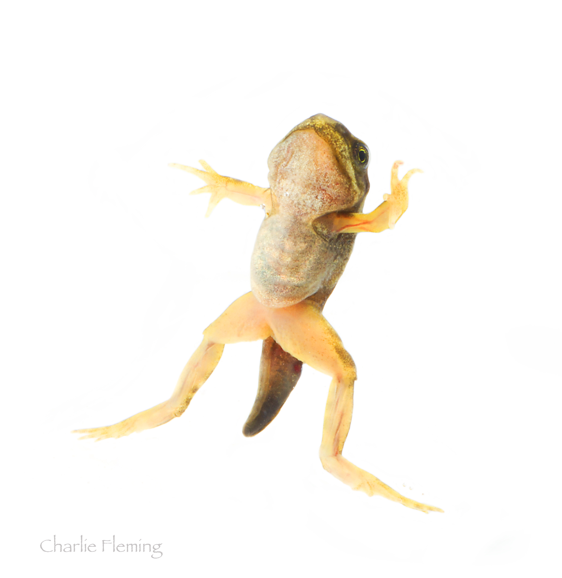 This is an interesting picture, it shows a tadpole, now almost a frog but still sporting the distinctive tadpole tail which is the only source of mobilty in the first stage of their life. After the legs are fully formed and the lungs developed the froglets climb out of the water and start the next stage of their life as a land animal, returning to the water to breed the following spring.