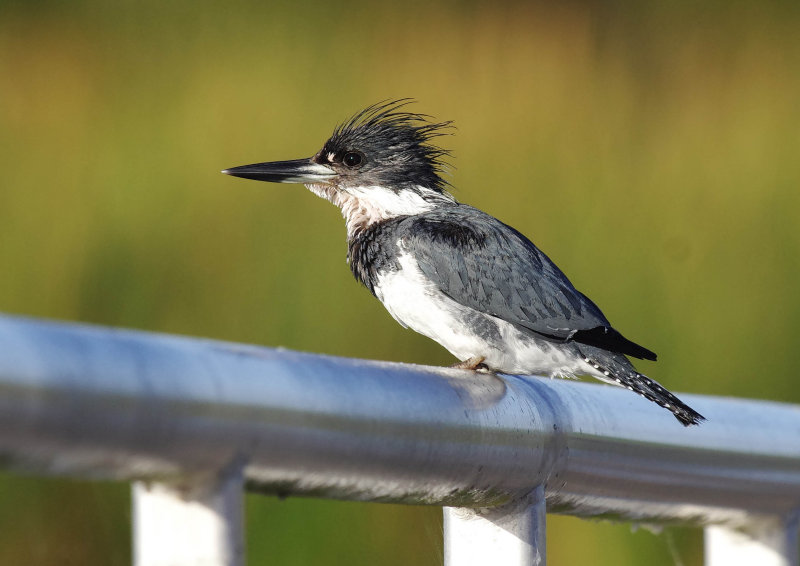 A Belted Kingfisher – Meagaceryle alcyon photographed in a carpark in the Everglades, Florida USA. This species is a large Kingfisher in comparison to the previous ones, about the size of a Blackbird.  They do feed in the same manner as the species that we are familiar with in he UK but my experience suggests that they are more likely to hover  above water as they search for prey.