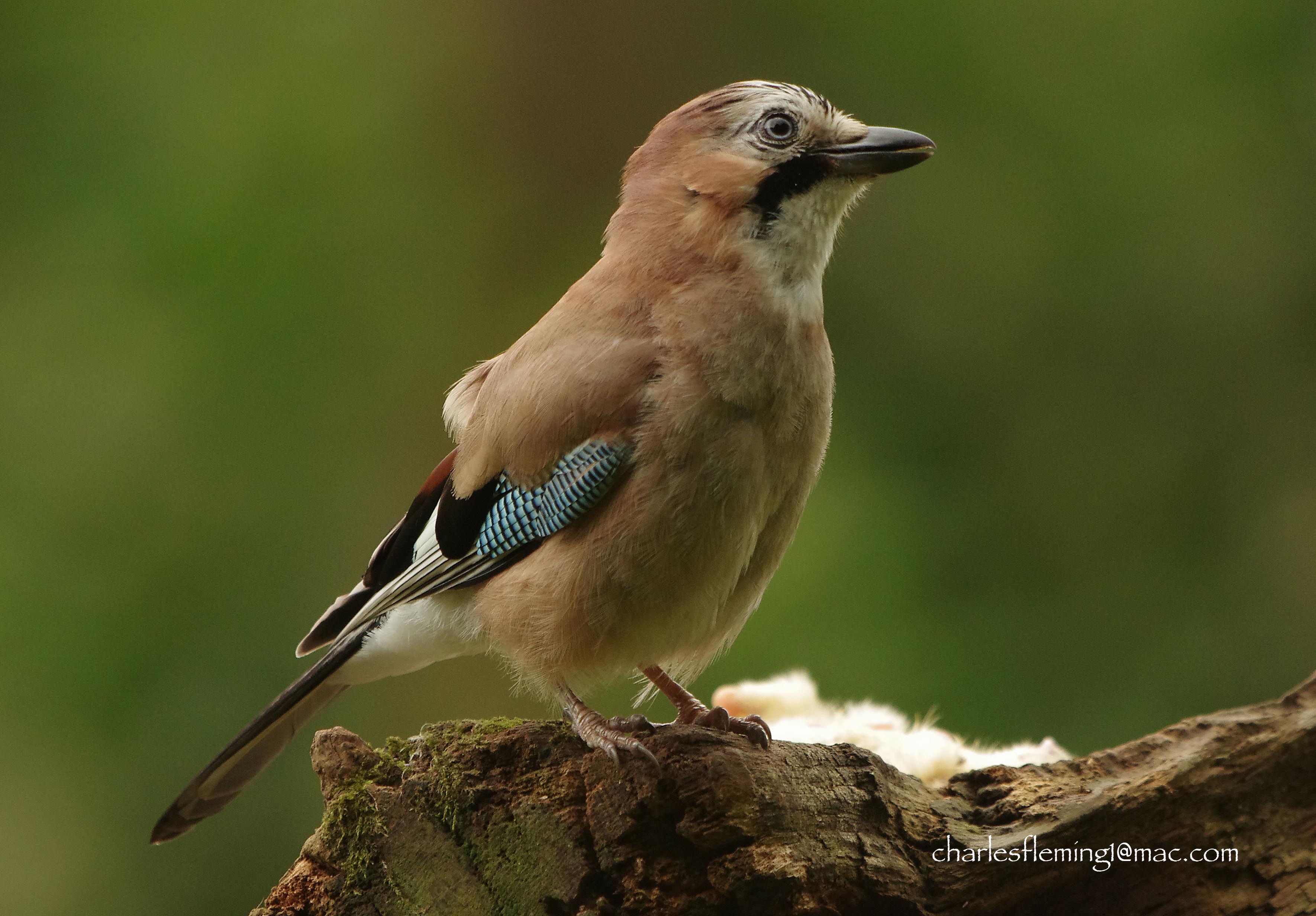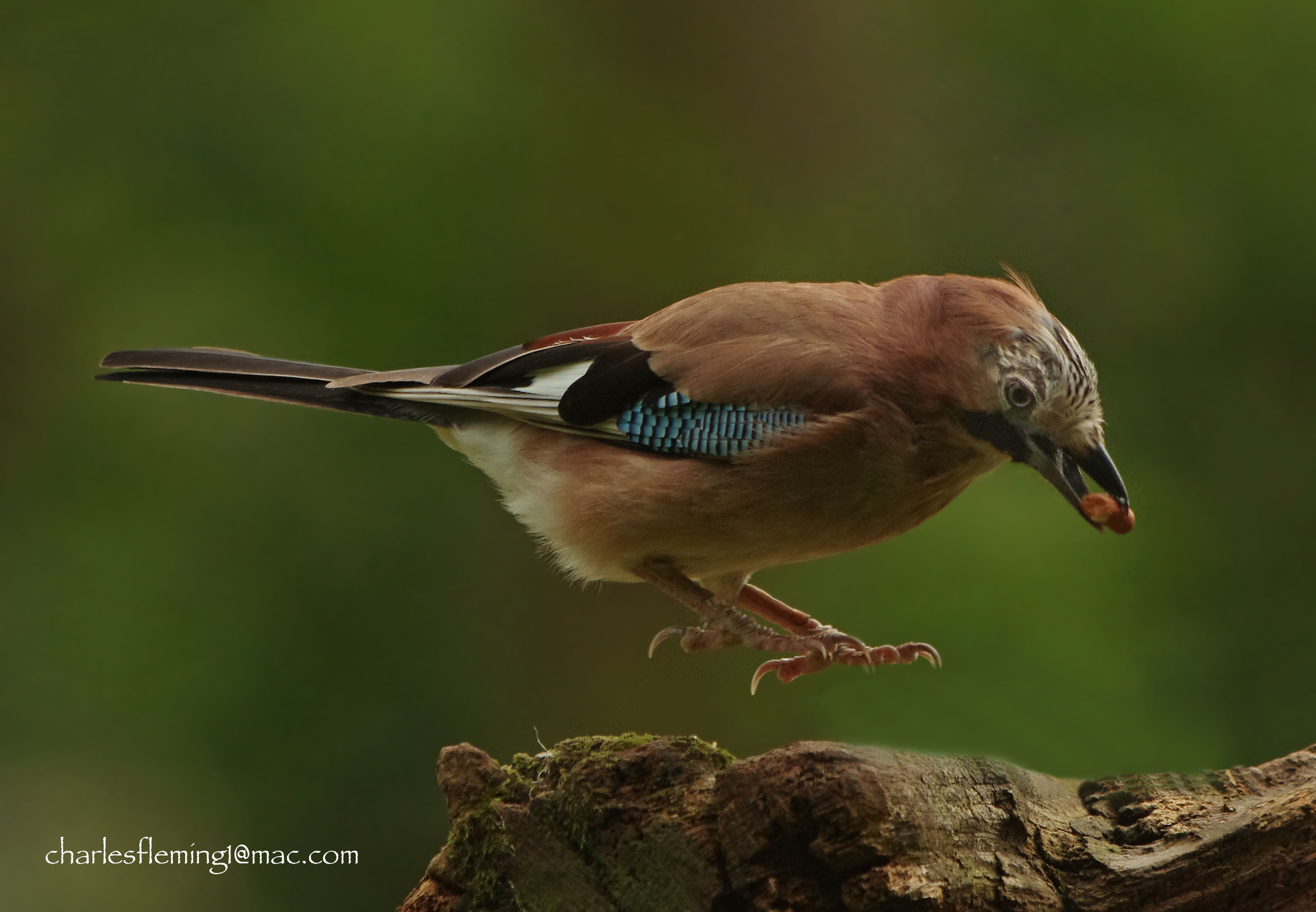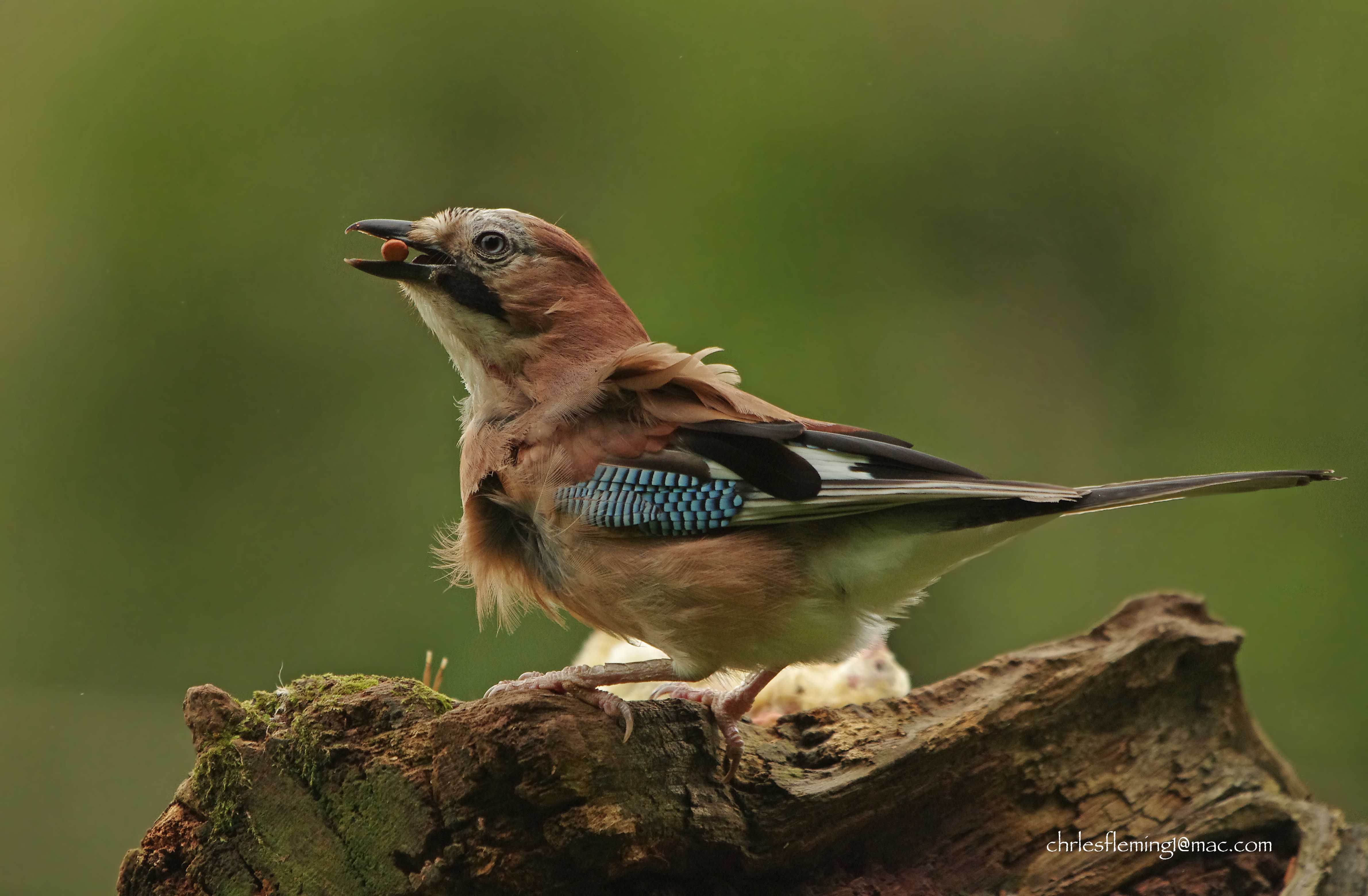 I spent even more hours in the "Hazel-hide" in two sessions today, trying really hard to capture a special photograph. Things are coming along nicely, again I had both male and female Jays, not actually feeding together but they were within minutes of each other suggesting that they were loosely moving around the wood together. I moved the feeding log back just a couple of feet which meant that I could capture all of the bird in the frame of the camera. I have been formulating a plan to get a photo in full flight which I am sure will work well, that's my quest for the next week or so. I am going to position another feeding post/log at the same hight as the other but 10 foot apart. I am sure that if I put a few peanuts on one log, and more on the other, I should be able to get the bird to fly in a straight "flight-path" from one log to the next giving me the chance to pre-focus on the flight line and photograph the bird in flight.
