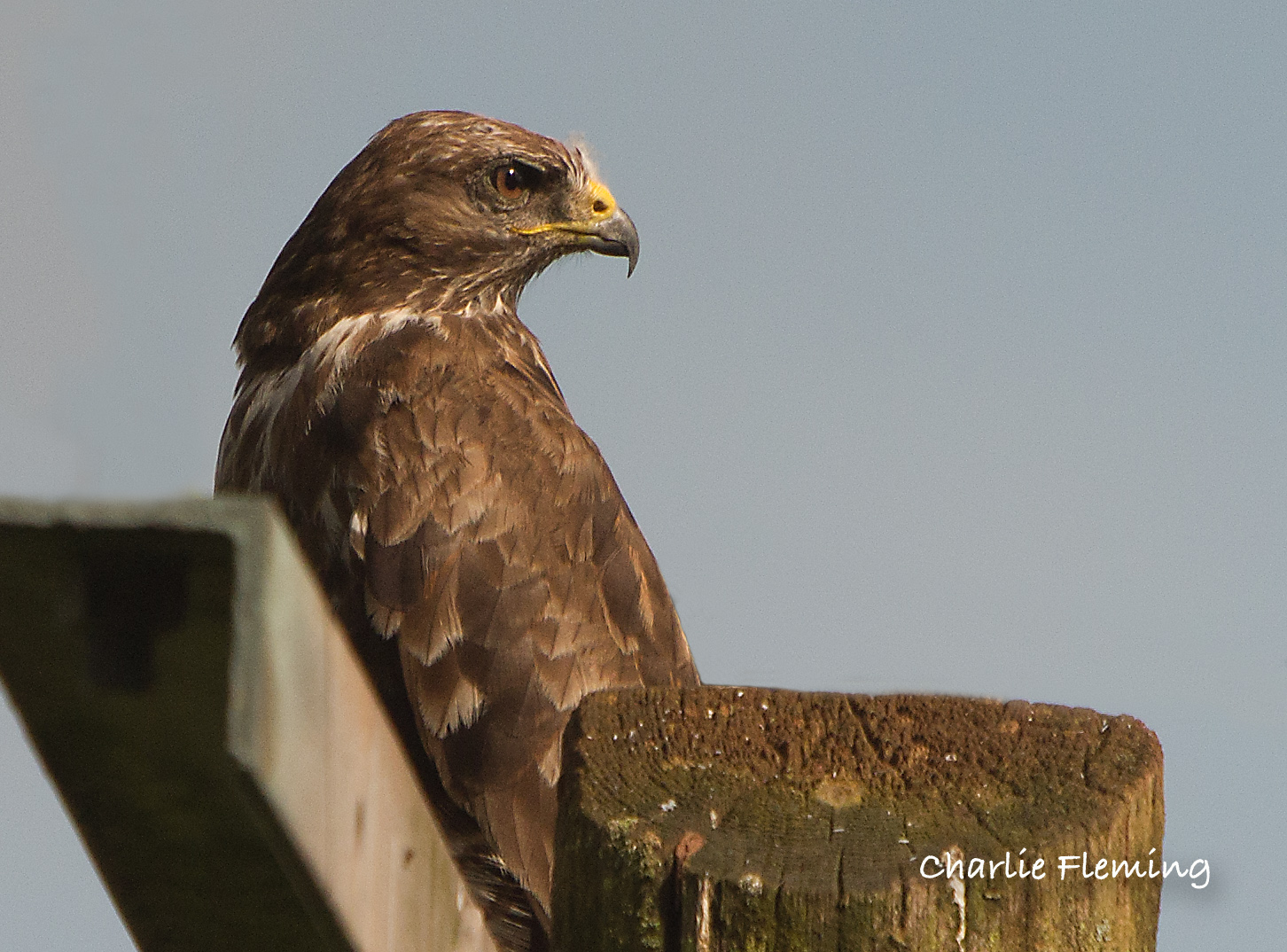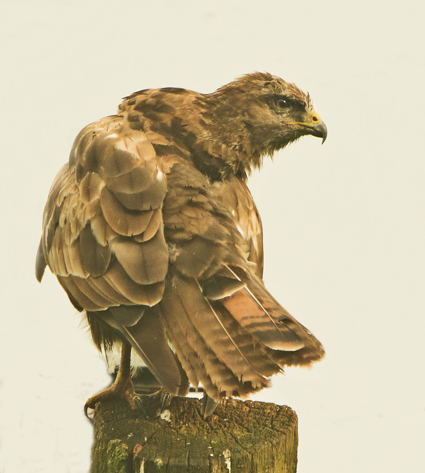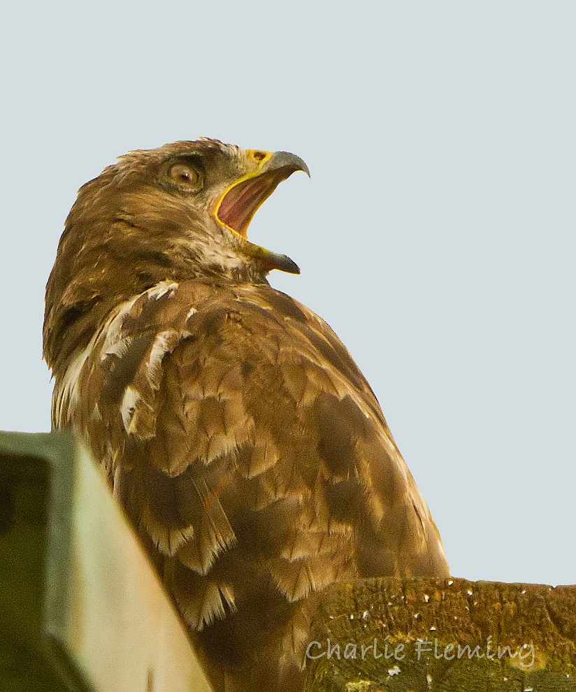 I blogged yesterday evening about the presence of the Buzzard on the free offerings in front of my hide and said that I was sure that I was going to get some success very soon. It was just after 6.30 when I got myself up and about and by 6.50 I was parked up and walking towards the hide along the edge of the wood. It was a pleasant morning and I was a bit deflated as I looked ahead not to see a Buzzard where I hoped it would be. Imagine my pleasure when it became apparent that it was actually head down and feeding on the carcass and I got very close before it flew up and in to the wood. I quickly got in the hide and started to wait with a real feeling of excitement. At 7.10 it returned and landed on the telegraph pole just in front of the hide. I was expecting it to come down to the prey and I waited and waited. The minutes ticked by and soon half an hour had elapsed and still it remained tantalisingly close as I composed the "shot" in my mind. My camo was working perfectly and when it started to preen with it's head down I quickly moved the lens to focus on to it, high at the top of the pole. The minutes ticked by to a whole hour and still it remained and that's the way it remained. Then at 10 past 10, literally 3 hours later, off it flew leaving me frustrated and disappointed but happy in the knowledge that I am sure it wont be long before it comes down to feed while I am there. As if that was not enough, during my wait I had a memorable visit from a vixen. I saw the Buzard bristle and look down at something that was disturbing it. A fox was making it's way towards the carcass. Then I blew it to be honest. I tried really hard to gaet a photo but the grass was long and the camera couldn't focus on it and noisily "hunted". The wirring of the auto focus was enough to disturb the fox and off it scarpered without me getting the photo. I should have just frozen and waited for it to come up to the free offering and then got a good shot with it just in front. If all this wasn't enough I had the utter pleasure of watching a tiny Pygmy Shrew in the hide with me. It repeatedly clambered around amongst the hazel sticks and leaves that the hide is made of and at one point with its long snout twitching up and down, clambered over my camera. A real treat.
