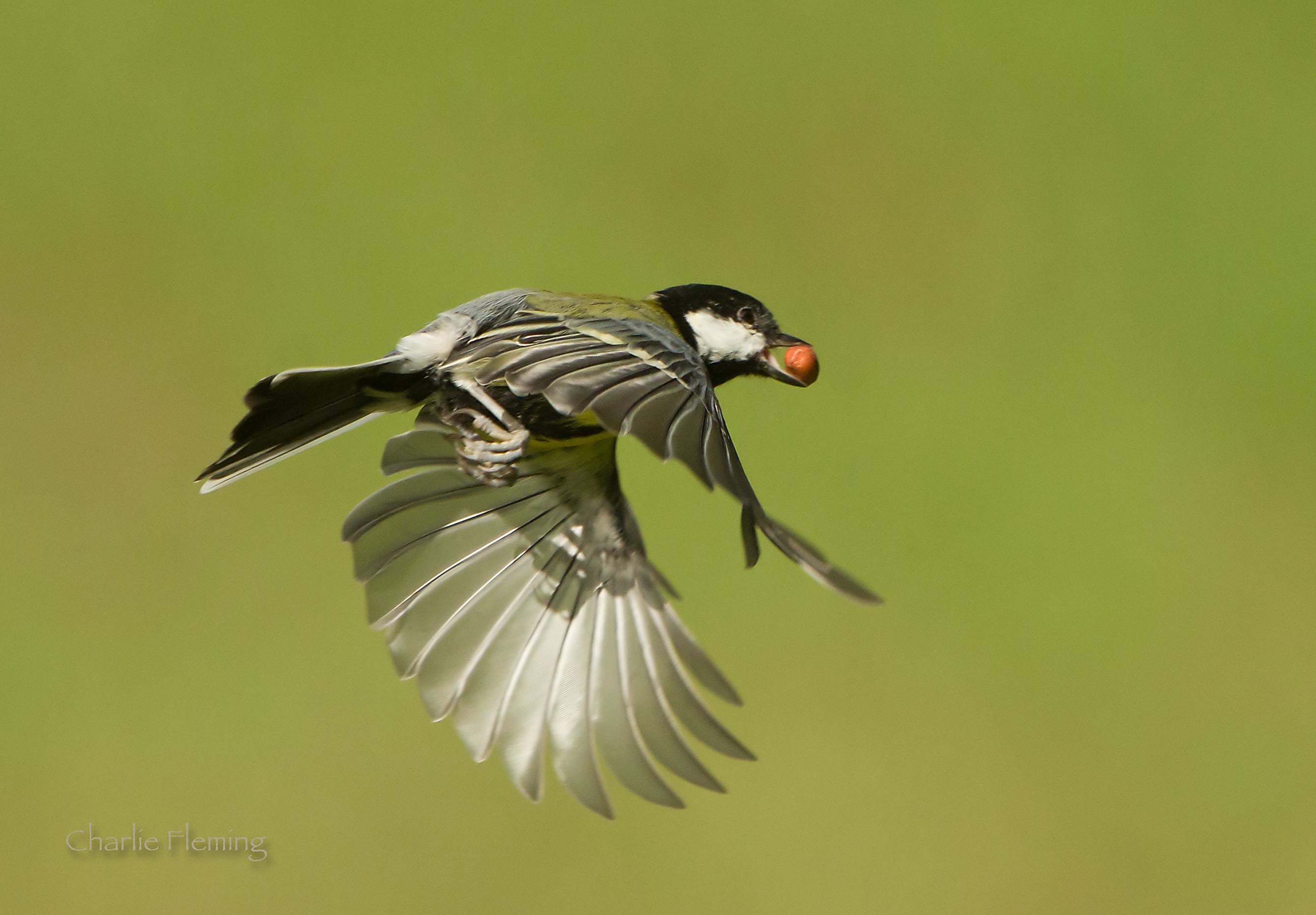 I have taken dozens and dozens of photos of the small birds in flight on the edge of the wood and in front of my hide and almost all of them have been useless, a few of them almost OK but at last I have got one that I am almost happy with. It's such a difficult thing to acheive, firstly you need a shutter speed of at least 1/3000 second and then an f.stop as high as possible to get the maximum amount of depth of field. The depth of field is important because it is hard to get the flying bird in focus if the centre of the focus point is to narrow. To acheive settings like this the most important thing is bright light. I deliberately postioned some peanuts high on an old fence post on a slope so that the background was distant. This gave me a really clean uncluttered backdrop to the photographs with the use of my 500mm lens. Then with the sun shining brightly from right behind me, all the elements were in place. All I needed was a bird or two to visit the feed and it wasn't long before they came in to the peanuts. Larger birds like Jays are much easier to get good photos of.