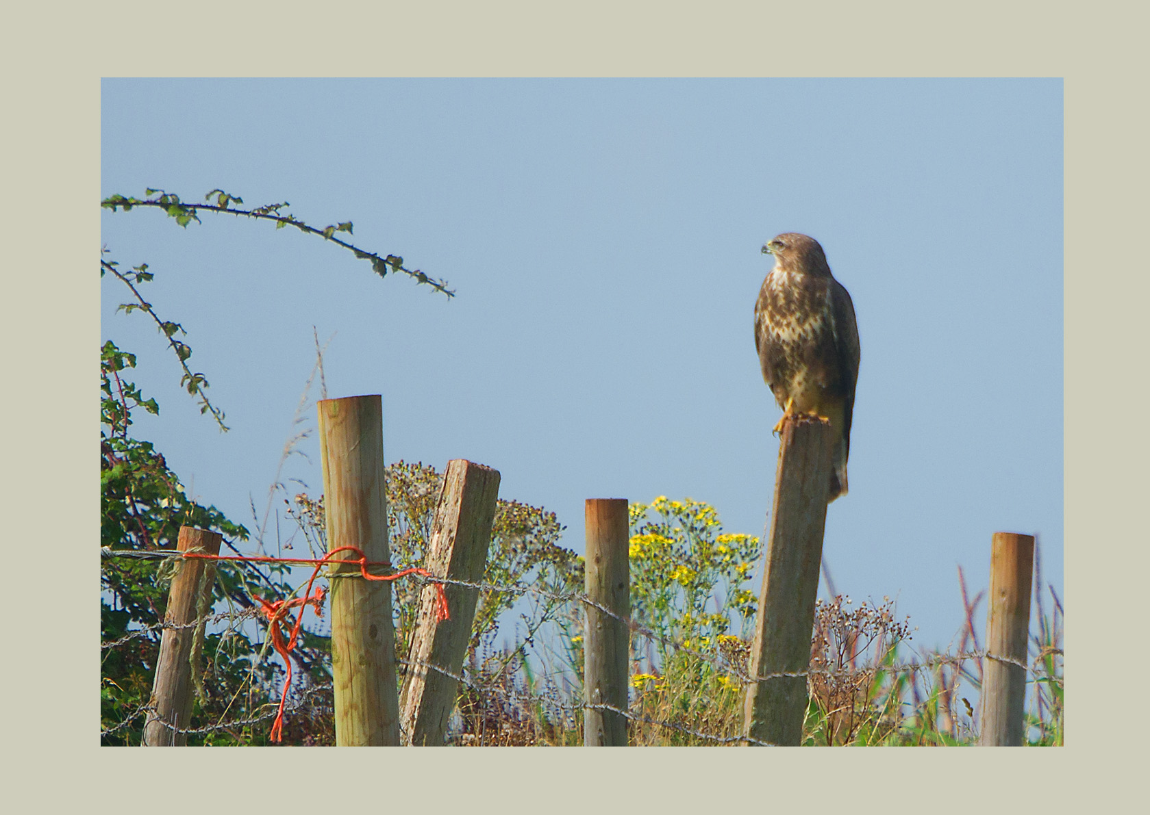 The building of the pit and the infinity pool was quite a physical job but it has already started to prove worth it. The main reason for it's construction was to try and photograph the Buzzards and as you can see from the picture at the top, yesterday I was nearly successful with one of the residents, oblivious to me, perched on the nearby fence line. From the "pit" I had a clear view and it's quite a nice photo with the yellow ragwort and brambles in the picture.