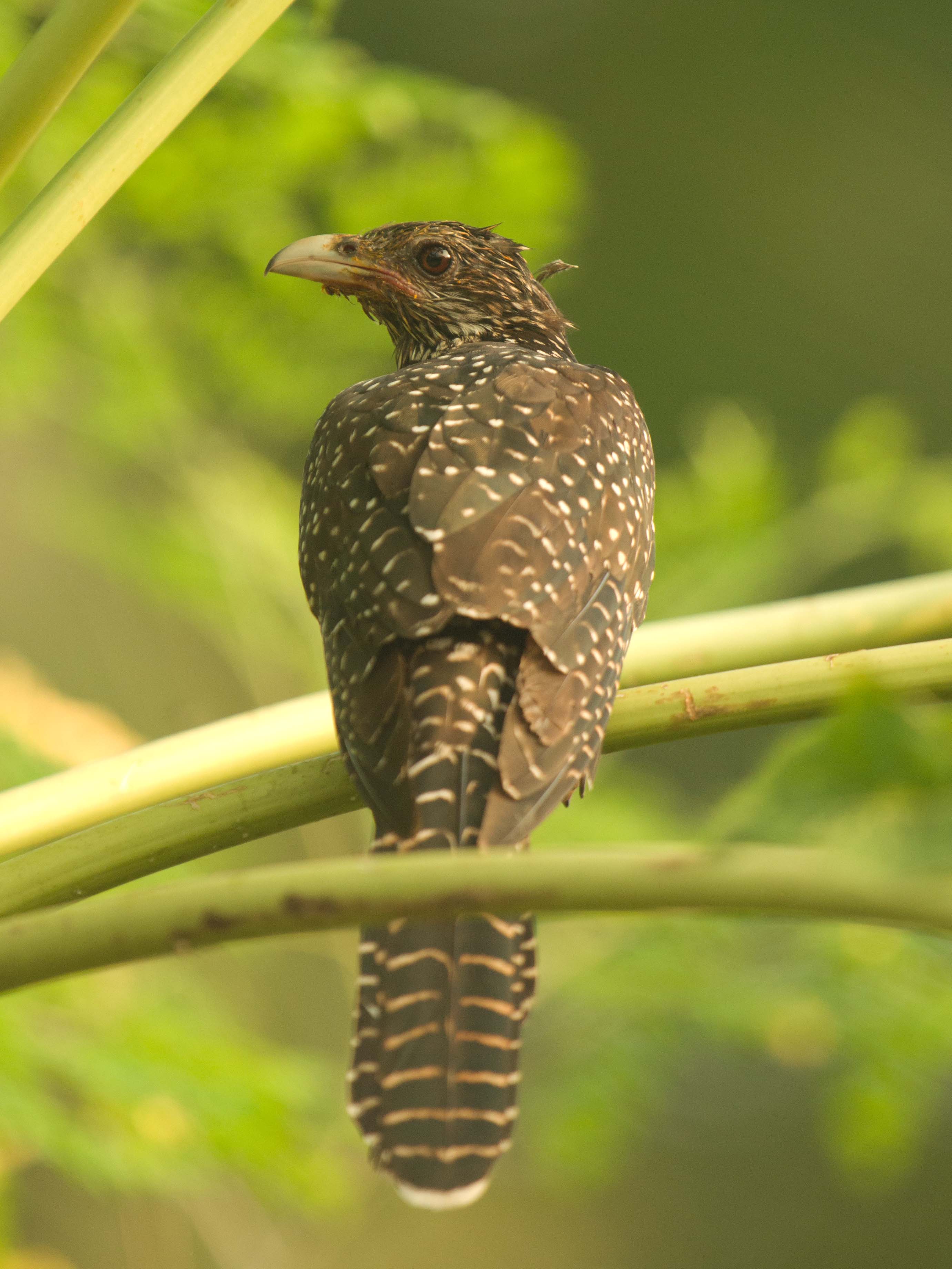 This is a female Asian Koel (Eudynamys scolopaceus), possibly a juvenile, males are all black with red eyes.