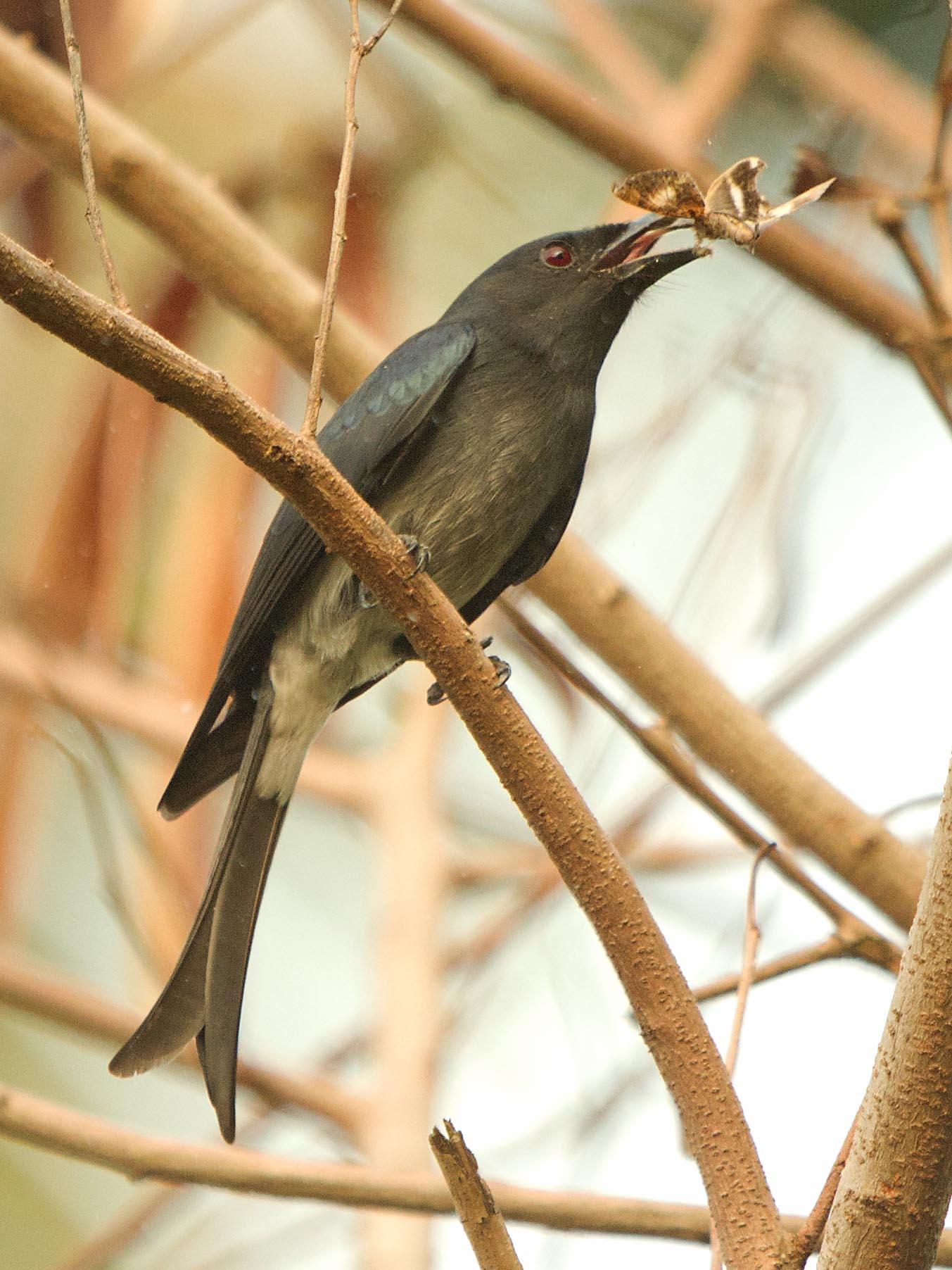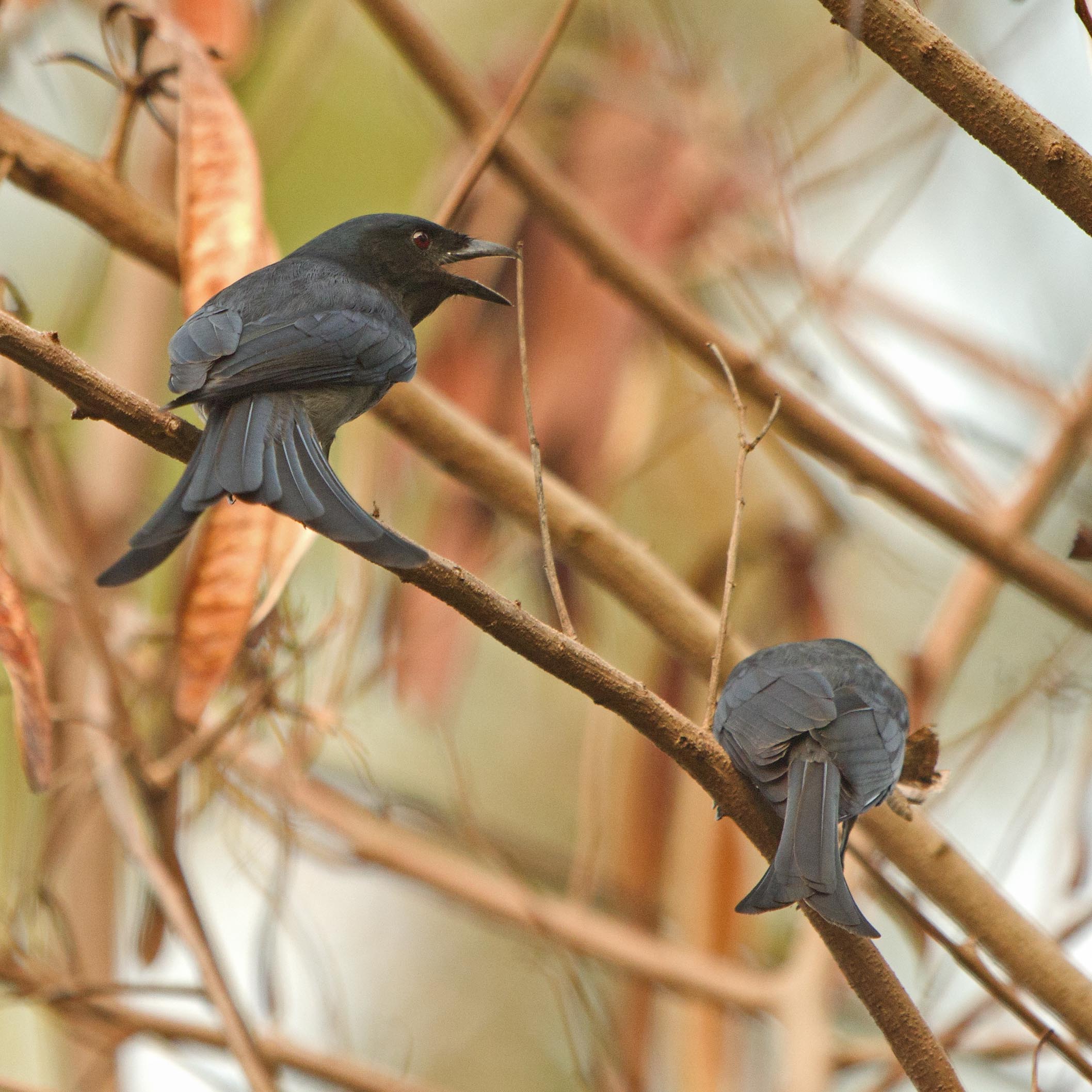 White-bellied Drongo (Dicrurus caerulescens) At first I wasn't sure of the species but a bit of research confirms it as White-bellied Drongo, apparently they can be confused with the Black Drongo (Dicrurus macrocercus) because juveniles are all black and as it happens you can see this in the image here (below) where the juvenile is on the left.