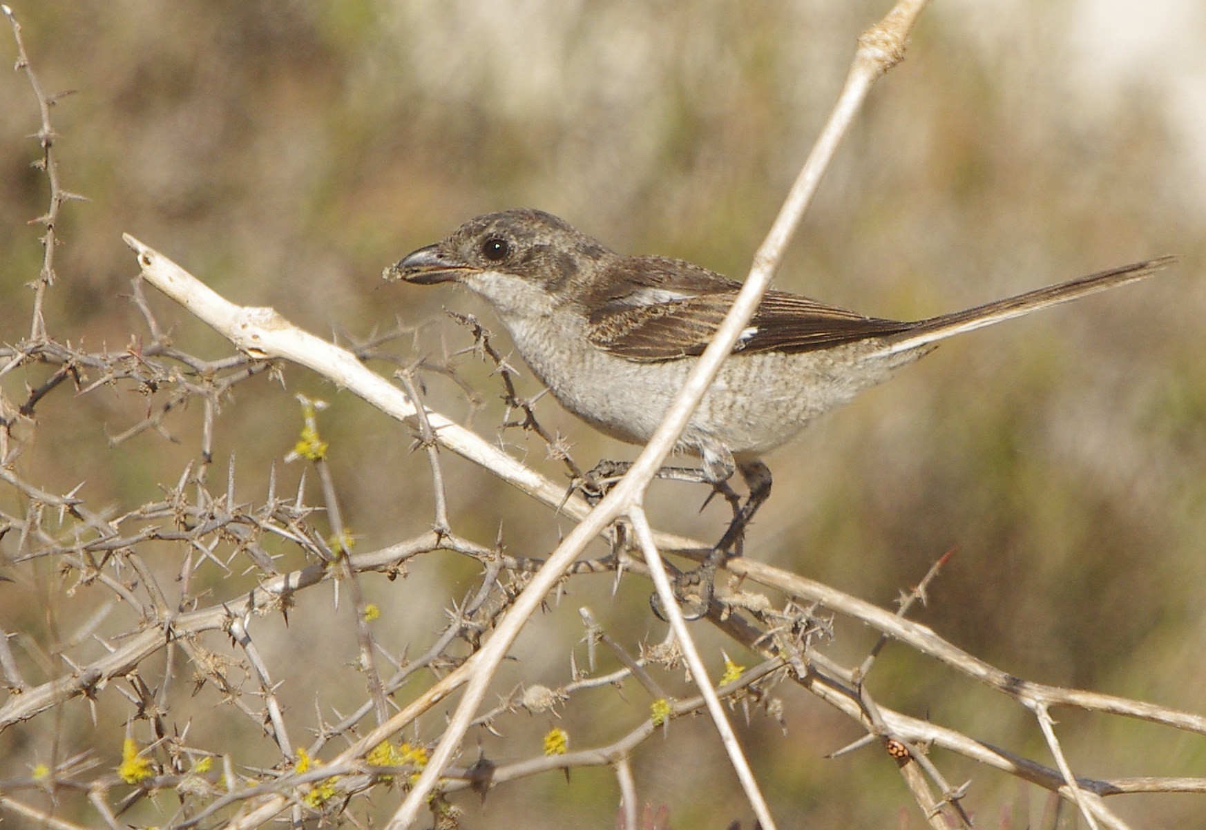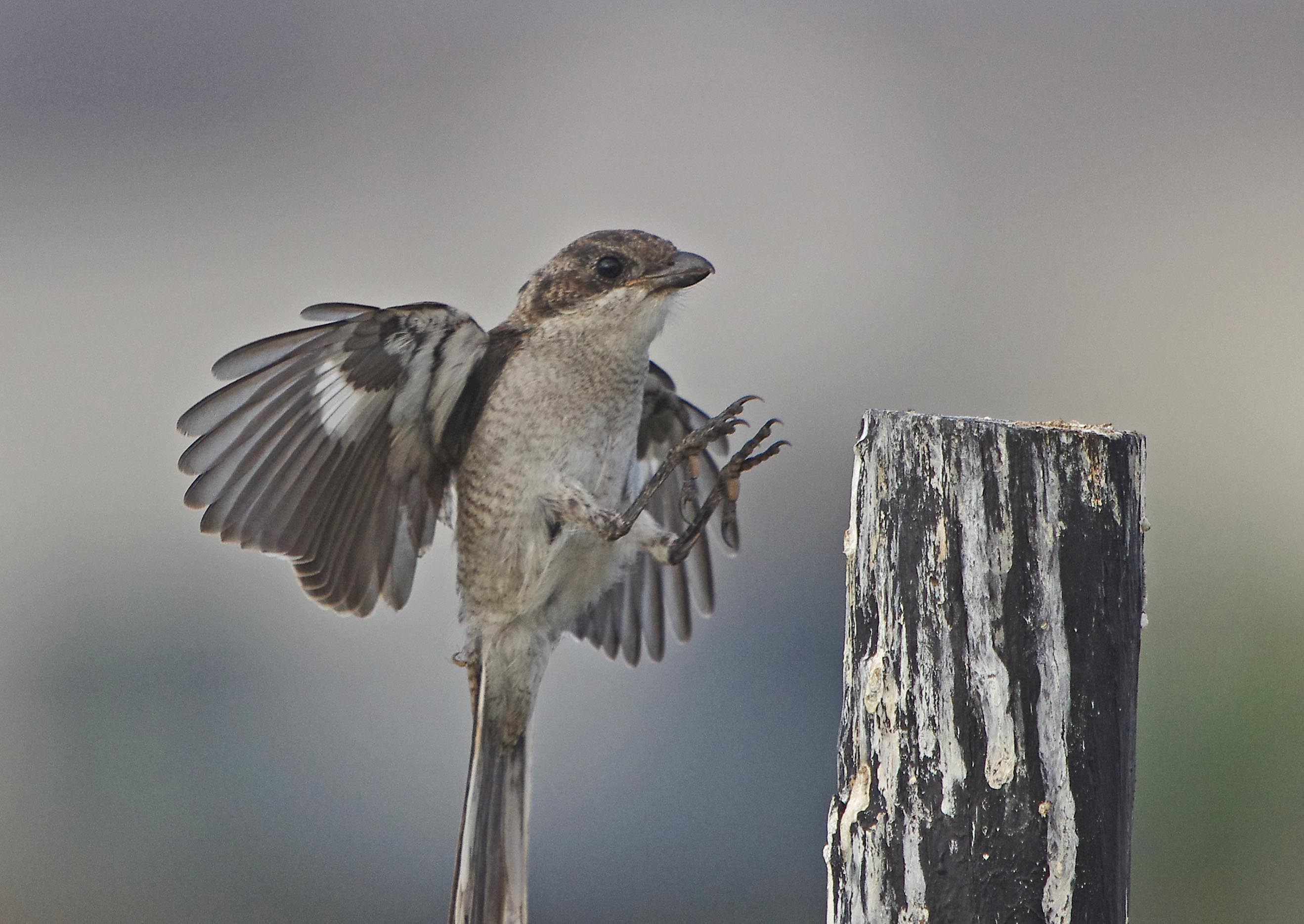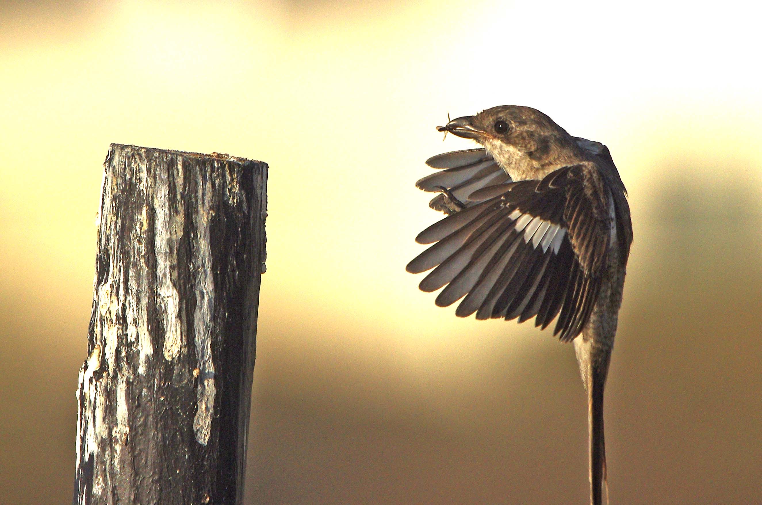 Fiscal Shrike, this one is a very young bird still brown and with fleshy gapes around the mouth. At first light on Wednesday I had great fun trying to photograph this one in flight as it carried its food back to a favourite perch.