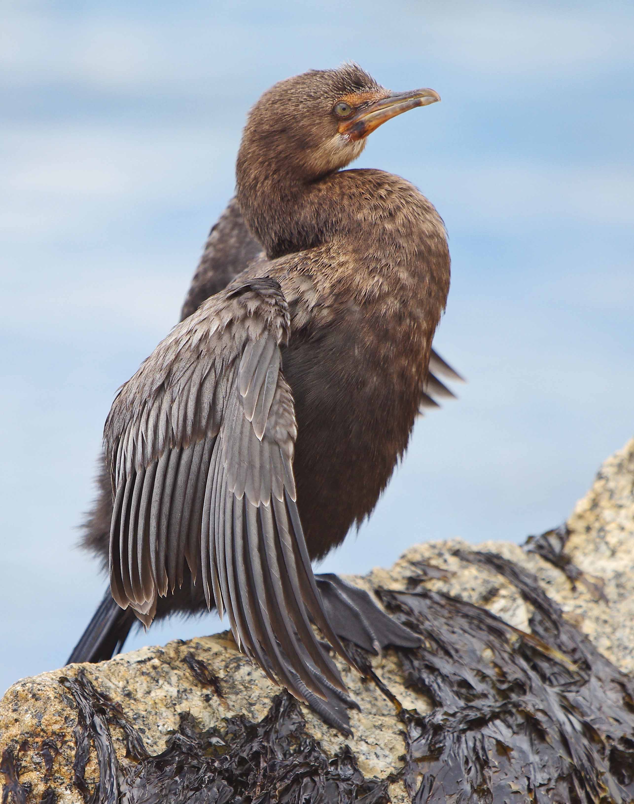 One of the attractive and distinguishing features of cormorants is the eye which are usually brightly coloured and a big help to seperating the species. The Reed Cormorant is a mostly fresh water species whereas the next species was photographed on the coast. This one is a Crowned Cormorant another small cormorant. This one is in a heavy moult and not in full colour. I found this one drying it's plumage on a jetty. This drying of the plumage is essential because cormorants alow their plumage to get soaked. This enables them to dive and swim with more ease without the feathers being too buoyant.