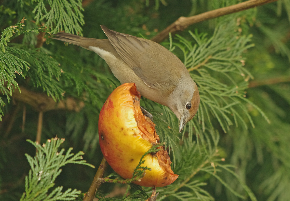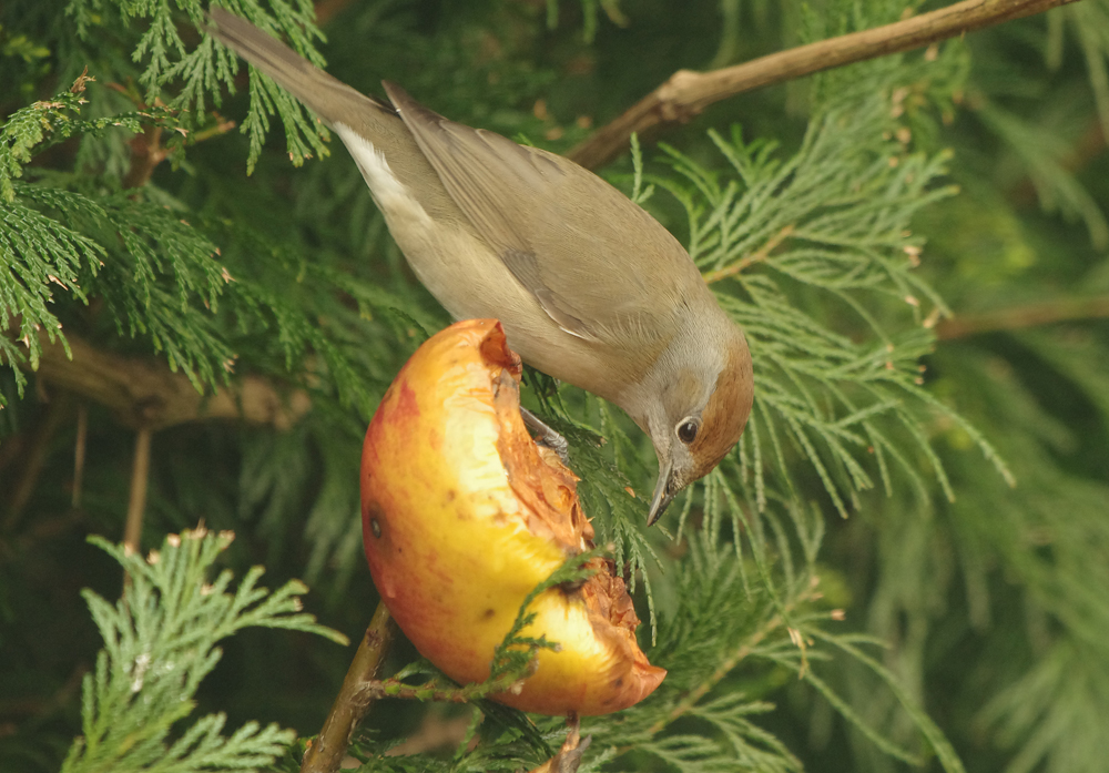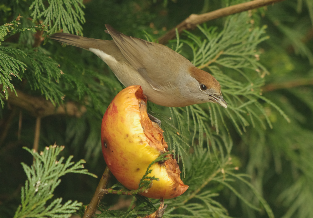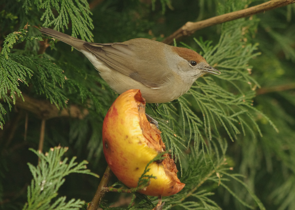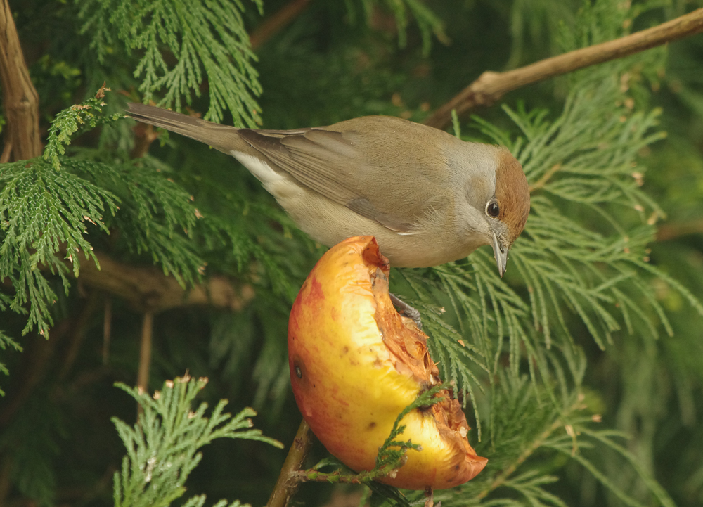 Obviously a female Blackcap feeding on apple. Oddly this winter, we have't had one male in the garden but a female on a dozen or so days. She is always attracted to apple and is seen, oddlu usually at the same time, between midday and 1 o'clock.