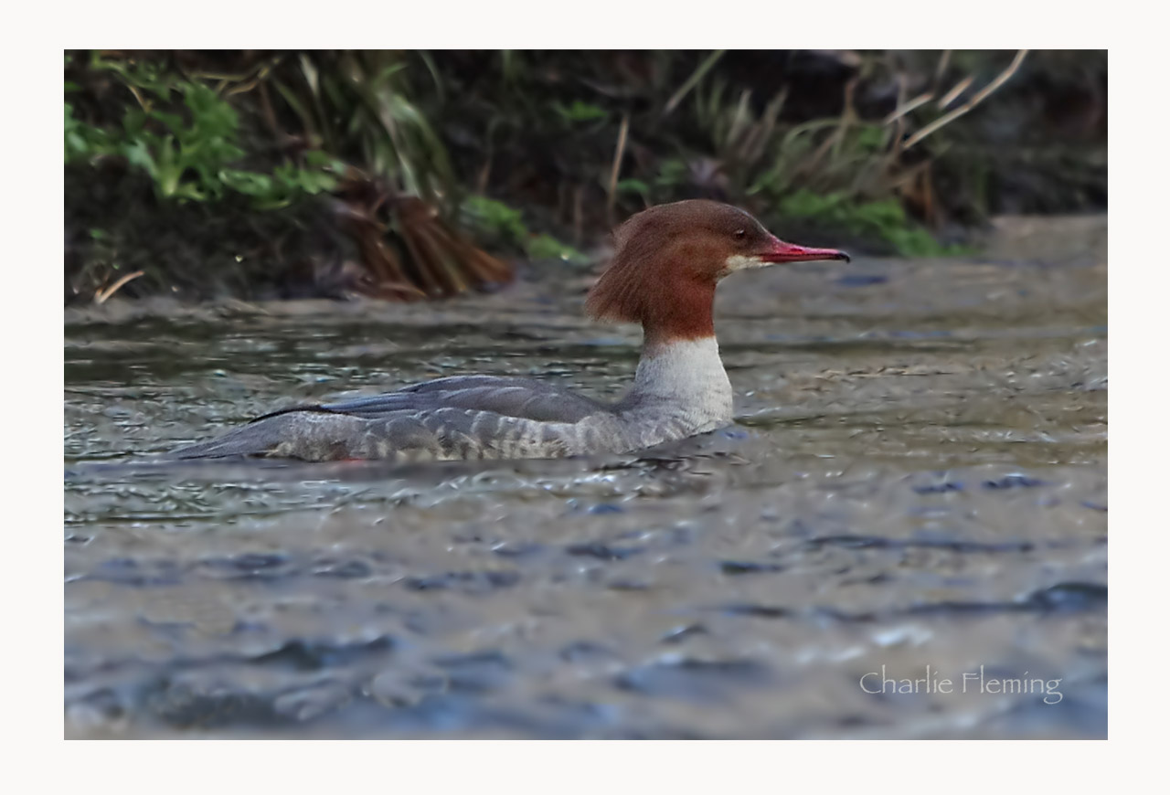 To my mind, taking photographs out in the countryside is as much about the experience of being there as getting the shot, and that's good because there are very long periods when hardly anything is seen at all. Then, suddenly the waiting becomes worthwhile. Take today for example. I was sitting in the river hide waiting for a Dipper to show. For more than an hour……. nothing except of course, a beautiful relaxing scene in front of me. If only you were able to see it, hear it, smell it, you would be able to feel the pleasure as I do. You don't really need wildlife, that's a bonus but when a truly wild creature shows it's self then it's very exciting and rewarding. Suddenly a flash of whiteness caught my eye from down stream, I had been waiting for Dippers to observe and photograph and my instant reaction was a Dippers white breast flashing in the light. But no, instantly I re-assessed my thoughts, it was a Goosander, a beautiful fish eating duck. It was't just an immaculate drake but his lovely mate as well. They bobbed around in the torrent moving down the riffles like experienced white-water kayakers and used the slower eddies near the bank to remain still. They were with me for just a minute or two and then the fast flow carried them out of my sight and that was the end of that encounter. A special one with a species that is very, very wary and had they been aware of me they would never have given me the chance of a photograph.