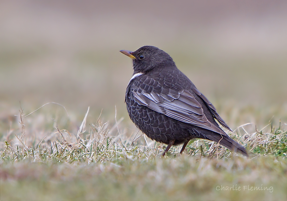 The Ring Ouzel has been an almost mystical bird for me over the last 50 years or so. I hadn't even seen one ever before today and I am glad to report that I was able to put that right. Not often a see a "Lifer" as the twitchers say. As is usual with this kind of thing it was as though there was nothing to it whatsoever and you would have thought that it was really normal and routine to see one. As soon as I parked the car and looked out over the meadow where it had been reported I could immediately see a Mistle Thrush and a Robin and there also, feeding just like a Blackbird, was the Ring Ouzel. My first impression was that it was really bulky and sligtly, if only a tiny bit bigger than it's cousin, (the Blackbird). It was feeding on the shorter areas of grass just like a Blackbird or Thrush would be when looking for garden worms. The bright white crescent on the breast shone out like a beacon. It scurried around, cocking it's head on to one side and then quickly pulled at the grass and roots to try and expose the worm or what have you, beneath. There were a couple of birders at the other end of the field and they immediately saw that I had it in my sights and they returned back towrds the car park and me. It seems that I was lucky after all and the bird had earlier been disturbed by children playing football and they hadn't been able to find it. I took loads of record shots but didn't want to walk towards it, that would have been bad form. In the end after the frustration of it being 50 yards away I just sat down with the camera low on the tripod and waited in the seemingly forlorn hope that it would walk towards me……. and it did. At last it was showing amazingly well and scurrying closer and closer to me. My luck was in but it was about to change! A family came through the lower gate and started to walk back to their car and the route that they had to take would bring them right up to the bird that was literally feeding on the short grass of the path that they were on. I cursed my luck at that pont but the bird got nearer still and I did manage some photos from very close. A small child, running ahead of the family party was the first to arrive and the bird flew up high and away to some tall trees to my right where it continued to curse noisily from the tree tops. It never did return to the ground and I rushed home to have a look at my pictures confident that I had at least got a new species for my Devon gallery.