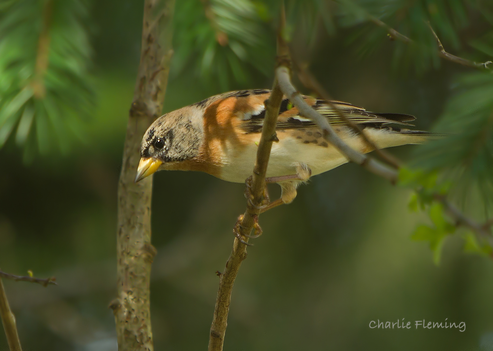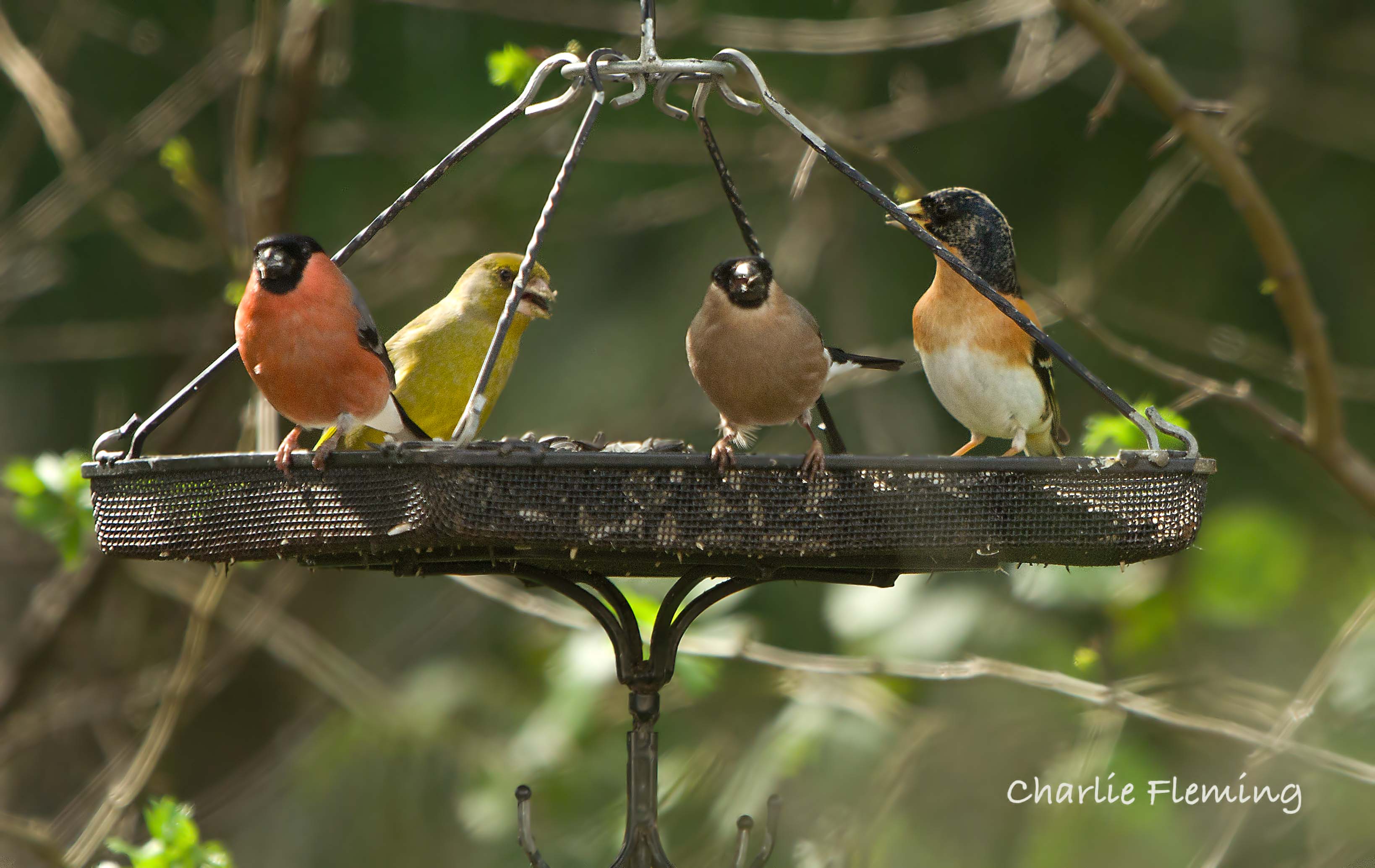 I would suggest that this photo is one of the most unusual possible. A male and female Bullfinch, a gorgeous Greenfinch and a spanking male Brambling in breeding plumage.