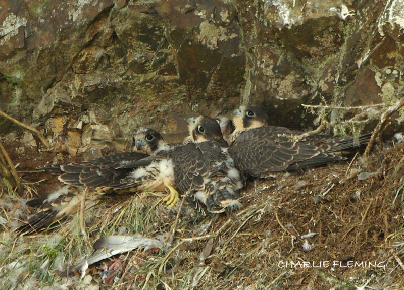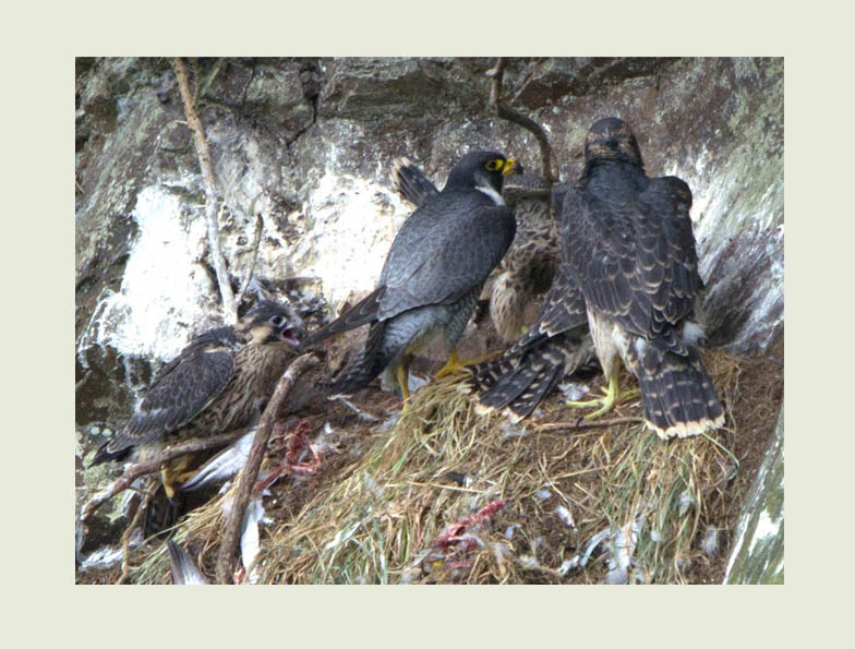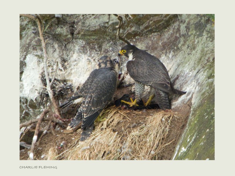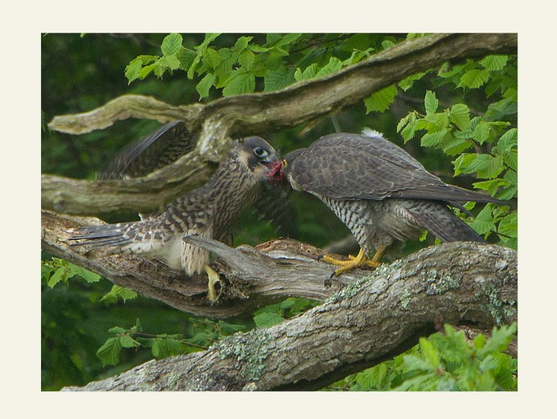The young peregrines are quite delicate feeders. In this photograph even though one bird is possession of prey the other bird is not aggressively trying to take it, allowing the other to feed quietly. As I subsequently watched these birds for countless hours, this has been quite an interesting example of behaviour. It could be that with a never ending supply of food, the birds do not need to compete too much.