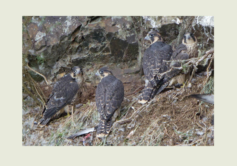 Here is a clear view of the four siblings. Peregrines lay up to four eggs so it is normal for there to be four chicks. Incubation starts when the last egg is laid so that all the chicks hatch on the same day. There is difference in size and development though, as you can see, some still have down protruding, this is probably due to females being larger than males.