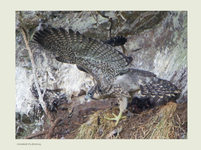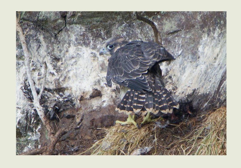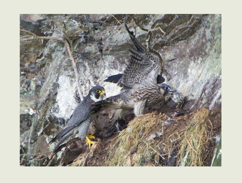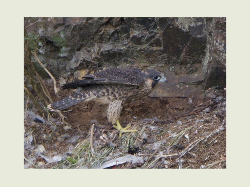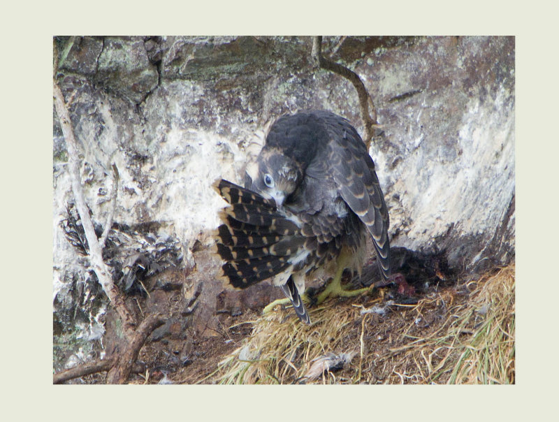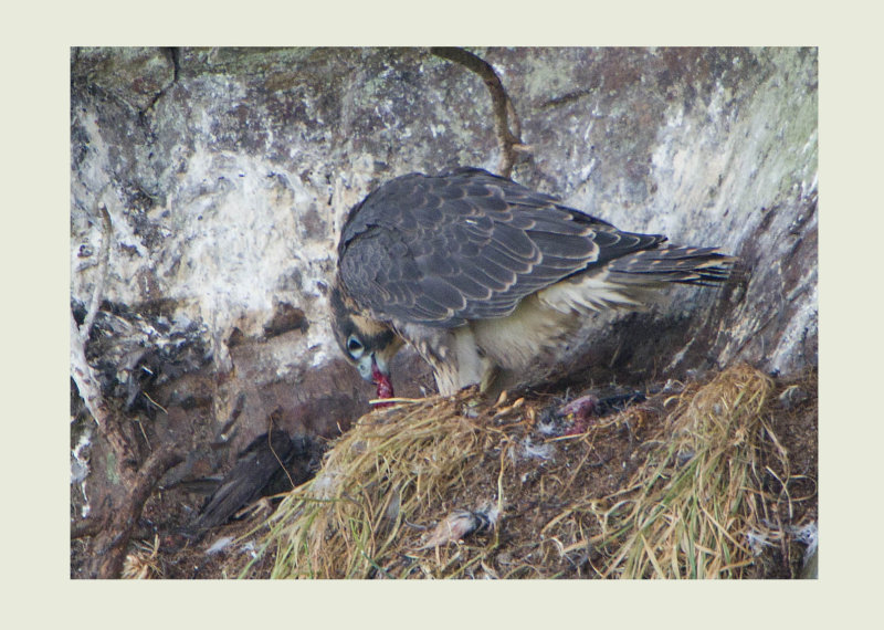 Behaviour by now had started to change with the young birds spending most of their time in a large bare Oak adjacent to the next ledge and the parents away, some 100 metres in a wood opposite where I can hear them from time to time. A lot of the behaviour of the young birds is very instinctive like this covering of prey which all birds of prey do. Having now taken possession of the prey item from the female, the young bird makes a statement that it his hers before starting to feed on it.